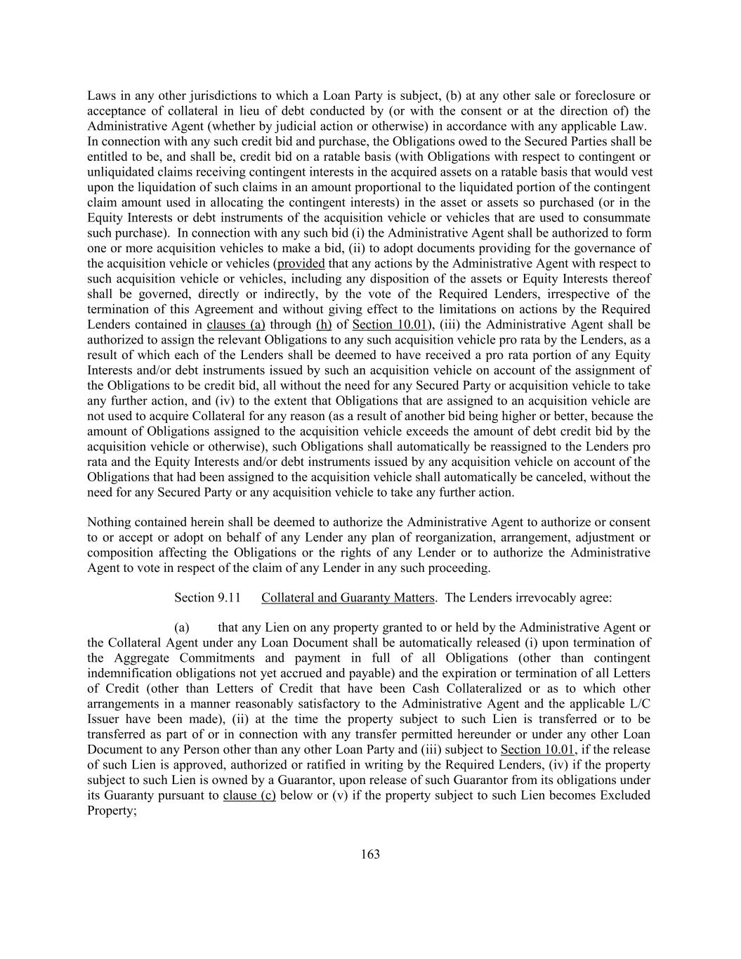 Laws in any other jurisdictions to which a Loan Party is subject, (b) at any other sale or foreclosure or acceptance of collateral in lieu of debt conducted by (or with the consent or at the direction of) the Administrative Agent (whether by judicial action or otherwise) in accordance with any applicable Law. In connection with any such credit bid and purchase, the Obligations owed to the Secured Parties shall be entitled to be, and shall be, credit bid on a ratable basis (with Obligations with respect to contingent or unliquidated claims receiving contingent interests in the acquired assets on a ratable basis that would vest upon the liquidation of such claims in an amount proportional to the liquidated portion of the contingent claim amount used in allocating the contingent interests) in the asset or assets so purchased (or in the Equity Interests or debt instruments of the acquisition vehicle or vehicles that are used to consummate such purchase). In connection with any such bid (i) the Administrative Agent shall be authorized to form one or more acquisition vehicles to make a bid, (ii) to adopt documents providing for the governance of the acquisition vehicle or vehicles (provided that any actions by the Administrative Agent with respect to such acquisition vehicle or vehicles, including any disposition of the assets or Equity Interests thereof shall be governed, directly or indirectly, by the vote of the Required Lenders, irrespective of the termination of this Agreement and without giving effect to the limitations on actions by the Required Lenders contained in clauses (a) through (h) of Section 10.01), (iii) the Administrative Agent shall be authorized to assign the relevant Obligations to any such acquisition vehicle pro rata by the Lenders, as a result of which each of the Lenders shall be deemed to have received a pro rata portion of any Equity Interests and/or debt instruments issued by such an acquisition vehicle on account of the assignment of the Obligations to be credit bid, all without the need for any Secured Party or acquisition vehicle to take any further action, and (iv) to the extent that Obligations that are assigned to an acquisition vehicle are not used to acquire Collateral for any reason (as a result of another bid being higher or better, because the amount of Obligations assigned to the acquisition vehicle exceeds the amount of debt credit bid by the acquisition vehicle or otherwise), such Obligations shall automatically be reassigned to the Lenders pro rata and the Equity Interests and/or debt instruments issued by any acquisition vehicle on account of the Obligations that had been assigned to the acquisition vehicle shall automatically be canceled, without the need for any Secured Party or any acquisition vehicle to take any further action. Nothing contained herein shall be deemed to authorize the Administrative Agent to authorize or consent to or accept or adopt on behalf of any Lender any plan of reorganization, arrangement, adjustment or composition affecting the Obligations or the rights of any Lender or to authorize the Administrative Agent to vote in respect of the claim of any Lender in any such proceeding. Section 9.11 Collateral and Guaranty Matters. The Lenders irrevocably agree: (a) that any Lien on any property granted to or held by the Administrative Agent or the Collateral Agent under any Loan Document shall be automatically released (i) upon termination of the Aggregate Commitments and payment in full of all Obligations (other than contingent indemnification obligations not yet accrued and payable) and the expiration or termination of all Letters of Credit (other than Letters of Credit that have been Cash Collateralized or as to which other arrangements in a manner reasonably satisfactory to the Administrative Agent and the applicable L/C Issuer have been made), (ii) at the time the property subject to such Lien is transferred or to be transferred as part of or in connection with any transfer permitted hereunder or under any other Loan Document to any Person other than any other Loan Party and (iii) subject to Section 10.01, if the release of such Lien is approved, authorized or ratified in writing by the Required Lenders, (iv) if the property subject to such Lien is owned by a Guarantor, upon release of such Guarantor from its obligations under its Guaranty pursuant to clause (c) below or (v) if the property subject to such Lien becomes Excluded Property; 163