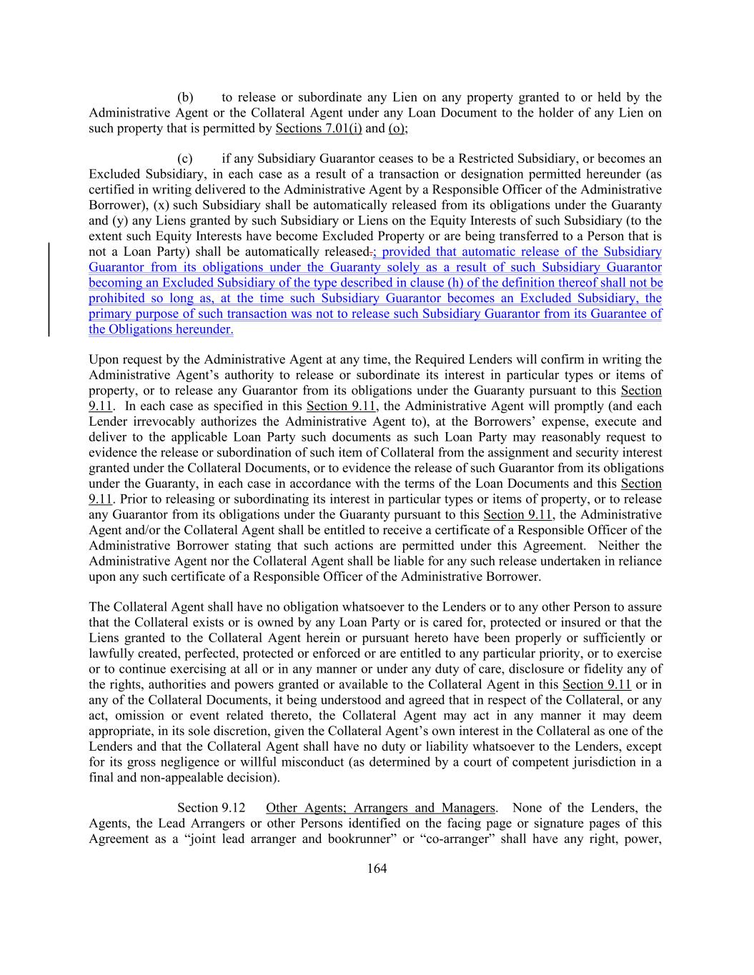 (b) to release or subordinate any Lien on any property granted to or held by the Administrative Agent or the Collateral Agent under any Loan Document to the holder of any Lien on such property that is permitted by Sections 7.01(i) and (o); (c) if any Subsidiary Guarantor ceases to be a Restricted Subsidiary, or becomes an Excluded Subsidiary, in each case as a result of a transaction or designation permitted hereunder (as certified in writing delivered to the Administrative Agent by a Responsible Officer of the Administrative Borrower), (x) such Subsidiary shall be automatically released from its obligations under the Guaranty and (y) any Liens granted by such Subsidiary or Liens on the Equity Interests of such Subsidiary (to the extent such Equity Interests have become Excluded Property or are being transferred to a Person that is not a Loan Party) shall be automatically released.; provided that automatic release of the Subsidiary Guarantor from its obligations under the Guaranty solely as a result of such Subsidiary Guarantor becoming an Excluded Subsidiary of the type described in clause (h) of the definition thereof shall not be prohibited so long as, at the time such Subsidiary Guarantor becomes an Excluded Subsidiary, the primary purpose of such transaction was not to release such Subsidiary Guarantor from its Guarantee of the Obligations hereunder. Upon request by the Administrative Agent at any time, the Required Lenders will confirm in writing the Administrative Agent’s authority to release or subordinate its interest in particular types or items of property, or to release any Guarantor from its obligations under the Guaranty pursuant to this Section 9.11. In each case as specified in this Section 9.11, the Administrative Agent will promptly (and each Lender irrevocably authorizes the Administrative Agent to), at the Borrowers’ expense, execute and deliver to the applicable Loan Party such documents as such Loan Party may reasonably request to evidence the release or subordination of such item of Collateral from the assignment and security interest granted under the Collateral Documents, or to evidence the release of such Guarantor from its obligations under the Guaranty, in each case in accordance with the terms of the Loan Documents and this Section 9.11. Prior to releasing or subordinating its interest in particular types or items of property, or to release any Guarantor from its obligations under the Guaranty pursuant to this Section 9.11, the Administrative Agent and/or the Collateral Agent shall be entitled to receive a certificate of a Responsible Officer of the Administrative Borrower stating that such actions are permitted under this Agreement. Neither the Administrative Agent nor the Collateral Agent shall be liable for any such release undertaken in reliance upon any such certificate of a Responsible Officer of the Administrative Borrower. The Collateral Agent shall have no obligation whatsoever to the Lenders or to any other Person to assure that the Collateral exists or is owned by any Loan Party or is cared for, protected or insured or that the Liens granted to the Collateral Agent herein or pursuant hereto have been properly or sufficiently or lawfully created, perfected, protected or enforced or are entitled to any particular priority, or to exercise or to continue exercising at all or in any manner or under any duty of care, disclosure or fidelity any of the rights, authorities and powers granted or available to the Collateral Agent in this Section 9.11 or in any of the Collateral Documents, it being understood and agreed that in respect of the Collateral, or any act, omission or event related thereto, the Collateral Agent may act in any manner it may deem appropriate, in its sole discretion, given the Collateral Agent’s own interest in the Collateral as one of the Lenders and that the Collateral Agent shall have no duty or liability whatsoever to the Lenders, except for its gross negligence or willful misconduct (as determined by a court of competent jurisdiction in a final and non-appealable decision). Section 9.12 Other Agents; Arrangers and Managers. None of the Lenders, the Agents, the Lead Arrangers or other Persons identified on the facing page or signature pages of this Agreement as a “joint lead arranger and bookrunner” or “co-arranger” shall have any right, power, 164