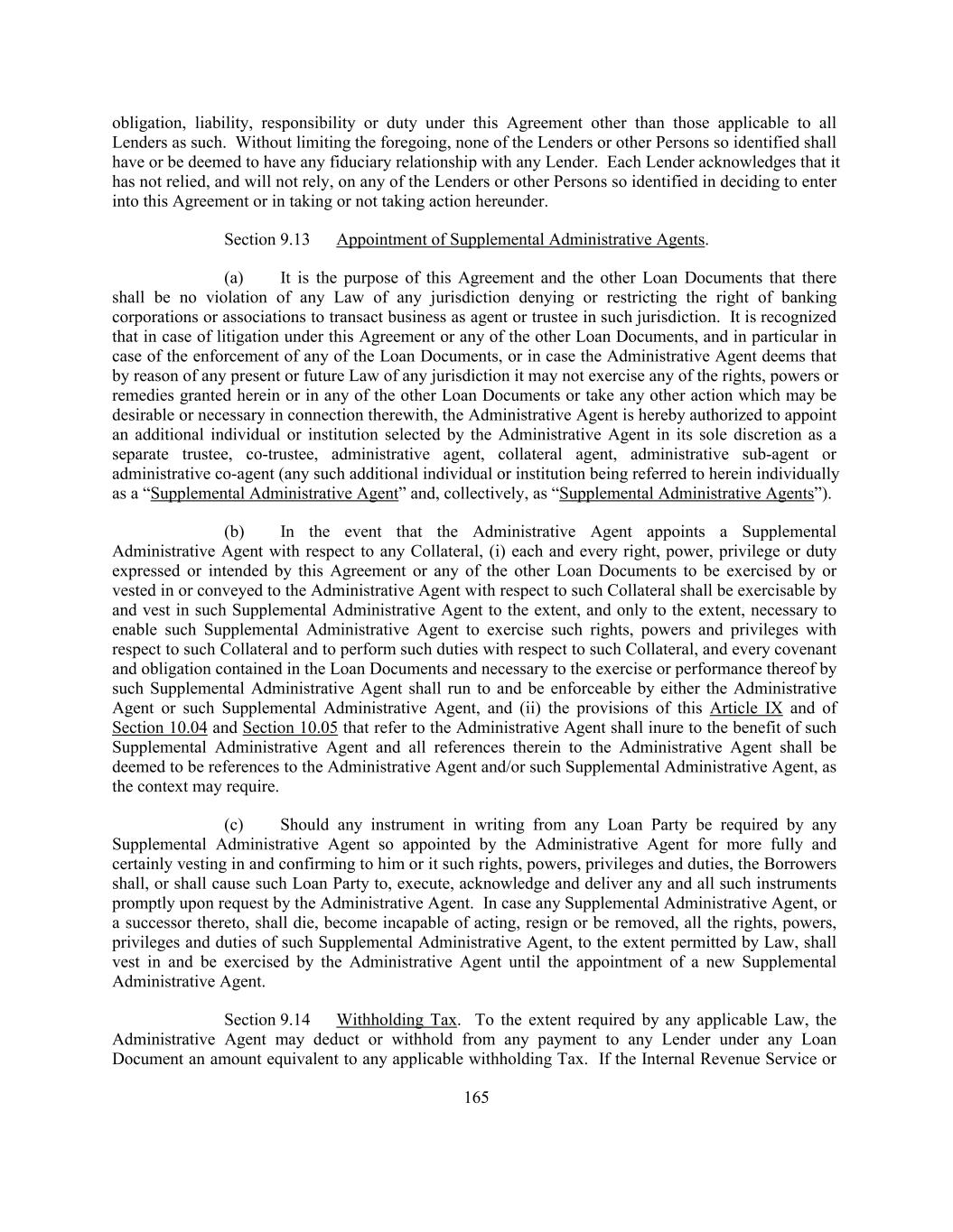 obligation, liability, responsibility or duty under this Agreement other than those applicable to all Lenders as such. Without limiting the foregoing, none of the Lenders or other Persons so identified shall have or be deemed to have any fiduciary relationship with any Lender. Each Lender acknowledges that it has not relied, and will not rely, on any of the Lenders or other Persons so identified in deciding to enter into this Agreement or in taking or not taking action hereunder. Section 9.13 Appointment of Supplemental Administrative Agents. (a) It is the purpose of this Agreement and the other Loan Documents that there shall be no violation of any Law of any jurisdiction denying or restricting the right of banking corporations or associations to transact business as agent or trustee in such jurisdiction. It is recognized that in case of litigation under this Agreement or any of the other Loan Documents, and in particular in case of the enforcement of any of the Loan Documents, or in case the Administrative Agent deems that by reason of any present or future Law of any jurisdiction it may not exercise any of the rights, powers or remedies granted herein or in any of the other Loan Documents or take any other action which may be desirable or necessary in connection therewith, the Administrative Agent is hereby authorized to appoint an additional individual or institution selected by the Administrative Agent in its sole discretion as a separate trustee, co-trustee, administrative agent, collateral agent, administrative sub-agent or administrative co-agent (any such additional individual or institution being referred to herein individually as a “Supplemental Administrative Agent” and, collectively, as “Supplemental Administrative Agents”). (b) In the event that the Administrative Agent appoints a Supplemental Administrative Agent with respect to any Collateral, (i) each and every right, power, privilege or duty expressed or intended by this Agreement or any of the other Loan Documents to be exercised by or vested in or conveyed to the Administrative Agent with respect to such Collateral shall be exercisable by and vest in such Supplemental Administrative Agent to the extent, and only to the extent, necessary to enable such Supplemental Administrative Agent to exercise such rights, powers and privileges with respect to such Collateral and to perform such duties with respect to such Collateral, and every covenant and obligation contained in the Loan Documents and necessary to the exercise or performance thereof by such Supplemental Administrative Agent shall run to and be enforceable by either the Administrative Agent or such Supplemental Administrative Agent, and (ii) the provisions of this Article IX and of Section 10.04 and Section 10.05 that refer to the Administrative Agent shall inure to the benefit of such Supplemental Administrative Agent and all references therein to the Administrative Agent shall be deemed to be references to the Administrative Agent and/or such Supplemental Administrative Agent, as the context may require. (c) Should any instrument in writing from any Loan Party be required by any Supplemental Administrative Agent so appointed by the Administrative Agent for more fully and certainly vesting in and confirming to him or it such rights, powers, privileges and duties, the Borrowers shall, or shall cause such Loan Party to, execute, acknowledge and deliver any and all such instruments promptly upon request by the Administrative Agent. In case any Supplemental Administrative Agent, or a successor thereto, shall die, become incapable of acting, resign or be removed, all the rights, powers, privileges and duties of such Supplemental Administrative Agent, to the extent permitted by Law, shall vest in and be exercised by the Administrative Agent until the appointment of a new Supplemental Administrative Agent. Section 9.14 Withholding Tax. To the extent required by any applicable Law, the Administrative Agent may deduct or withhold from any payment to any Lender under any Loan Document an amount equivalent to any applicable withholding Tax. If the Internal Revenue Service or 165