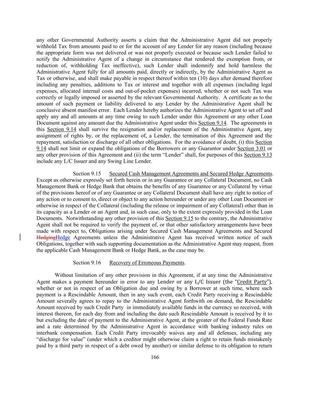 any other Governmental Authority asserts a claim that the Administrative Agent did not properly withhold Tax from amounts paid to or for the account of any Lender for any reason (including because the appropriate form was not delivered or was not properly executed or because such Lender failed to notify the Administrative Agent of a change in circumstance that rendered the exemption from, or reduction of, withholding Tax ineffective), such Lender shall indemnify and hold harmless the Administrative Agent fully for all amounts paid, directly or indirectly, by the Administrative Agent as Tax or otherwise, and shall make payable in respect thereof within ten (10) days after demand therefore including any penalties, additions to Tax or interest and together with all expenses (including legal expenses, allocated internal costs and out-of-pocket expenses) incurred, whether or not such Tax was correctly or legally imposed or asserted by the relevant Governmental Authority. A certificate as to the amount of such payment or liability delivered to any Lender by the Administrative Agent shall be conclusive absent manifest error. Each Lender hereby authorizes the Administrative Agent to set off and apply any and all amounts at any time owing to such Lender under this Agreement or any other Loan Document against any amount due the Administrative Agent under this Section 9.14. The agreements in this Section 9.14 shall survive the resignation and/or replacement of the Administrative Agent, any assignment of rights by, or the replacement of, a Lender, the termination of this Agreement and the repayment, satisfaction or discharge of all other obligations. For the avoidance of doubt, (i) this Section 9.14 shall not limit or expand the obligations of the Borrowers or any Guarantor under Section 3.01 or any other provision of this Agreement and (ii) the term “Lender” shall, for purposes of this Section 9.13 include any L/C Issuer and any Swing Line Lender. Section 9.15 Secured Cash Management Agreements and Secured Hedge Agreements. Except as otherwise expressly set forth herein or in any Guarantee or any Collateral Document, no Cash Management Bank or Hedge Bank that obtains the benefits of any Guarantee or any Collateral by virtue of the provisions hereof or of any Guarantee or any Collateral Document shall have any right to notice of any action or to consent to, direct or object to any action hereunder or under any other Loan Document or otherwise in respect of the Collateral (including the release or impairment of any Collateral) other than in its capacity as a Lender or an Agent and, in such case, only to the extent expressly provided in the Loan Documents. Notwithstanding any other provision of this Section 9.15 to the contrary, the Administrative Agent shall not be required to verify the payment of, or that other satisfactory arrangements have been made with respect to, Obligations arising under Secured Cash Management Agreements and Secured HedgingHedge Agreements unless the Administrative Agent has received written notice of such Obligations, together with such supporting documentation as the Administrative Agent may request, from the applicable Cash Management Bank or Hedge Bank, as the case may be. Section 9.16 Recovery of Erroneous Payments. Without limitation of any other provision in this Agreement, if at any time the Administrative Agent makes a payment hereunder in error to any Lender or any L/C Issuer (the “Credit Party”), whether or not in respect of an Obligation due and owing by a Borrower at such time, where such payment is a Rescindable Amount, then in any such event, each Credit Party receiving a Rescindable Amount severally agrees to repay to the Administrative Agent forthwith on demand, the Rescindable Amount received by such Credit Party in immediately available funds in the currency so received, with interest thereon, for each day from and including the date such Rescindable Amount is received by it to but excluding the date of payment to the Administrative Agent, at the greater of the Federal Funds Rate and a rate determined by the Administrative Agent in accordance with banking industry rules on interbank compensation. Each Credit Party irrevocably waives any and all defenses, including any “discharge for value” (under which a creditor might otherwise claim a right to retain funds mistakenly paid by a third party in respect of a debt owed by another) or similar defense to its obligation to return 166