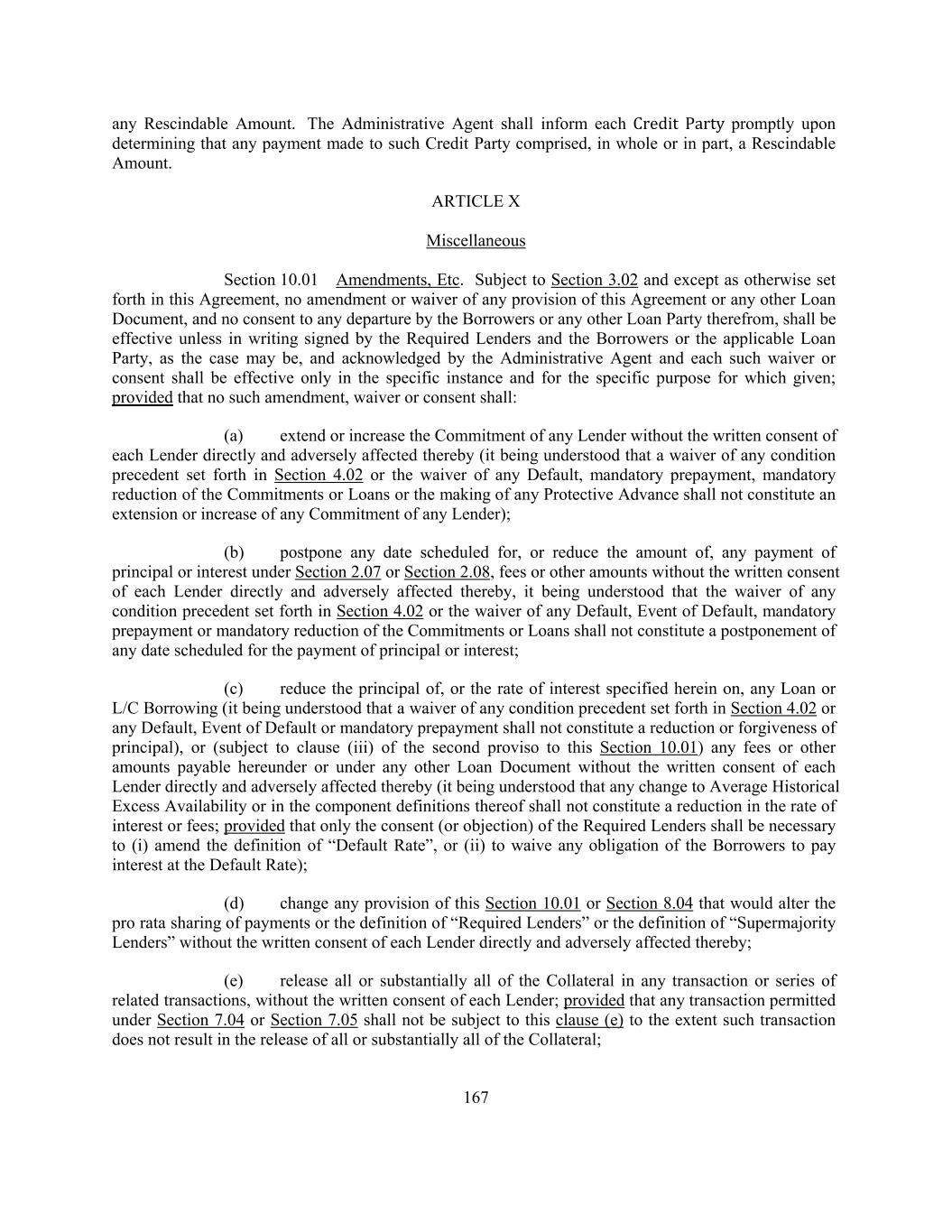 any Rescindable Amount. The Administrative Agent shall inform each Credit Party promptly upon determining that any payment made to such Credit Party comprised, in whole or in part, a Rescindable Amount. ARTICLE X Miscellaneous Section 10.01 Amendments, Etc. Subject to Section 3.02 and except as otherwise set forth in this Agreement, no amendment or waiver of any provision of this Agreement or any other Loan Document, and no consent to any departure by the Borrowers or any other Loan Party therefrom, shall be effective unless in writing signed by the Required Lenders and the Borrowers or the applicable Loan Party, as the case may be, and acknowledged by the Administrative Agent and each such waiver or consent shall be effective only in the specific instance and for the specific purpose for which given; provided that no such amendment, waiver or consent shall: (a) extend or increase the Commitment of any Lender without the written consent of each Lender directly and adversely affected thereby (it being understood that a waiver of any condition precedent set forth in Section 4.02 or the waiver of any Default, mandatory prepayment, mandatory reduction of the Commitments or Loans or the making of any Protective Advance shall not constitute an extension or increase of any Commitment of any Lender); (b) postpone any date scheduled for, or reduce the amount of, any payment of principal or interest under Section 2.07 or Section 2.08, fees or other amounts without the written consent of each Lender directly and adversely affected thereby, it being understood that the waiver of any condition precedent set forth in Section 4.02 or the waiver of any Default, Event of Default, mandatory prepayment or mandatory reduction of the Commitments or Loans shall not constitute a postponement of any date scheduled for the payment of principal or interest; (c) reduce the principal of, or the rate of interest specified herein on, any Loan or L/C Borrowing (it being understood that a waiver of any condition precedent set forth in Section 4.02 or any Default, Event of Default or mandatory prepayment shall not constitute a reduction or forgiveness of principal), or (subject to clause (iii) of the second proviso to this Section 10.01) any fees or other amounts payable hereunder or under any other Loan Document without the written consent of each Lender directly and adversely affected thereby (it being understood that any change to Average Historical Excess Availability or in the component definitions thereof shall not constitute a reduction in the rate of interest or fees; provided that only the consent (or objection) of the Required Lenders shall be necessary to (i) amend the definition of “Default Rate”, or (ii) to waive any obligation of the Borrowers to pay interest at the Default Rate); (d) change any provision of this Section 10.01 or Section 8.04 that would alter the pro rata sharing of payments or the definition of “Required Lenders” or the definition of “Supermajority Lenders” without the written consent of each Lender directly and adversely affected thereby; (e) release all or substantially all of the Collateral in any transaction or series of related transactions, without the written consent of each Lender; provided that any transaction permitted under Section 7.04 or Section 7.05 shall not be subject to this clause (e) to the extent such transaction does not result in the release of all or substantially all of the Collateral; 167