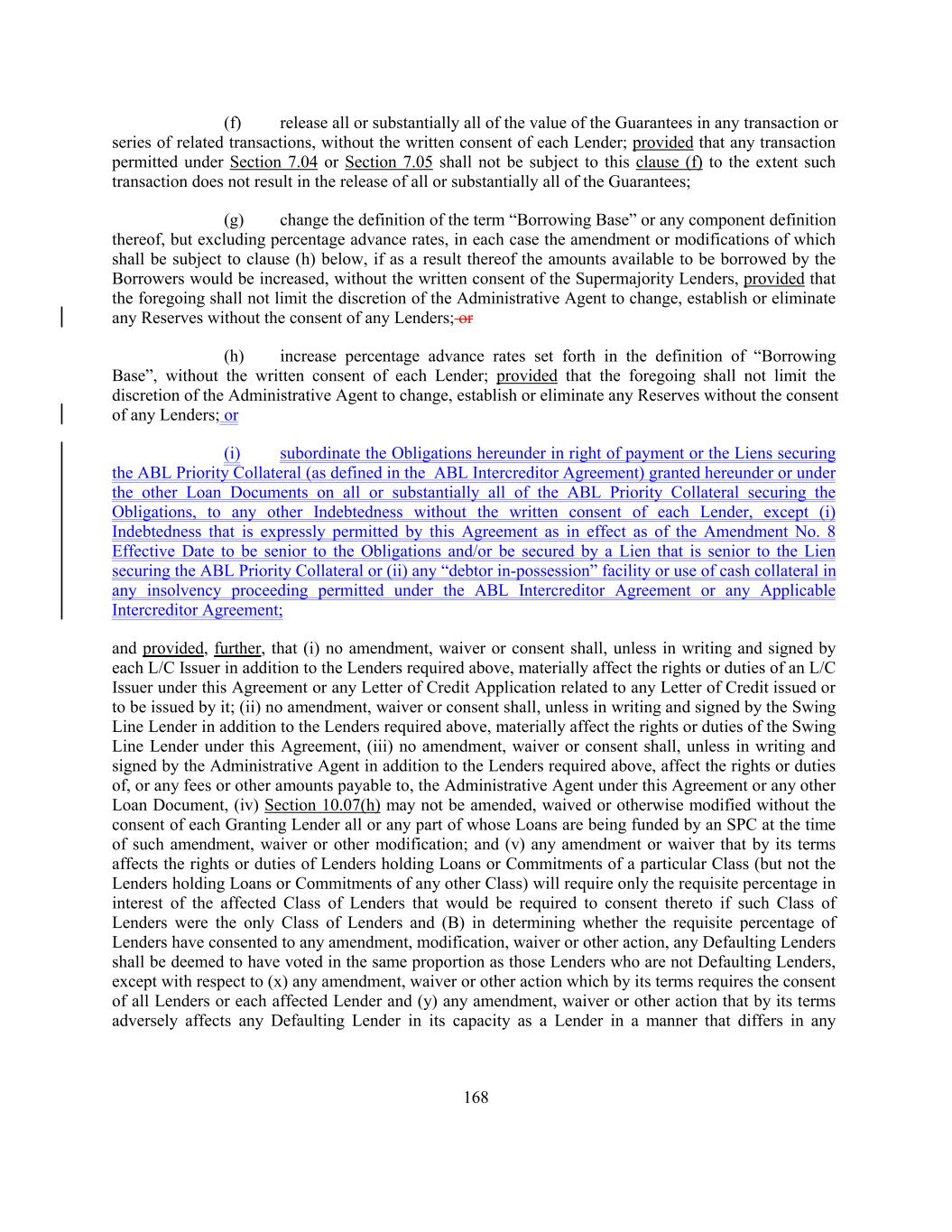 (f) release all or substantially all of the value of the Guarantees in any transaction or series of related transactions, without the written consent of each Lender; provided that any transaction permitted under Section 7.04 or Section 7.05 shall not be subject to this clause (f) to the extent such transaction does not result in the release of all or substantially all of the Guarantees; (g) change the definition of the term “Borrowing Base” or any component definition thereof, but excluding percentage advance rates, in each case the amendment or modifications of which shall be subject to clause (h) below, if as a result thereof the amounts available to be borrowed by the Borrowers would be increased, without the written consent of the Supermajority Lenders, provided that the foregoing shall not limit the discretion of the Administrative Agent to change, establish or eliminate any Reserves without the consent of any Lenders; or (h) increase percentage advance rates set forth in the definition of “Borrowing Base”, without the written consent of each Lender; provided that the foregoing shall not limit the discretion of the Administrative Agent to change, establish or eliminate any Reserves without the consent of any Lenders; or (i) subordinate the Obligations hereunder in right of payment or the Liens securing the ABL Priority Collateral (as defined in the ABL Intercreditor Agreement) granted hereunder or under the other Loan Documents on all or substantially all of the ABL Priority Collateral securing the Obligations, to any other Indebtedness without the written consent of each Lender, except (i) Indebtedness that is expressly permitted by this Agreement as in effect as of the Amendment No. 8 Effective Date to be senior to the Obligations and/or be secured by a Lien that is senior to the Lien securing the ABL Priority Collateral or (ii) any “debtor in-possession” facility or use of cash collateral in any insolvency proceeding permitted under the ABL Intercreditor Agreement or any Applicable Intercreditor Agreement; and provided, further, that (i) no amendment, waiver or consent shall, unless in writing and signed by each L/C Issuer in addition to the Lenders required above, materially affect the rights or duties of an L/C Issuer under this Agreement or any Letter of Credit Application related to any Letter of Credit issued or to be issued by it; (ii) no amendment, waiver or consent shall, unless in writing and signed by the Swing Line Lender in addition to the Lenders required above, materially affect the rights or duties of the Swing Line Lender under this Agreement, (iii) no amendment, waiver or consent shall, unless in writing and signed by the Administrative Agent in addition to the Lenders required above, affect the rights or duties of, or any fees or other amounts payable to, the Administrative Agent under this Agreement or any other Loan Document, (iv) Section 10.07(h) may not be amended, waived or otherwise modified without the consent of each Granting Lender all or any part of whose Loans are being funded by an SPC at the time of such amendment, waiver or other modification; and (v) any amendment or waiver that by its terms affects the rights or duties of Lenders holding Loans or Commitments of a particular Class (but not the Lenders holding Loans or Commitments of any other Class) will require only the requisite percentage in interest of the affected Class of Lenders that would be required to consent thereto if such Class of Lenders were the only Class of Lenders and (B) in determining whether the requisite percentage of Lenders have consented to any amendment, modification, waiver or other action, any Defaulting Lenders shall be deemed to have voted in the same proportion as those Lenders who are not Defaulting Lenders, except with respect to (x) any amendment, waiver or other action which by its terms requires the consent of all Lenders or each affected Lender and (y) any amendment, waiver or other action that by its terms adversely affects any Defaulting Lender in its capacity as a Lender in a manner that differs in any 168