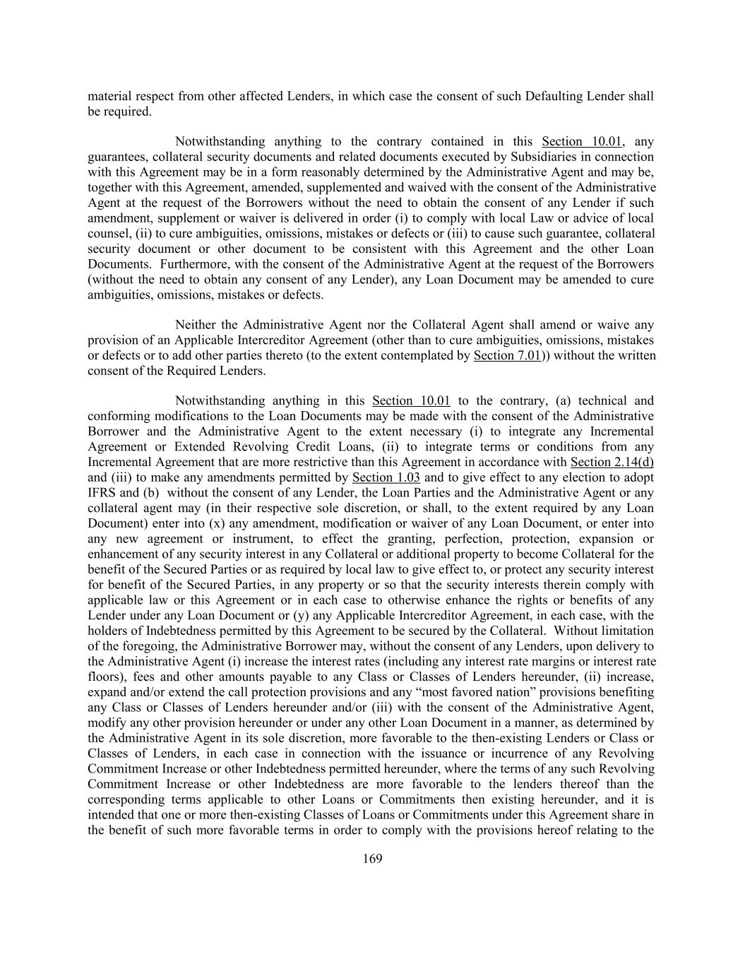 material respect from other affected Lenders, in which case the consent of such Defaulting Lender shall be required. Notwithstanding anything to the contrary contained in this Section 10.01, any guarantees, collateral security documents and related documents executed by Subsidiaries in connection with this Agreement may be in a form reasonably determined by the Administrative Agent and may be, together with this Agreement, amended, supplemented and waived with the consent of the Administrative Agent at the request of the Borrowers without the need to obtain the consent of any Lender if such amendment, supplement or waiver is delivered in order (i) to comply with local Law or advice of local counsel, (ii) to cure ambiguities, omissions, mistakes or defects or (iii) to cause such guarantee, collateral security document or other document to be consistent with this Agreement and the other Loan Documents. Furthermore, with the consent of the Administrative Agent at the request of the Borrowers (without the need to obtain any consent of any Lender), any Loan Document may be amended to cure ambiguities, omissions, mistakes or defects. Neither the Administrative Agent nor the Collateral Agent shall amend or waive any provision of an Applicable Intercreditor Agreement (other than to cure ambiguities, omissions, mistakes or defects or to add other parties thereto (to the extent contemplated by Section 7.01)) without the written consent of the Required Lenders. Notwithstanding anything in this Section 10.01 to the contrary, (a) technical and conforming modifications to the Loan Documents may be made with the consent of the Administrative Borrower and the Administrative Agent to the extent necessary (i) to integrate any Incremental Agreement or Extended Revolving Credit Loans, (ii) to integrate terms or conditions from any Incremental Agreement that are more restrictive than this Agreement in accordance with Section 2.14(d) and (iii) to make any amendments permitted by Section 1.03 and to give effect to any election to adopt IFRS and (b) without the consent of any Lender, the Loan Parties and the Administrative Agent or any collateral agent may (in their respective sole discretion, or shall, to the extent required by any Loan Document) enter into (x) any amendment, modification or waiver of any Loan Document, or enter into any new agreement or instrument, to effect the granting, perfection, protection, expansion or enhancement of any security interest in any Collateral or additional property to become Collateral for the benefit of the Secured Parties or as required by local law to give effect to, or protect any security interest for benefit of the Secured Parties, in any property or so that the security interests therein comply with applicable law or this Agreement or in each case to otherwise enhance the rights or benefits of any Lender under any Loan Document or (y) any Applicable Intercreditor Agreement, in each case, with the holders of Indebtedness permitted by this Agreement to be secured by the Collateral. Without limitation of the foregoing, the Administrative Borrower may, without the consent of any Lenders, upon delivery to the Administrative Agent (i) increase the interest rates (including any interest rate margins or interest rate floors), fees and other amounts payable to any Class or Classes of Lenders hereunder, (ii) increase, expand and/or extend the call protection provisions and any “most favored nation” provisions benefiting any Class or Classes of Lenders hereunder and/or (iii) with the consent of the Administrative Agent, modify any other provision hereunder or under any other Loan Document in a manner, as determined by the Administrative Agent in its sole discretion, more favorable to the then-existing Lenders or Class or Classes of Lenders, in each case in connection with the issuance or incurrence of any Revolving Commitment Increase or other Indebtedness permitted hereunder, where the terms of any such Revolving Commitment Increase or other Indebtedness are more favorable to the lenders thereof than the corresponding terms applicable to other Loans or Commitments then existing hereunder, and it is intended that one or more then-existing Classes of Loans or Commitments under this Agreement share in the benefit of such more favorable terms in order to comply with the provisions hereof relating to the 169