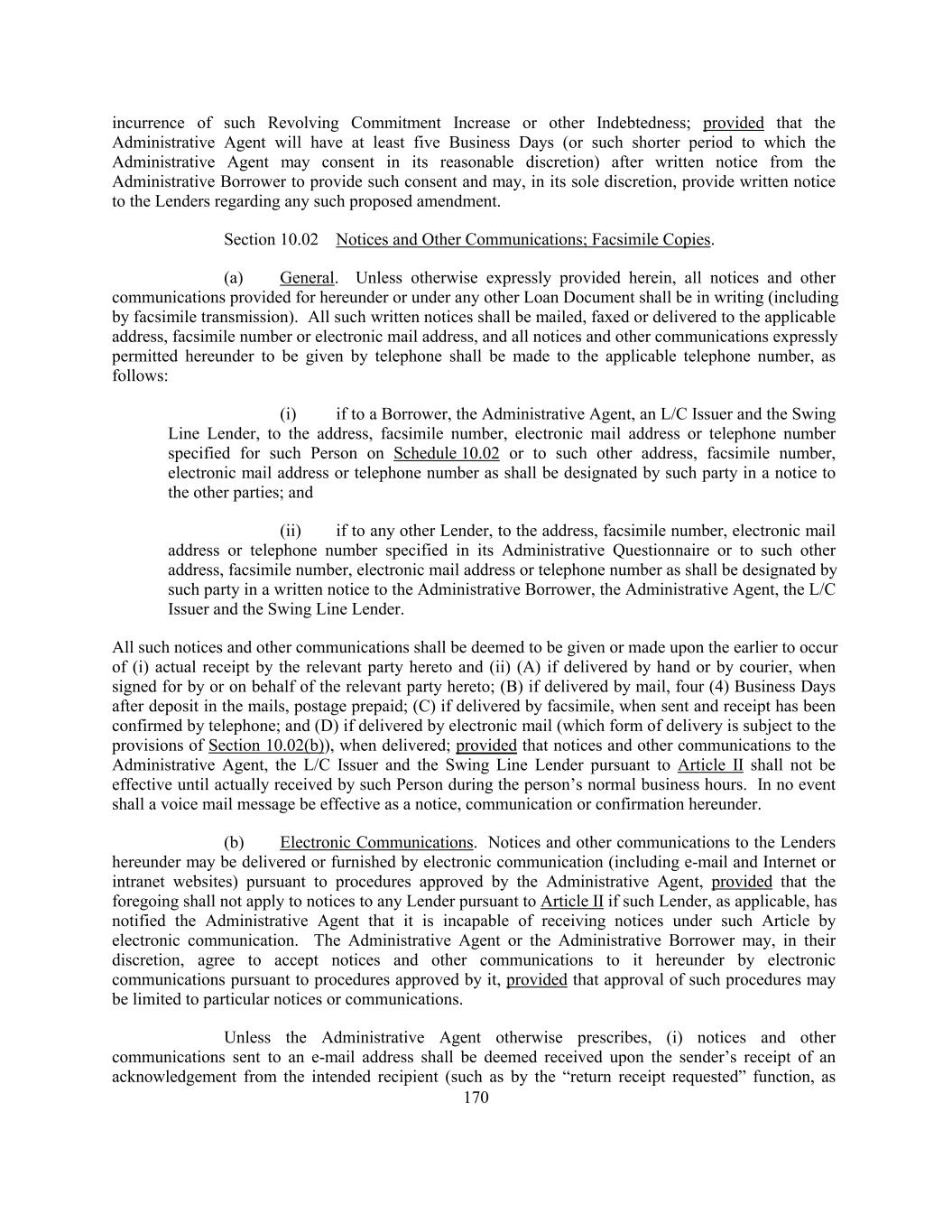 incurrence of such Revolving Commitment Increase or other Indebtedness; provided that the Administrative Agent will have at least five Business Days (or such shorter period to which the Administrative Agent may consent in its reasonable discretion) after written notice from the Administrative Borrower to provide such consent and may, in its sole discretion, provide written notice to the Lenders regarding any such proposed amendment. Section 10.02 Notices and Other Communications; Facsimile Copies. (a) General. Unless otherwise expressly provided herein, all notices and other communications provided for hereunder or under any other Loan Document shall be in writing (including by facsimile transmission). All such written notices shall be mailed, faxed or delivered to the applicable address, facsimile number or electronic mail address, and all notices and other communications expressly permitted hereunder to be given by telephone shall be made to the applicable telephone number, as follows: (i) if to a Borrower, the Administrative Agent, an L/C Issuer and the Swing Line Lender, to the address, facsimile number, electronic mail address or telephone number specified for such Person on Schedule 10.02 or to such other address, facsimile number, electronic mail address or telephone number as shall be designated by such party in a notice to the other parties; and (ii) if to any other Lender, to the address, facsimile number, electronic mail address or telephone number specified in its Administrative Questionnaire or to such other address, facsimile number, electronic mail address or telephone number as shall be designated by such party in a written notice to the Administrative Borrower, the Administrative Agent, the L/C Issuer and the Swing Line Lender. All such notices and other communications shall be deemed to be given or made upon the earlier to occur of (i) actual receipt by the relevant party hereto and (ii) (A) if delivered by hand or by courier, when signed for by or on behalf of the relevant party hereto; (B) if delivered by mail, four (4) Business Days after deposit in the mails, postage prepaid; (C) if delivered by facsimile, when sent and receipt has been confirmed by telephone; and (D) if delivered by electronic mail (which form of delivery is subject to the provisions of Section 10.02(b)), when delivered; provided that notices and other communications to the Administrative Agent, the L/C Issuer and the Swing Line Lender pursuant to Article II shall not be effective until actually received by such Person during the person’s normal business hours. In no event shall a voice mail message be effective as a notice, communication or confirmation hereunder. (b) Electronic Communications. Notices and other communications to the Lenders hereunder may be delivered or furnished by electronic communication (including e-mail and Internet or intranet websites) pursuant to procedures approved by the Administrative Agent, provided that the foregoing shall not apply to notices to any Lender pursuant to Article II if such Lender, as applicable, has notified the Administrative Agent that it is incapable of receiving notices under such Article by electronic communication. The Administrative Agent or the Administrative Borrower may, in their discretion, agree to accept notices and other communications to it hereunder by electronic communications pursuant to procedures approved by it, provided that approval of such procedures may be limited to particular notices or communications. Unless the Administrative Agent otherwise prescribes, (i) notices and other communications sent to an e-mail address shall be deemed received upon the sender’s receipt of an acknowledgement from the intended recipient (such as by the “return receipt requested” function, as 170
