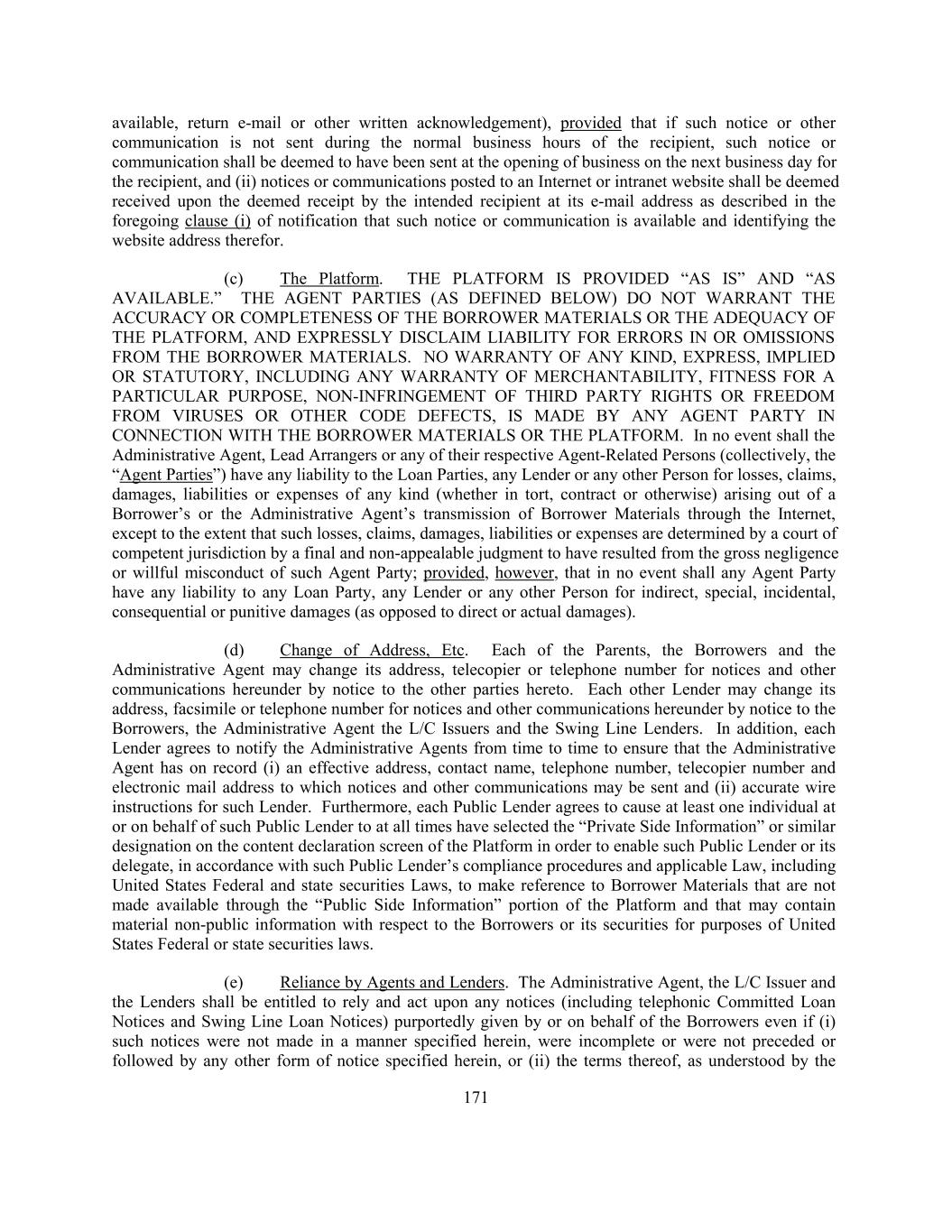 available, return e-mail or other written acknowledgement), provided that if such notice or other communication is not sent during the normal business hours of the recipient, such notice or communication shall be deemed to have been sent at the opening of business on the next business day for the recipient, and (ii) notices or communications posted to an Internet or intranet website shall be deemed received upon the deemed receipt by the intended recipient at its e-mail address as described in the foregoing clause (i) of notification that such notice or communication is available and identifying the website address therefor. (c) The Platform. THE PLATFORM IS PROVIDED “AS IS” AND “AS AVAILABLE.” THE AGENT PARTIES (AS DEFINED BELOW) DO NOT WARRANT THE ACCURACY OR COMPLETENESS OF THE BORROWER MATERIALS OR THE ADEQUACY OF THE PLATFORM, AND EXPRESSLY DISCLAIM LIABILITY FOR ERRORS IN OR OMISSIONS FROM THE BORROWER MATERIALS. NO WARRANTY OF ANY KIND, EXPRESS, IMPLIED OR STATUTORY, INCLUDING ANY WARRANTY OF MERCHANTABILITY, FITNESS FOR A PARTICULAR PURPOSE, NON-INFRINGEMENT OF THIRD PARTY RIGHTS OR FREEDOM FROM VIRUSES OR OTHER CODE DEFECTS, IS MADE BY ANY AGENT PARTY IN CONNECTION WITH THE BORROWER MATERIALS OR THE PLATFORM. In no event shall the Administrative Agent, Lead Arrangers or any of their respective Agent-Related Persons (collectively, the “Agent Parties”) have any liability to the Loan Parties, any Lender or any other Person for losses, claims, damages, liabilities or expenses of any kind (whether in tort, contract or otherwise) arising out of a Borrower’s or the Administrative Agent’s transmission of Borrower Materials through the Internet, except to the extent that such losses, claims, damages, liabilities or expenses are determined by a court of competent jurisdiction by a final and non-appealable judgment to have resulted from the gross negligence or willful misconduct of such Agent Party; provided, however, that in no event shall any Agent Party have any liability to any Loan Party, any Lender or any other Person for indirect, special, incidental, consequential or punitive damages (as opposed to direct or actual damages). (d) Change of Address, Etc. Each of the Parents, the Borrowers and the Administrative Agent may change its address, telecopier or telephone number for notices and other communications hereunder by notice to the other parties hereto. Each other Lender may change its address, facsimile or telephone number for notices and other communications hereunder by notice to the Borrowers, the Administrative Agent the L/C Issuers and the Swing Line Lenders. In addition, each Lender agrees to notify the Administrative Agents from time to time to ensure that the Administrative Agent has on record (i) an effective address, contact name, telephone number, telecopier number and electronic mail address to which notices and other communications may be sent and (ii) accurate wire instructions for such Lender. Furthermore, each Public Lender agrees to cause at least one individual at or on behalf of such Public Lender to at all times have selected the “Private Side Information” or similar designation on the content declaration screen of the Platform in order to enable such Public Lender or its delegate, in accordance with such Public Lender’s compliance procedures and applicable Law, including United States Federal and state securities Laws, to make reference to Borrower Materials that are not made available through the “Public Side Information” portion of the Platform and that may contain material non-public information with respect to the Borrowers or its securities for purposes of United States Federal or state securities laws. (e) Reliance by Agents and Lenders. The Administrative Agent, the L/C Issuer and the Lenders shall be entitled to rely and act upon any notices (including telephonic Committed Loan Notices and Swing Line Loan Notices) purportedly given by or on behalf of the Borrowers even if (i) such notices were not made in a manner specified herein, were incomplete or were not preceded or followed by any other form of notice specified herein, or (ii) the terms thereof, as understood by the 171