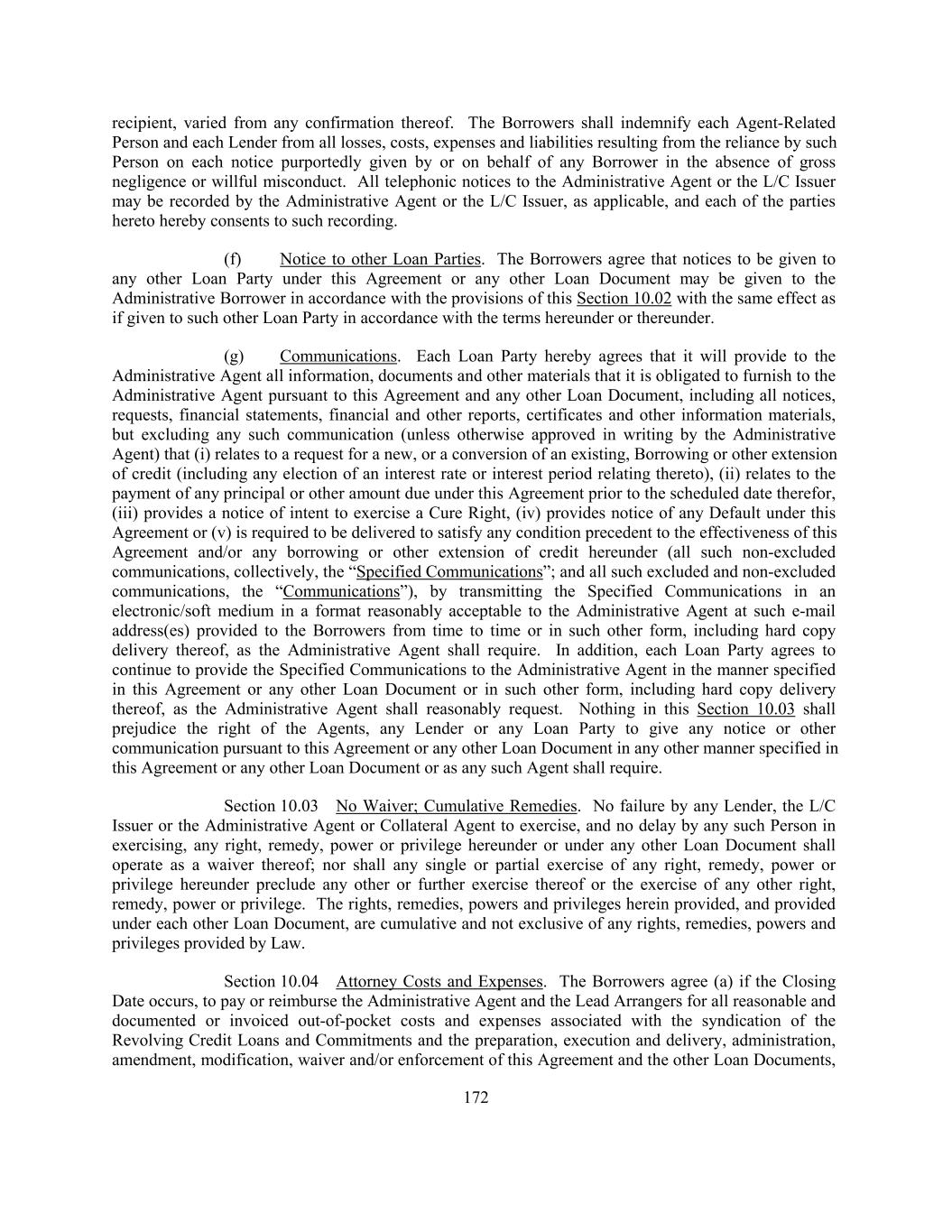 recipient, varied from any confirmation thereof. The Borrowers shall indemnify each Agent-Related Person and each Lender from all losses, costs, expenses and liabilities resulting from the reliance by such Person on each notice purportedly given by or on behalf of any Borrower in the absence of gross negligence or willful misconduct. All telephonic notices to the Administrative Agent or the L/C Issuer may be recorded by the Administrative Agent or the L/C Issuer, as applicable, and each of the parties hereto hereby consents to such recording. (f) Notice to other Loan Parties. The Borrowers agree that notices to be given to any other Loan Party under this Agreement or any other Loan Document may be given to the Administrative Borrower in accordance with the provisions of this Section 10.02 with the same effect as if given to such other Loan Party in accordance with the terms hereunder or thereunder. (g) Communications. Each Loan Party hereby agrees that it will provide to the Administrative Agent all information, documents and other materials that it is obligated to furnish to the Administrative Agent pursuant to this Agreement and any other Loan Document, including all notices, requests, financial statements, financial and other reports, certificates and other information materials, but excluding any such communication (unless otherwise approved in writing by the Administrative Agent) that (i) relates to a request for a new, or a conversion of an existing, Borrowing or other extension of credit (including any election of an interest rate or interest period relating thereto), (ii) relates to the payment of any principal or other amount due under this Agreement prior to the scheduled date therefor, (iii) provides a notice of intent to exercise a Cure Right, (iv) provides notice of any Default under this Agreement or (v) is required to be delivered to satisfy any condition precedent to the effectiveness of this Agreement and/or any borrowing or other extension of credit hereunder (all such non-excluded communications, collectively, the “Specified Communications”; and all such excluded and non-excluded communications, the “Communications”), by transmitting the Specified Communications in an electronic/soft medium in a format reasonably acceptable to the Administrative Agent at such e-mail address(es) provided to the Borrowers from time to time or in such other form, including hard copy delivery thereof, as the Administrative Agent shall require. In addition, each Loan Party agrees to continue to provide the Specified Communications to the Administrative Agent in the manner specified in this Agreement or any other Loan Document or in such other form, including hard copy delivery thereof, as the Administrative Agent shall reasonably request. Nothing in this Section 10.03 shall prejudice the right of the Agents, any Lender or any Loan Party to give any notice or other communication pursuant to this Agreement or any other Loan Document in any other manner specified in this Agreement or any other Loan Document or as any such Agent shall require. Section 10.03 No Waiver; Cumulative Remedies. No failure by any Lender, the L/C Issuer or the Administrative Agent or Collateral Agent to exercise, and no delay by any such Person in exercising, any right, remedy, power or privilege hereunder or under any other Loan Document shall operate as a waiver thereof; nor shall any single or partial exercise of any right, remedy, power or privilege hereunder preclude any other or further exercise thereof or the exercise of any other right, remedy, power or privilege. The rights, remedies, powers and privileges herein provided, and provided under each other Loan Document, are cumulative and not exclusive of any rights, remedies, powers and privileges provided by Law. Section 10.04 Attorney Costs and Expenses. The Borrowers agree (a) if the Closing Date occurs, to pay or reimburse the Administrative Agent and the Lead Arrangers for all reasonable and documented or invoiced out-of-pocket costs and expenses associated with the syndication of the Revolving Credit Loans and Commitments and the preparation, execution and delivery, administration, amendment, modification, waiver and/or enforcement of this Agreement and the other Loan Documents, 172