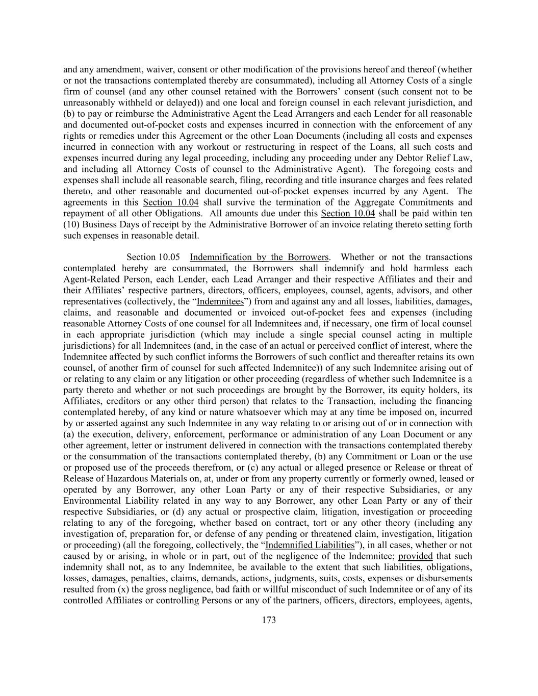 and any amendment, waiver, consent or other modification of the provisions hereof and thereof (whether or not the transactions contemplated thereby are consummated), including all Attorney Costs of a single firm of counsel (and any other counsel retained with the Borrowers’ consent (such consent not to be unreasonably withheld or delayed)) and one local and foreign counsel in each relevant jurisdiction, and (b) to pay or reimburse the Administrative Agent the Lead Arrangers and each Lender for all reasonable and documented out-of-pocket costs and expenses incurred in connection with the enforcement of any rights or remedies under this Agreement or the other Loan Documents (including all costs and expenses incurred in connection with any workout or restructuring in respect of the Loans, all such costs and expenses incurred during any legal proceeding, including any proceeding under any Debtor Relief Law, and including all Attorney Costs of counsel to the Administrative Agent). The foregoing costs and expenses shall include all reasonable search, filing, recording and title insurance charges and fees related thereto, and other reasonable and documented out-of-pocket expenses incurred by any Agent. The agreements in this Section 10.04 shall survive the termination of the Aggregate Commitments and repayment of all other Obligations. All amounts due under this Section 10.04 shall be paid within ten (10) Business Days of receipt by the Administrative Borrower of an invoice relating thereto setting forth such expenses in reasonable detail. Section 10.05 Indemnification by the Borrowers. Whether or not the transactions contemplated hereby are consummated, the Borrowers shall indemnify and hold harmless each Agent-Related Person, each Lender, each Lead Arranger and their respective Affiliates and their and their Affiliates’ respective partners, directors, officers, employees, counsel, agents, advisors, and other representatives (collectively, the “Indemnitees”) from and against any and all losses, liabilities, damages, claims, and reasonable and documented or invoiced out-of-pocket fees and expenses (including reasonable Attorney Costs of one counsel for all Indemnitees and, if necessary, one firm of local counsel in each appropriate jurisdiction (which may include a single special counsel acting in multiple jurisdictions) for all Indemnitees (and, in the case of an actual or perceived conflict of interest, where the Indemnitee affected by such conflict informs the Borrowers of such conflict and thereafter retains its own counsel, of another firm of counsel for such affected Indemnitee)) of any such Indemnitee arising out of or relating to any claim or any litigation or other proceeding (regardless of whether such Indemnitee is a party thereto and whether or not such proceedings are brought by the Borrower, its equity holders, its Affiliates, creditors or any other third person) that relates to the Transaction, including the financing contemplated hereby, of any kind or nature whatsoever which may at any time be imposed on, incurred by or asserted against any such Indemnitee in any way relating to or arising out of or in connection with (a) the execution, delivery, enforcement, performance or administration of any Loan Document or any other agreement, letter or instrument delivered in connection with the transactions contemplated thereby or the consummation of the transactions contemplated thereby, (b) any Commitment or Loan or the use or proposed use of the proceeds therefrom, or (c) any actual or alleged presence or Release or threat of Release of Hazardous Materials on, at, under or from any property currently or formerly owned, leased or operated by any Borrower, any other Loan Party or any of their respective Subsidiaries, or any Environmental Liability related in any way to any Borrower, any other Loan Party or any of their respective Subsidiaries, or (d) any actual or prospective claim, litigation, investigation or proceeding relating to any of the foregoing, whether based on contract, tort or any other theory (including any investigation of, preparation for, or defense of any pending or threatened claim, investigation, litigation or proceeding) (all the foregoing, collectively, the “Indemnified Liabilities”), in all cases, whether or not caused by or arising, in whole or in part, out of the negligence of the Indemnitee; provided that such indemnity shall not, as to any Indemnitee, be available to the extent that such liabilities, obligations, losses, damages, penalties, claims, demands, actions, judgments, suits, costs, expenses or disbursements resulted from (x) the gross negligence, bad faith or willful misconduct of such Indemnitee or of any of its controlled Affiliates or controlling Persons or any of the partners, officers, directors, employees, agents, 173