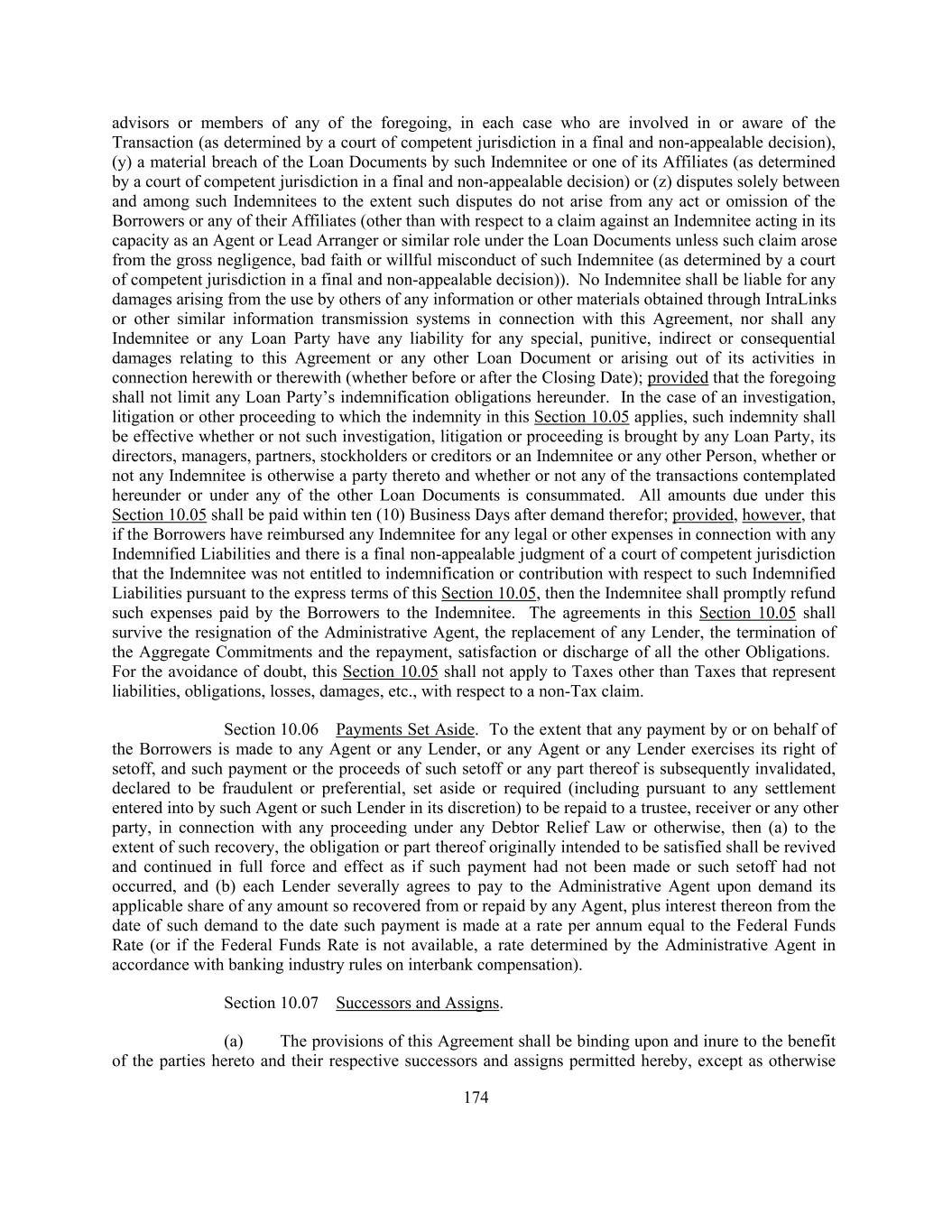 advisors or members of any of the foregoing, in each case who are involved in or aware of the Transaction (as determined by a court of competent jurisdiction in a final and non-appealable decision), (y) a material breach of the Loan Documents by such Indemnitee or one of its Affiliates (as determined by a court of competent jurisdiction in a final and non-appealable decision) or (z) disputes solely between and among such Indemnitees to the extent such disputes do not arise from any act or omission of the Borrowers or any of their Affiliates (other than with respect to a claim against an Indemnitee acting in its capacity as an Agent or Lead Arranger or similar role under the Loan Documents unless such claim arose from the gross negligence, bad faith or willful misconduct of such Indemnitee (as determined by a court of competent jurisdiction in a final and non-appealable decision)). No Indemnitee shall be liable for any damages arising from the use by others of any information or other materials obtained through IntraLinks or other similar information transmission systems in connection with this Agreement, nor shall any Indemnitee or any Loan Party have any liability for any special, punitive, indirect or consequential damages relating to this Agreement or any other Loan Document or arising out of its activities in connection herewith or therewith (whether before or after the Closing Date); provided that the foregoing shall not limit any Loan Party’s indemnification obligations hereunder. In the case of an investigation, litigation or other proceeding to which the indemnity in this Section 10.05 applies, such indemnity shall be effective whether or not such investigation, litigation or proceeding is brought by any Loan Party, its directors, managers, partners, stockholders or creditors or an Indemnitee or any other Person, whether or not any Indemnitee is otherwise a party thereto and whether or not any of the transactions contemplated hereunder or under any of the other Loan Documents is consummated. All amounts due under this Section 10.05 shall be paid within ten (10) Business Days after demand therefor; provided, however, that if the Borrowers have reimbursed any Indemnitee for any legal or other expenses in connection with any Indemnified Liabilities and there is a final non-appealable judgment of a court of competent jurisdiction that the Indemnitee was not entitled to indemnification or contribution with respect to such Indemnified Liabilities pursuant to the express terms of this Section 10.05, then the Indemnitee shall promptly refund such expenses paid by the Borrowers to the Indemnitee. The agreements in this Section 10.05 shall survive the resignation of the Administrative Agent, the replacement of any Lender, the termination of the Aggregate Commitments and the repayment, satisfaction or discharge of all the other Obligations. For the avoidance of doubt, this Section 10.05 shall not apply to Taxes other than Taxes that represent liabilities, obligations, losses, damages, etc., with respect to a non-Tax claim. Section 10.06 Payments Set Aside. To the extent that any payment by or on behalf of the Borrowers is made to any Agent or any Lender, or any Agent or any Lender exercises its right of setoff, and such payment or the proceeds of such setoff or any part thereof is subsequently invalidated, declared to be fraudulent or preferential, set aside or required (including pursuant to any settlement entered into by such Agent or such Lender in its discretion) to be repaid to a trustee, receiver or any other party, in connection with any proceeding under any Debtor Relief Law or otherwise, then (a) to the extent of such recovery, the obligation or part thereof originally intended to be satisfied shall be revived and continued in full force and effect as if such payment had not been made or such setoff had not occurred, and (b) each Lender severally agrees to pay to the Administrative Agent upon demand its applicable share of any amount so recovered from or repaid by any Agent, plus interest thereon from the date of such demand to the date such payment is made at a rate per annum equal to the Federal Funds Rate (or if the Federal Funds Rate is not available, a rate determined by the Administrative Agent in accordance with banking industry rules on interbank compensation). Section 10.07 Successors and Assigns. (a) The provisions of this Agreement shall be binding upon and inure to the benefit of the parties hereto and their respective successors and assigns permitted hereby, except as otherwise 174