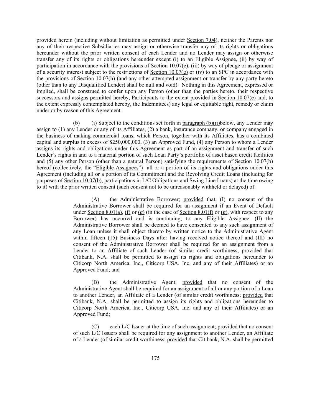 provided herein (including without limitation as permitted under Section 7.04), neither the Parents nor any of their respective Subsidiaries may assign or otherwise transfer any of its rights or obligations hereunder without the prior written consent of each Lender and no Lender may assign or otherwise transfer any of its rights or obligations hereunder except (i) to an Eligible Assignee, (ii) by way of participation in accordance with the provisions of Section 10.07(e), (iii) by way of pledge or assignment of a security interest subject to the restrictions of Section 10.07(g) or (iv) to an SPC in accordance with the provisions of Section 10.07(h) (and any other attempted assignment or transfer by any party hereto (other than to any Disqualified Lender) shall be null and void). Nothing in this Agreement, expressed or implied, shall be construed to confer upon any Person (other than the parties hereto, their respective successors and assigns permitted hereby, Participants to the extent provided in Section 10.07(e) and, to the extent expressly contemplated hereby, the Indemnitees) any legal or equitable right, remedy or claim under or by reason of this Agreement. (b) (i) Subject to the conditions set forth in paragraph (b)(ii)below, any Lender may assign to (1) any Lender or any of its Affiliates, (2) a bank, insurance company, or company engaged in the business of making commercial loans, which Person, together with its Affiliates, has a combined capital and surplus in excess of $250,000,000, (3) an Approved Fund, (4) any Person to whom a Lender assigns its rights and obligations under this Agreement as part of an assignment and transfer of such Lender’s rights in and to a material portion of such Loan Party’s portfolio of asset based credit facilities and (5) any other Person (other than a natural Person) satisfying the requirements of Section 10.07(b) hereof (collectively, the “Eligible Assignees”) all or a portion of its rights and obligations under this Agreement (including all or a portion of its Commitment and the Revolving Credit Loans (including for purposes of Section 10.07(b), participations in L/C Obligations and Swing Line Loans) at the time owing to it) with the prior written consent (such consent not to be unreasonably withheld or delayed) of: (A) the Administrative Borrower; provided that, (I) no consent of the Administrative Borrower shall be required for an assignment if an Event of Default under Section 8.01(a), (f) or (g) (in the case of Section 8.01(f) or (g), with respect to any Borrower) has occurred and is continuing, to any Eligible Assignee, (II) the Administrative Borrower shall be deemed to have consented to any such assignment of any Loan unless it shall object thereto by written notice to the Administrative Agent within fifteen (15) Business Days after having received notice thereof and (III) no consent of the Administrative Borrower shall be required for an assignment from a Lender to an Affiliate of such Lender (of similar credit worthiness; provided that Citibank, N.A. shall be permitted to assign its rights and obligations hereunder to Citicorp North America, Inc., Citicorp USA, Inc. and any of their Affiliates) or an Approved Fund; and (B) the Administrative Agent; provided that no consent of the Administrative Agent shall be required for an assignment of all or any portion of a Loan to another Lender, an Affiliate of a Lender (of similar credit worthiness; provided that Citibank, N.A. shall be permitted to assign its rights and obligations hereunder to Citicorp North America, Inc., Citicorp USA, Inc. and any of their Affiliates) or an Approved Fund; (C) each L/C Issuer at the time of such assignment; provided that no consent of such L/C Issuers shall be required for any assignment to another Lender, an Affiliate of a Lender (of similar credit worthiness; provided that Citibank, N.A. shall be permitted 175