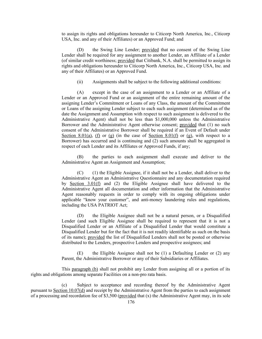 to assign its rights and obligations hereunder to Citicorp North America, Inc., Citicorp USA, Inc. and any of their Affiliates) or an Approved Fund; and (D) the Swing Line Lender; provided that no consent of the Swing Line Lender shall be required for any assignment to another Lender, an Affiliate of a Lender (of similar credit worthiness; provided that Citibank, N.A. shall be permitted to assign its rights and obligations hereunder to Citicorp North America, Inc., Citicorp USA, Inc. and any of their Affiliates) or an Approved Fund. (ii) Assignments shall be subject to the following additional conditions: (A) except in the case of an assignment to a Lender or an Affiliate of a Lender or an Approved Fund or an assignment of the entire remaining amount of the assigning Lender’s Commitment or Loans of any Class, the amount of the Commitment or Loans of the assigning Lender subject to each such assignment (determined as of the date the Assignment and Assumption with respect to such assignment is delivered to the Administrative Agent) shall not be less than $1,000,000 unless the Administrative Borrower and the Administrative Agent otherwise consent; provided that (1) no such consent of the Administrative Borrower shall be required if an Event of Default under Section 8.01(a), (f) or (g) (in the case of Section 8.01(f) or (g), with respect to a Borrower) has occurred and is continuing and (2) such amounts shall be aggregated in respect of each Lender and its Affiliates or Approved Funds, if any; (B) the parties to each assignment shall execute and deliver to the Administrative Agent an Assignment and Assumption; (C) (1) the Eligible Assignee, if it shall not be a Lender, shall deliver to the Administrative Agent an Administrative Questionnaire and any documentation required by Section 3.01(f) and (2) the Eligible Assignee shall have delivered to the Administrative Agent all documentation and other information that the Administrative Agent reasonably requests in order to comply with its ongoing obligations under applicable “know your customer”, and anti-money laundering rules and regulations, including the USA PATRIOT Act; (D) the Eligible Assignee shall not be a natural person, or a Disqualified Lender (and such Eligible Assignee shall be required to represent that it is not a Disqualified Lender or an Affiliate of a Disqualified Lender that would constitute a Disqualified Lender but for the fact that it is not readily identifiable as such on the basis of its name); provided the list of Disqualified Lenders shall not be posted or otherwise distributed to the Lenders, prospective Lenders and prospective assignees; and (E) the Eligible Assignee shall not be (1) a Defaulting Lender or (2) any Parent, the Administrative Borrower or any of their Subsidiaries or Affiliates. This paragraph (b) shall not prohibit any Lender from assigning all or a portion of its rights and obligations among separate Facilities on a non-pro rata basis. (c) Subject to acceptance and recording thereof by the Administrative Agent pursuant to Section 10.07(d) and receipt by the Administrative Agent from the parties to each assignment of a processing and recordation fee of $3,500 (provided that (x) the Administrative Agent may, in its sole 176