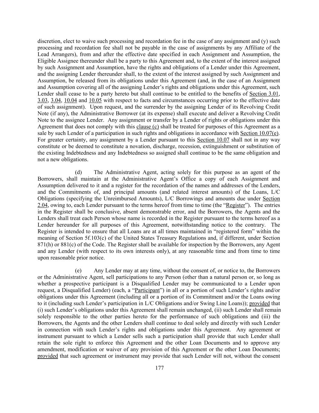 discretion, elect to waive such processing and recordation fee in the case of any assignment and (y) such processing and recordation fee shall not be payable in the case of assignments by any Affiliate of the Lead Arrangers), from and after the effective date specified in each Assignment and Assumption, the Eligible Assignee thereunder shall be a party to this Agreement and, to the extent of the interest assigned by such Assignment and Assumption, have the rights and obligations of a Lender under this Agreement, and the assigning Lender thereunder shall, to the extent of the interest assigned by such Assignment and Assumption, be released from its obligations under this Agreement (and, in the case of an Assignment and Assumption covering all of the assigning Lender’s rights and obligations under this Agreement, such Lender shall cease to be a party hereto but shall continue to be entitled to the benefits of Section 3.01, 3.03, 3.04, 10.04 and 10.05 with respect to facts and circumstances occurring prior to the effective date of such assignment). Upon request, and the surrender by the assigning Lender of its Revolving Credit Note (if any), the Administrative Borrower (at its expense) shall execute and deliver a Revolving Credit Note to the assignee Lender. Any assignment or transfer by a Lender of rights or obligations under this Agreement that does not comply with this clause (c) shall be treated for purposes of this Agreement as a sale by such Lender of a participation in such rights and obligations in accordance with Section 10.07(e). For greater certainty, any assignment by a Lender pursuant to this Section 10.07 shall not in any way constitute or be deemed to constitute a novation, discharge, recession, extinguishment or substitution of the existing Indebtedness and any Indebtedness so assigned shall continue to be the same obligation and not a new obligations. (d) The Administrative Agent, acting solely for this purpose as an agent of the Borrowers, shall maintain at the Administrative Agent’s Office a copy of each Assignment and Assumption delivered to it and a register for the recordation of the names and addresses of the Lenders, and the Commitments of, and principal amounts (and related interest amounts) of the Loans, L/C Obligations (specifying the Unreimbursed Amounts), L/C Borrowings and amounts due under Section 2.04, owing to, each Lender pursuant to the terms hereof from time to time (the “Register”). The entries in the Register shall be conclusive, absent demonstrable error, and the Borrowers, the Agents and the Lenders shall treat each Person whose name is recorded in the Register pursuant to the terms hereof as a Lender hereunder for all purposes of this Agreement, notwithstanding notice to the contrary. The Register is intended to ensure that all Loans are at all times maintained in “registered form” within the meaning of Section 5f.103(c) of the United States Treasury Regulations and, if different, under Section 871(h) or 881(c) of the Code. The Register shall be available for inspection by the Borrowers, any Agent and any Lender (with respect to its own interests only), at any reasonable time and from time to time upon reasonable prior notice. (e) Any Lender may at any time, without the consent of, or notice to, the Borrowers or the Administrative Agent, sell participations to any Person (other than a natural person or, so long as whether a prospective participant is a Disqualified Lender may be communicated to a Lender upon request, a Disqualified Lender) (each, a “Participant”) in all or a portion of such Lender’s rights and/or obligations under this Agreement (including all or a portion of its Commitment and/or the Loans owing to it (including such Lender’s participation in L/C Obligations and/or Swing Line Loans)); provided that (i) such Lender’s obligations under this Agreement shall remain unchanged, (ii) such Lender shall remain solely responsible to the other parties hereto for the performance of such obligations and (iii) the Borrowers, the Agents and the other Lenders shall continue to deal solely and directly with such Lender in connection with such Lender’s rights and obligations under this Agreement. Any agreement or instrument pursuant to which a Lender sells such a participation shall provide that such Lender shall retain the sole right to enforce this Agreement and the other Loan Documents and to approve any amendment, modification or waiver of any provision of this Agreement or the other Loan Documents; provided that such agreement or instrument may provide that such Lender will not, without the consent 177
