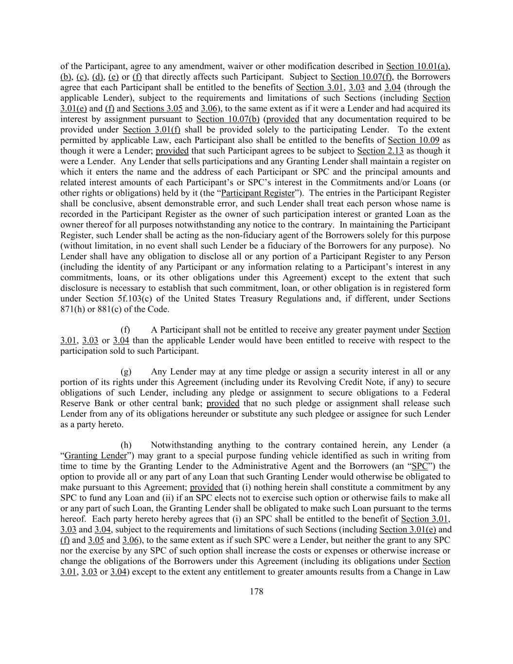 of the Participant, agree to any amendment, waiver or other modification described in Section 10.01(a), (b), (c), (d), (e) or (f) that directly affects such Participant. Subject to Section 10.07(f), the Borrowers agree that each Participant shall be entitled to the benefits of Section 3.01, 3.03 and 3.04 (through the applicable Lender), subject to the requirements and limitations of such Sections (including Section 3.01(e) and (f) and Sections 3.05 and 3.06), to the same extent as if it were a Lender and had acquired its interest by assignment pursuant to Section 10.07(b) (provided that any documentation required to be provided under Section 3.01(f) shall be provided solely to the participating Lender. To the extent permitted by applicable Law, each Participant also shall be entitled to the benefits of Section 10.09 as though it were a Lender; provided that such Participant agrees to be subject to Section 2.13 as though it were a Lender. Any Lender that sells participations and any Granting Lender shall maintain a register on which it enters the name and the address of each Participant or SPC and the principal amounts and related interest amounts of each Participant’s or SPC’s interest in the Commitments and/or Loans (or other rights or obligations) held by it (the “Participant Register”). The entries in the Participant Register shall be conclusive, absent demonstrable error, and such Lender shall treat each person whose name is recorded in the Participant Register as the owner of such participation interest or granted Loan as the owner thereof for all purposes notwithstanding any notice to the contrary. In maintaining the Participant Register, such Lender shall be acting as the non-fiduciary agent of the Borrowers solely for this purpose (without limitation, in no event shall such Lender be a fiduciary of the Borrowers for any purpose). No Lender shall have any obligation to disclose all or any portion of a Participant Register to any Person (including the identity of any Participant or any information relating to a Participant’s interest in any commitments, loans, or its other obligations under this Agreement) except to the extent that such disclosure is necessary to establish that such commitment, loan, or other obligation is in registered form under Section 5f.103(c) of the United States Treasury Regulations and, if different, under Sections 871(h) or 881(c) of the Code. (f) A Participant shall not be entitled to receive any greater payment under Section 3.01, 3.03 or 3.04 than the applicable Lender would have been entitled to receive with respect to the participation sold to such Participant. (g) Any Lender may at any time pledge or assign a security interest in all or any portion of its rights under this Agreement (including under its Revolving Credit Note, if any) to secure obligations of such Lender, including any pledge or assignment to secure obligations to a Federal Reserve Bank or other central bank; provided that no such pledge or assignment shall release such Lender from any of its obligations hereunder or substitute any such pledgee or assignee for such Lender as a party hereto. (h) Notwithstanding anything to the contrary contained herein, any Lender (a “Granting Lender”) may grant to a special purpose funding vehicle identified as such in writing from time to time by the Granting Lender to the Administrative Agent and the Borrowers (an “SPC”) the option to provide all or any part of any Loan that such Granting Lender would otherwise be obligated to make pursuant to this Agreement; provided that (i) nothing herein shall constitute a commitment by any SPC to fund any Loan and (ii) if an SPC elects not to exercise such option or otherwise fails to make all or any part of such Loan, the Granting Lender shall be obligated to make such Loan pursuant to the terms hereof. Each party hereto hereby agrees that (i) an SPC shall be entitled to the benefit of Section 3.01, 3.03 and 3.04, subject to the requirements and limitations of such Sections (including Section 3.01(e) and (f) and 3.05 and 3.06), to the same extent as if such SPC were a Lender, but neither the grant to any SPC nor the exercise by any SPC of such option shall increase the costs or expenses or otherwise increase or change the obligations of the Borrowers under this Agreement (including its obligations under Section 3.01, 3.03 or 3.04) except to the extent any entitlement to greater amounts results from a Change in Law 178