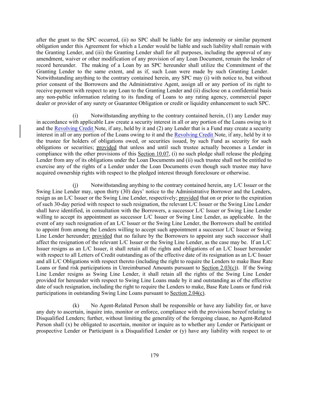 after the grant to the SPC occurred, (ii) no SPC shall be liable for any indemnity or similar payment obligation under this Agreement for which a Lender would be liable and such liability shall remain with the Granting Lender, and (iii) the Granting Lender shall for all purposes, including the approval of any amendment, waiver or other modification of any provision of any Loan Document, remain the lender of record hereunder. The making of a Loan by an SPC hereunder shall utilize the Commitment of the Granting Lender to the same extent, and as if, such Loan were made by such Granting Lender. Notwithstanding anything to the contrary contained herein, any SPC may (i) with notice to, but without prior consent of the Borrowers and the Administrative Agent, assign all or any portion of its right to receive payment with respect to any Loan to the Granting Lender and (ii) disclose on a confidential basis any non-public information relating to its funding of Loans to any rating agency, commercial paper dealer or provider of any surety or Guarantee Obligation or credit or liquidity enhancement to such SPC. (i) Notwithstanding anything to the contrary contained herein, (1) any Lender may in accordance with applicable Law create a security interest in all or any portion of the Loans owing to it and the Revolving Credit Note, if any, held by it and (2) any Lender that is a Fund may create a security interest in all or any portion of the Loans owing to it and the Revolving Credit Note, if any, held by it to the trustee for holders of obligations owed, or securities issued, by such Fund as security for such obligations or securities; provided that unless and until such trustee actually becomes a Lender in compliance with the other provisions of this Section 10.07, (i) no such pledge shall release the pledging Lender from any of its obligations under the Loan Documents and (ii) such trustee shall not be entitled to exercise any of the rights of a Lender under the Loan Documents even though such trustee may have acquired ownership rights with respect to the pledged interest through foreclosure or otherwise. (j) Notwithstanding anything to the contrary contained herein, any L/C Issuer or the Swing Line Lender may, upon thirty (30) days’ notice to the Administrative Borrower and the Lenders, resign as an L/C Issuer or the Swing Line Lender, respectively; provided that on or prior to the expiration of such 30-day period with respect to such resignation, the relevant L/C Issuer or the Swing Line Lender shall have identified, in consultation with the Borrowers, a successor L/C Issuer or Swing Line Lender willing to accept its appointment as successor L/C Issuer or Swing Line Lender, as applicable. In the event of any such resignation of an L/C Issuer or the Swing Line Lender, the Borrowers shall be entitled to appoint from among the Lenders willing to accept such appointment a successor L/C Issuer or Swing Line Lender hereunder; provided that no failure by the Borrowers to appoint any such successor shall affect the resignation of the relevant L/C Issuer or the Swing Line Lender, as the case may be. If an L/C Issuer resigns as an L/C Issuer, it shall retain all the rights and obligations of an L/C Issuer hereunder with respect to all Letters of Credit outstanding as of the effective date of its resignation as an L/C Issuer and all L/C Obligations with respect thereto (including the right to require the Lenders to make Base Rate Loans or fund risk participations in Unreimbursed Amounts pursuant to Section 2.03(c)). If the Swing Line Lender resigns as Swing Line Lender, it shall retain all the rights of the Swing Line Lender provided for hereunder with respect to Swing Line Loans made by it and outstanding as of the effective date of such resignation, including the right to require the Lenders to make, Base Rate Loans or fund risk participations in outstanding Swing Line Loans pursuant to Section 2.04(c). (k) No Agent-Related Person shall be responsible or have any liability for, or have any duty to ascertain, inquire into, monitor or enforce, compliance with the provisions hereof relating to Disqualified Lenders; further, without limiting the generality of the foregoing clause, no Agent-Related Person shall (x) be obligated to ascertain, monitor or inquire as to whether any Lender or Participant or prospective Lender or Participant is a Disqualified Lender or (y) have any liability with respect to or 179