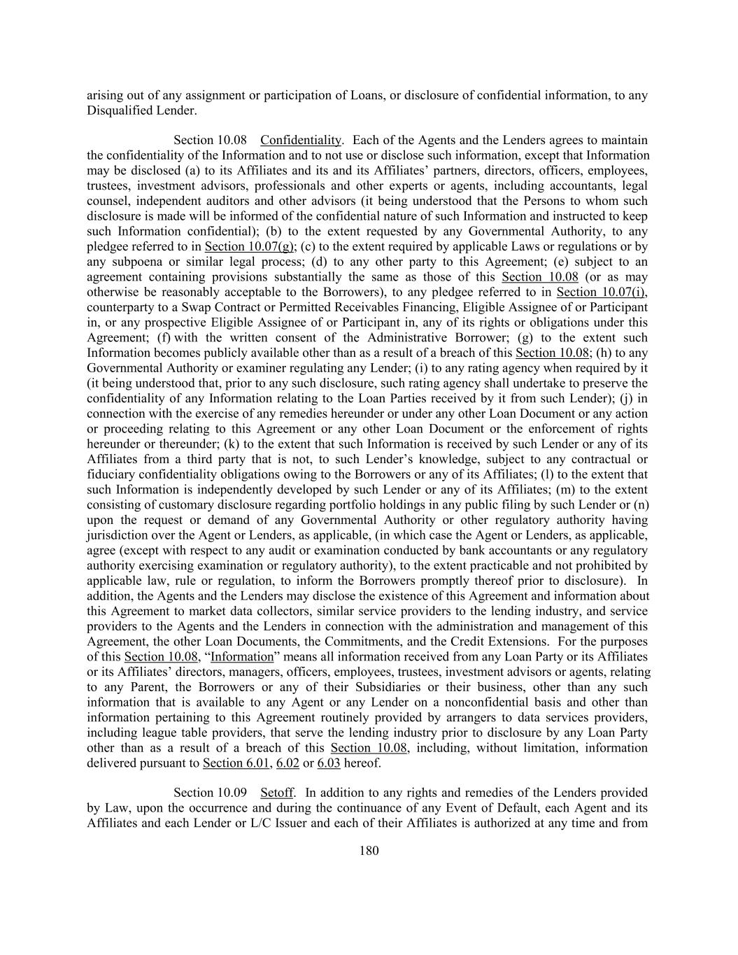 arising out of any assignment or participation of Loans, or disclosure of confidential information, to any Disqualified Lender. Section 10.08 Confidentiality. Each of the Agents and the Lenders agrees to maintain the confidentiality of the Information and to not use or disclose such information, except that Information may be disclosed (a) to its Affiliates and its and its Affiliates’ partners, directors, officers, employees, trustees, investment advisors, professionals and other experts or agents, including accountants, legal counsel, independent auditors and other advisors (it being understood that the Persons to whom such disclosure is made will be informed of the confidential nature of such Information and instructed to keep such Information confidential); (b) to the extent requested by any Governmental Authority, to any pledgee referred to in Section 10.07(g); (c) to the extent required by applicable Laws or regulations or by any subpoena or similar legal process; (d) to any other party to this Agreement; (e) subject to an agreement containing provisions substantially the same as those of this Section 10.08 (or as may otherwise be reasonably acceptable to the Borrowers), to any pledgee referred to in Section 10.07(i), counterparty to a Swap Contract or Permitted Receivables Financing, Eligible Assignee of or Participant in, or any prospective Eligible Assignee of or Participant in, any of its rights or obligations under this Agreement; (f) with the written consent of the Administrative Borrower; (g) to the extent such Information becomes publicly available other than as a result of a breach of this Section 10.08; (h) to any Governmental Authority or examiner regulating any Lender; (i) to any rating agency when required by it (it being understood that, prior to any such disclosure, such rating agency shall undertake to preserve the confidentiality of any Information relating to the Loan Parties received by it from such Lender); (j) in connection with the exercise of any remedies hereunder or under any other Loan Document or any action or proceeding relating to this Agreement or any other Loan Document or the enforcement of rights hereunder or thereunder; (k) to the extent that such Information is received by such Lender or any of its Affiliates from a third party that is not, to such Lender’s knowledge, subject to any contractual or fiduciary confidentiality obligations owing to the Borrowers or any of its Affiliates; (l) to the extent that such Information is independently developed by such Lender or any of its Affiliates; (m) to the extent consisting of customary disclosure regarding portfolio holdings in any public filing by such Lender or (n) upon the request or demand of any Governmental Authority or other regulatory authority having jurisdiction over the Agent or Lenders, as applicable, (in which case the Agent or Lenders, as applicable, agree (except with respect to any audit or examination conducted by bank accountants or any regulatory authority exercising examination or regulatory authority), to the extent practicable and not prohibited by applicable law, rule or regulation, to inform the Borrowers promptly thereof prior to disclosure). In addition, the Agents and the Lenders may disclose the existence of this Agreement and information about this Agreement to market data collectors, similar service providers to the lending industry, and service providers to the Agents and the Lenders in connection with the administration and management of this Agreement, the other Loan Documents, the Commitments, and the Credit Extensions. For the purposes of this Section 10.08, “Information” means all information received from any Loan Party or its Affiliates or its Affiliates’ directors, managers, officers, employees, trustees, investment advisors or agents, relating to any Parent, the Borrowers or any of their Subsidiaries or their business, other than any such information that is available to any Agent or any Lender on a nonconfidential basis and other than information pertaining to this Agreement routinely provided by arrangers to data services providers, including league table providers, that serve the lending industry prior to disclosure by any Loan Party other than as a result of a breach of this Section 10.08, including, without limitation, information delivered pursuant to Section 6.01, 6.02 or 6.03 hereof. Section 10.09 Setoff. In addition to any rights and remedies of the Lenders provided by Law, upon the occurrence and during the continuance of any Event of Default, each Agent and its Affiliates and each Lender or L/C Issuer and each of their Affiliates is authorized at any time and from 180