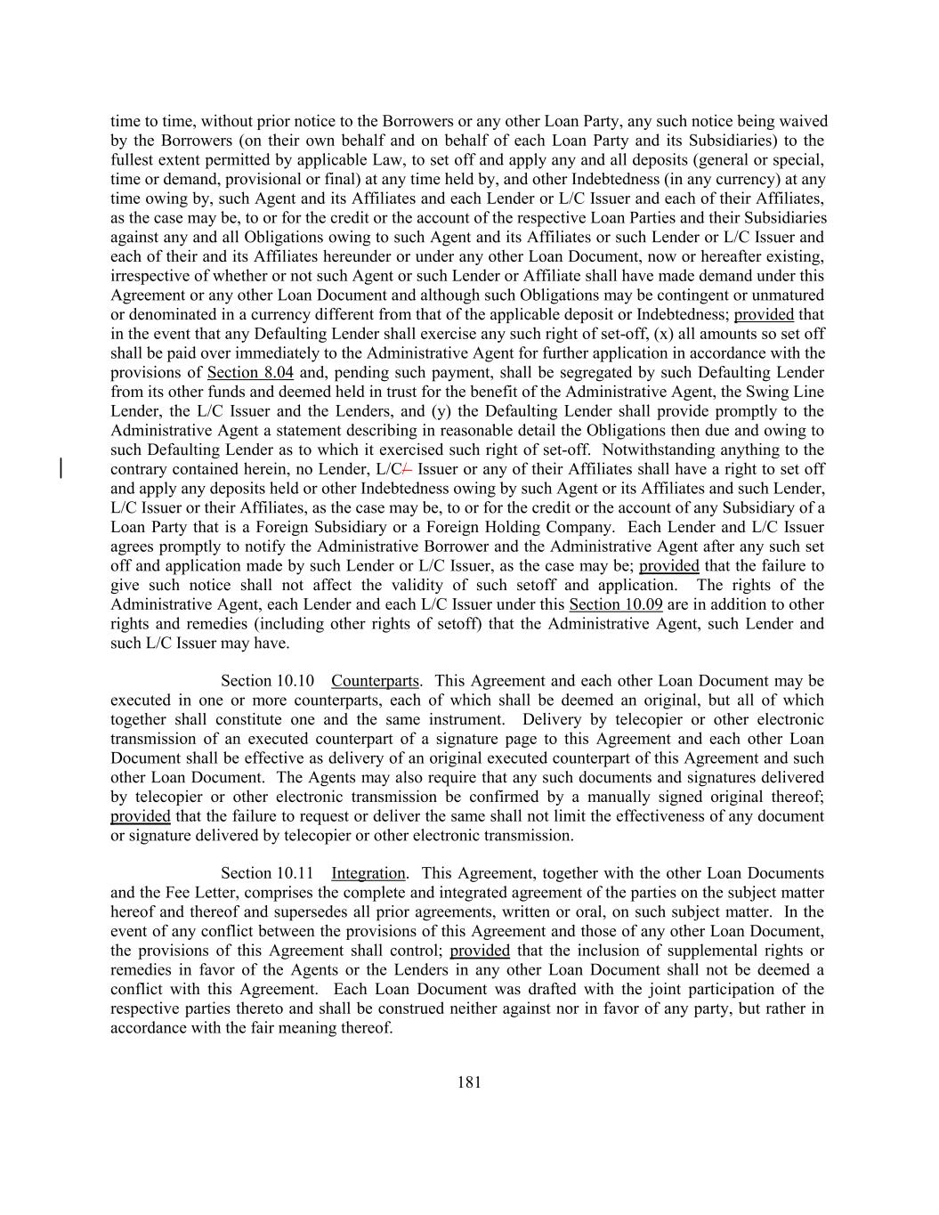 time to time, without prior notice to the Borrowers or any other Loan Party, any such notice being waived by the Borrowers (on their own behalf and on behalf of each Loan Party and its Subsidiaries) to the fullest extent permitted by applicable Law, to set off and apply any and all deposits (general or special, time or demand, provisional or final) at any time held by, and other Indebtedness (in any currency) at any time owing by, such Agent and its Affiliates and each Lender or L/C Issuer and each of their Affiliates, as the case may be, to or for the credit or the account of the respective Loan Parties and their Subsidiaries against any and all Obligations owing to such Agent and its Affiliates or such Lender or L/C Issuer and each of their and its Affiliates hereunder or under any other Loan Document, now or hereafter existing, irrespective of whether or not such Agent or such Lender or Affiliate shall have made demand under this Agreement or any other Loan Document and although such Obligations may be contingent or unmatured or denominated in a currency different from that of the applicable deposit or Indebtedness; provided that in the event that any Defaulting Lender shall exercise any such right of set-off, (x) all amounts so set off shall be paid over immediately to the Administrative Agent for further application in accordance with the provisions of Section 8.04 and, pending such payment, shall be segregated by such Defaulting Lender from its other funds and deemed held in trust for the benefit of the Administrative Agent, the Swing Line Lender, the L/C Issuer and the Lenders, and (y) the Defaulting Lender shall provide promptly to the Administrative Agent a statement describing in reasonable detail the Obligations then due and owing to such Defaulting Lender as to which it exercised such right of set-off. Notwithstanding anything to the contrary contained herein, no Lender, L/C/ Issuer or any of their Affiliates shall have a right to set off and apply any deposits held or other Indebtedness owing by such Agent or its Affiliates and such Lender, L/C Issuer or their Affiliates, as the case may be, to or for the credit or the account of any Subsidiary of a Loan Party that is a Foreign Subsidiary or a Foreign Holding Company. Each Lender and L/C Issuer agrees promptly to notify the Administrative Borrower and the Administrative Agent after any such set off and application made by such Lender or L/C Issuer, as the case may be; provided that the failure to give such notice shall not affect the validity of such setoff and application. The rights of the Administrative Agent, each Lender and each L/C Issuer under this Section 10.09 are in addition to other rights and remedies (including other rights of setoff) that the Administrative Agent, such Lender and such L/C Issuer may have. Section 10.10 Counterparts. This Agreement and each other Loan Document may be executed in one or more counterparts, each of which shall be deemed an original, but all of which together shall constitute one and the same instrument. Delivery by telecopier or other electronic transmission of an executed counterpart of a signature page to this Agreement and each other Loan Document shall be effective as delivery of an original executed counterpart of this Agreement and such other Loan Document. The Agents may also require that any such documents and signatures delivered by telecopier or other electronic transmission be confirmed by a manually signed original thereof; provided that the failure to request or deliver the same shall not limit the effectiveness of any document or signature delivered by telecopier or other electronic transmission. Section 10.11 Integration. This Agreement, together with the other Loan Documents and the Fee Letter, comprises the complete and integrated agreement of the parties on the subject matter hereof and thereof and supersedes all prior agreements, written or oral, on such subject matter. In the event of any conflict between the provisions of this Agreement and those of any other Loan Document, the provisions of this Agreement shall control; provided that the inclusion of supplemental rights or remedies in favor of the Agents or the Lenders in any other Loan Document shall not be deemed a conflict with this Agreement. Each Loan Document was drafted with the joint participation of the respective parties thereto and shall be construed neither against nor in favor of any party, but rather in accordance with the fair meaning thereof. 181