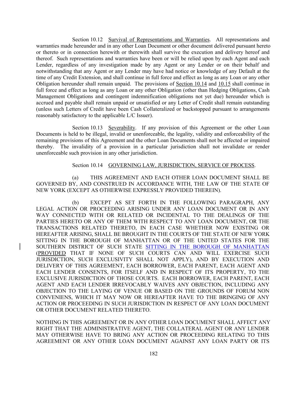 Section 10.12 Survival of Representations and Warranties. All representations and warranties made hereunder and in any other Loan Document or other document delivered pursuant hereto or thereto or in connection herewith or therewith shall survive the execution and delivery hereof and thereof. Such representations and warranties have been or will be relied upon by each Agent and each Lender, regardless of any investigation made by any Agent or any Lender or on their behalf and notwithstanding that any Agent or any Lender may have had notice or knowledge of any Default at the time of any Credit Extension, and shall continue in full force and effect as long as any Loan or any other Obligation hereunder shall remain unpaid. The provisions of Section 10.14 and 10.15 shall continue in full force and effect as long as any Loan or any other Obligation (other than Hedging Obligations, Cash Management Obligations and contingent indemnification obligations not yet due) hereunder which is accrued and payable shall remain unpaid or unsatisfied or any Letter of Credit shall remain outstanding (unless such Letters of Credit have been Cash Collateralized or backstopped pursuant to arrangements reasonably satisfactory to the applicable L/C Issuer). Section 10.13 Severability. If any provision of this Agreement or the other Loan Documents is held to be illegal, invalid or unenforceable, the legality, validity and enforceability of the remaining provisions of this Agreement and the other Loan Documents shall not be affected or impaired thereby. The invalidity of a provision in a particular jurisdiction shall not invalidate or render unenforceable such provision in any other jurisdiction. Section 10.14 GOVERNING LAW, JURISDICTION, SERVICE OF PROCESS. (a) THIS AGREEMENT AND EACH OTHER LOAN DOCUMENT SHALL BE GOVERNED BY, AND CONSTRUED IN ACCORDANCE WITH, THE LAW OF THE STATE OF NEW YORK (EXCEPT AS OTHERWISE EXPRESSLY PROVIDED THEREIN). (b) EXCEPT AS SET FORTH IN THE FOLLOWING PARAGRAPH, ANY LEGAL ACTION OR PROCEEDING ARISING UNDER ANY LOAN DOCUMENT OR IN ANY WAY CONNECTED WITH OR RELATED OR INCIDENTAL TO THE DEALINGS OF THE PARTIES HERETO OR ANY OF THEM WITH RESPECT TO ANY LOAN DOCUMENT, OR THE TRANSACTIONS RELATED THERETO, IN EACH CASE WHETHER NOW EXISTING OR HEREAFTER ARISING, SHALL BE BROUGHT IN THE COURTS OF THE STATE OF NEW YORK SITTING IN THE BOROUGH OF MANHATTAN OR OF THE UNITED STATES FOR THE SOUTHERN DISTRICT OF SUCH STATE SITTING IN THE BOROUGH OF MANHATTAN (PROVIDED THAT IF NONE OF SUCH COURTS CAN AND WILL EXERCISE SUCH JURISDICTION, SUCH EXCLUSIVITY SHALL NOT APPLY), AND BY EXECUTION AND DELIVERY OF THIS AGREEMENT, EACH BORROWER, EACH PARENT, EACH AGENT AND EACH LENDER CONSENTS, FOR ITSELF AND IN RESPECT OF ITS PROPERTY, TO THE EXCLUSIVE JURISDICTION OF THOSE COURTS. EACH BORROWER, EACH PARENT, EACH AGENT AND EACH LENDER IRREVOCABLY WAIVES ANY OBJECTION, INCLUDING ANY OBJECTION TO THE LAYING OF VENUE OR BASED ON THE GROUNDS OF FORUM NON CONVENIENS, WHICH IT MAY NOW OR HEREAFTER HAVE TO THE BRINGING OF ANY ACTION OR PROCEEDING IN SUCH JURISDICTION IN RESPECT OF ANY LOAN DOCUMENT OR OTHER DOCUMENT RELATED THERETO. NOTHING IN THIS AGREEMENT OR IN ANY OTHER LOAN DOCUMENT SHALL AFFECT ANY RIGHT THAT THE ADMINISTRATIVE AGENT, THE COLLATERAL AGENT OR ANY LENDER MAY OTHERWISE HAVE TO BRING ANY ACTION OR PROCEEDING RELATING TO THIS AGREEMENT OR ANY OTHER LOAN DOCUMENT AGAINST ANY LOAN PARTY OR ITS 182