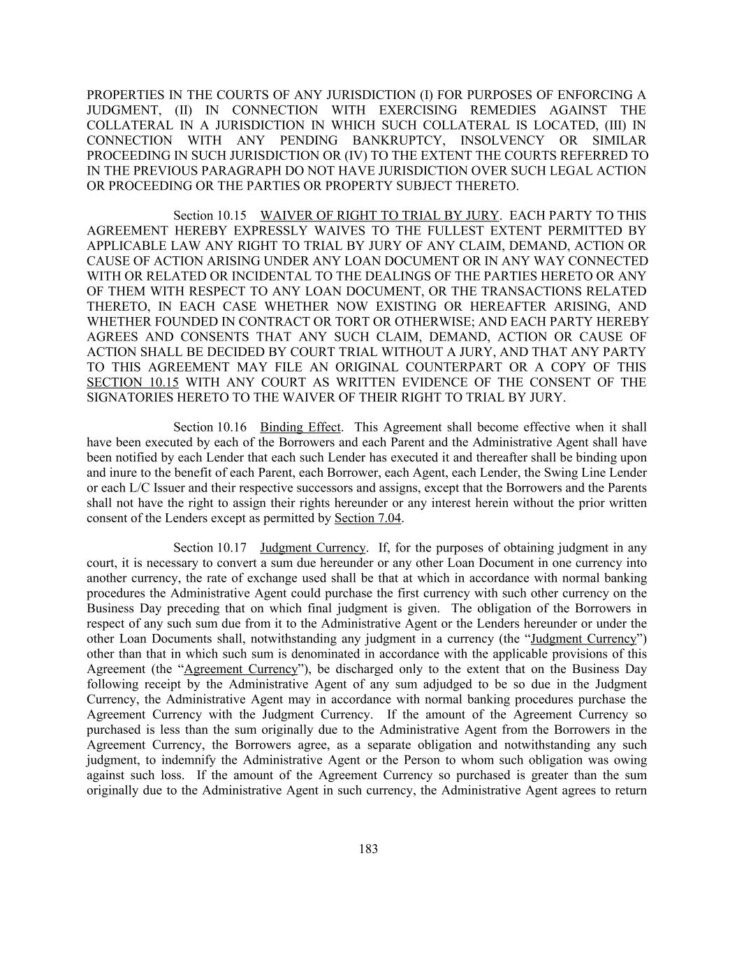 PROPERTIES IN THE COURTS OF ANY JURISDICTION (I) FOR PURPOSES OF ENFORCING A JUDGMENT, (II) IN CONNECTION WITH EXERCISING REMEDIES AGAINST THE COLLATERAL IN A JURISDICTION IN WHICH SUCH COLLATERAL IS LOCATED, (III) IN CONNECTION WITH ANY PENDING BANKRUPTCY, INSOLVENCY OR SIMILAR PROCEEDING IN SUCH JURISDICTION OR (IV) TO THE EXTENT THE COURTS REFERRED TO IN THE PREVIOUS PARAGRAPH DO NOT HAVE JURISDICTION OVER SUCH LEGAL ACTION OR PROCEEDING OR THE PARTIES OR PROPERTY SUBJECT THERETO. Section 10.15 WAIVER OF RIGHT TO TRIAL BY JURY. EACH PARTY TO THIS AGREEMENT HEREBY EXPRESSLY WAIVES TO THE FULLEST EXTENT PERMITTED BY APPLICABLE LAW ANY RIGHT TO TRIAL BY JURY OF ANY CLAIM, DEMAND, ACTION OR CAUSE OF ACTION ARISING UNDER ANY LOAN DOCUMENT OR IN ANY WAY CONNECTED WITH OR RELATED OR INCIDENTAL TO THE DEALINGS OF THE PARTIES HERETO OR ANY OF THEM WITH RESPECT TO ANY LOAN DOCUMENT, OR THE TRANSACTIONS RELATED THERETO, IN EACH CASE WHETHER NOW EXISTING OR HEREAFTER ARISING, AND WHETHER FOUNDED IN CONTRACT OR TORT OR OTHERWISE; AND EACH PARTY HEREBY AGREES AND CONSENTS THAT ANY SUCH CLAIM, DEMAND, ACTION OR CAUSE OF ACTION SHALL BE DECIDED BY COURT TRIAL WITHOUT A JURY, AND THAT ANY PARTY TO THIS AGREEMENT MAY FILE AN ORIGINAL COUNTERPART OR A COPY OF THIS SECTION 10.15 WITH ANY COURT AS WRITTEN EVIDENCE OF THE CONSENT OF THE SIGNATORIES HERETO TO THE WAIVER OF THEIR RIGHT TO TRIAL BY JURY. Section 10.16 Binding Effect. This Agreement shall become effective when it shall have been executed by each of the Borrowers and each Parent and the Administrative Agent shall have been notified by each Lender that each such Lender has executed it and thereafter shall be binding upon and inure to the benefit of each Parent, each Borrower, each Agent, each Lender, the Swing Line Lender or each L/C Issuer and their respective successors and assigns, except that the Borrowers and the Parents shall not have the right to assign their rights hereunder or any interest herein without the prior written consent of the Lenders except as permitted by Section 7.04. Section 10.17 Judgment Currency. If, for the purposes of obtaining judgment in any court, it is necessary to convert a sum due hereunder or any other Loan Document in one currency into another currency, the rate of exchange used shall be that at which in accordance with normal banking procedures the Administrative Agent could purchase the first currency with such other currency on the Business Day preceding that on which final judgment is given. The obligation of the Borrowers in respect of any such sum due from it to the Administrative Agent or the Lenders hereunder or under the other Loan Documents shall, notwithstanding any judgment in a currency (the “Judgment Currency”) other than that in which such sum is denominated in accordance with the applicable provisions of this Agreement (the “Agreement Currency”), be discharged only to the extent that on the Business Day following receipt by the Administrative Agent of any sum adjudged to be so due in the Judgment Currency, the Administrative Agent may in accordance with normal banking procedures purchase the Agreement Currency with the Judgment Currency. If the amount of the Agreement Currency so purchased is less than the sum originally due to the Administrative Agent from the Borrowers in the Agreement Currency, the Borrowers agree, as a separate obligation and notwithstanding any such judgment, to indemnify the Administrative Agent or the Person to whom such obligation was owing against such loss. If the amount of the Agreement Currency so purchased is greater than the sum originally due to the Administrative Agent in such currency, the Administrative Agent agrees to return 183
