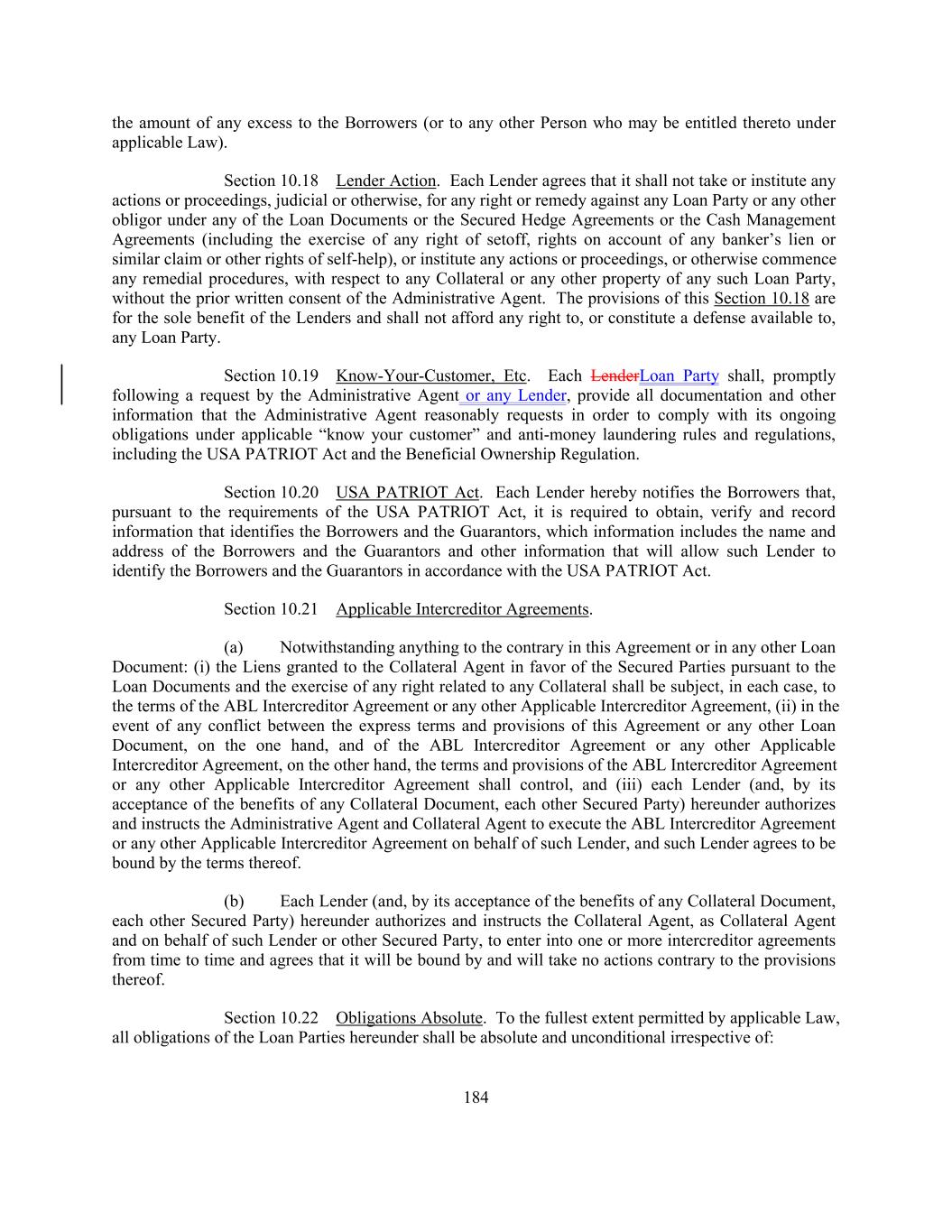 the amount of any excess to the Borrowers (or to any other Person who may be entitled thereto under applicable Law). Section 10.18 Lender Action. Each Lender agrees that it shall not take or institute any actions or proceedings, judicial or otherwise, for any right or remedy against any Loan Party or any other obligor under any of the Loan Documents or the Secured Hedge Agreements or the Cash Management Agreements (including the exercise of any right of setoff, rights on account of any banker’s lien or similar claim or other rights of self-help), or institute any actions or proceedings, or otherwise commence any remedial procedures, with respect to any Collateral or any other property of any such Loan Party, without the prior written consent of the Administrative Agent. The provisions of this Section 10.18 are for the sole benefit of the Lenders and shall not afford any right to, or constitute a defense available to, any Loan Party. Section 10.19 Know-Your-Customer, Etc. Each LenderLoan Party shall, promptly following a request by the Administrative Agent or any Lender, provide all documentation and other information that the Administrative Agent reasonably requests in order to comply with its ongoing obligations under applicable “know your customer” and anti-money laundering rules and regulations, including the USA PATRIOT Act and the Beneficial Ownership Regulation. Section 10.20 USA PATRIOT Act. Each Lender hereby notifies the Borrowers that, pursuant to the requirements of the USA PATRIOT Act, it is required to obtain, verify and record information that identifies the Borrowers and the Guarantors, which information includes the name and address of the Borrowers and the Guarantors and other information that will allow such Lender to identify the Borrowers and the Guarantors in accordance with the USA PATRIOT Act. Section 10.21 Applicable Intercreditor Agreements. (a) Notwithstanding anything to the contrary in this Agreement or in any other Loan Document: (i) the Liens granted to the Collateral Agent in favor of the Secured Parties pursuant to the Loan Documents and the exercise of any right related to any Collateral shall be subject, in each case, to the terms of the ABL Intercreditor Agreement or any other Applicable Intercreditor Agreement, (ii) in the event of any conflict between the express terms and provisions of this Agreement or any other Loan Document, on the one hand, and of the ABL Intercreditor Agreement or any other Applicable Intercreditor Agreement, on the other hand, the terms and provisions of the ABL Intercreditor Agreement or any other Applicable Intercreditor Agreement shall control, and (iii) each Lender (and, by its acceptance of the benefits of any Collateral Document, each other Secured Party) hereunder authorizes and instructs the Administrative Agent and Collateral Agent to execute the ABL Intercreditor Agreement or any other Applicable Intercreditor Agreement on behalf of such Lender, and such Lender agrees to be bound by the terms thereof. (b) Each Lender (and, by its acceptance of the benefits of any Collateral Document, each other Secured Party) hereunder authorizes and instructs the Collateral Agent, as Collateral Agent and on behalf of such Lender or other Secured Party, to enter into one or more intercreditor agreements from time to time and agrees that it will be bound by and will take no actions contrary to the provisions thereof. Section 10.22 Obligations Absolute. To the fullest extent permitted by applicable Law, all obligations of the Loan Parties hereunder shall be absolute and unconditional irrespective of: 184