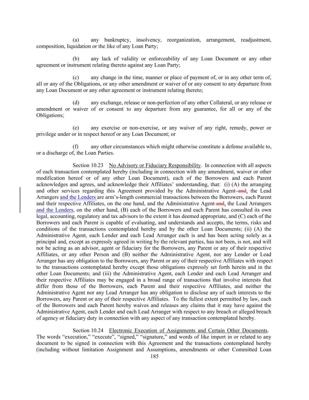 (a) any bankruptcy, insolvency, reorganization, arrangement, readjustment, composition, liquidation or the like of any Loan Party; (b) any lack of validity or enforceability of any Loan Document or any other agreement or instrument relating thereto against any Loan Party; (c) any change in the time, manner or place of payment of, or in any other term of, all or any of the Obligations, or any other amendment or waiver of or any consent to any departure from any Loan Document or any other agreement or instrument relating thereto; (d) any exchange, release or non-perfection of any other Collateral, or any release or amendment or waiver of or consent to any departure from any guarantee, for all or any of the Obligations; (e) any exercise or non-exercise, or any waiver of any right, remedy, power or privilege under or in respect hereof or any Loan Document; or (f) any other circumstances which might otherwise constitute a defense available to, or a discharge of, the Loan Parties. Section 10.23 No Advisory or Fiduciary Responsibility. In connection with all aspects of each transaction contemplated hereby (including in connection with any amendment, waiver or other modification hereof or of any other Loan Document), each of the Borrowers and each Parent acknowledges and agrees, and acknowledge their Affiliates’ understanding, that: (i) (A) the arranging and other services regarding this Agreement provided by the Administrative Agent and, the Lead Arrangers and the Lenders are arm’s-length commercial transactions between the Borrowers, each Parent and their respective Affiliates, on the one hand, and the Administrative Agent and, the Lead Arrangers and the Lenders, on the other hand, (B) each of the Borrowers and each Parent has consulted its own legal, accounting, regulatory and tax advisors to the extent it has deemed appropriate, and (C) each of the Borrowers and each Parent is capable of evaluating, and understands and accepts, the terms, risks and conditions of the transactions contemplated hereby and by the other Loan Documents; (ii) (A) the Administrative Agent, each Lender and each Lead Arranger each is and has been acting solely as a principal and, except as expressly agreed in writing by the relevant parties, has not been, is not, and will not be acting as an advisor, agent or fiduciary for the Borrowers, any Parent or any of their respective Affiliates, or any other Person and (B) neither the Administrative Agent, nor any Lender or Lead Arranger has any obligation to the Borrowers, any Parent or any of their respective Affiliates with respect to the transactions contemplated hereby except those obligations expressly set forth herein and in the other Loan Documents; and (iii) the Administrative Agent, each Lender and each Lead Arranger and their respective Affiliates may be engaged in a broad range of transactions that involve interests that differ from those of the Borrowers, each Parent and their respective Affiliates, and neither the Administrative Agent nor any Lead Arranger has any obligation to disclose any of such interests to the Borrowers, any Parent or any of their respective Affiliates. To the fullest extent permitted by law, each of the Borrowers and each Parent hereby waives and releases any claims that it may have against the Administrative Agent, each Lender and each Lead Arranger with respect to any breach or alleged breach of agency or fiduciary duty in connection with any aspect of any transaction contemplated hereby. Section 10.24 Electronic Execution of Assignments and Certain Other Documents. The words “execution,” “execute”, “signed,” “signature,” and words of like import in or related to any document to be signed in connection with this Agreement and the transactions contemplated hereby (including without limitation Assignment and Assumptions, amendments or other Committed Loan 185