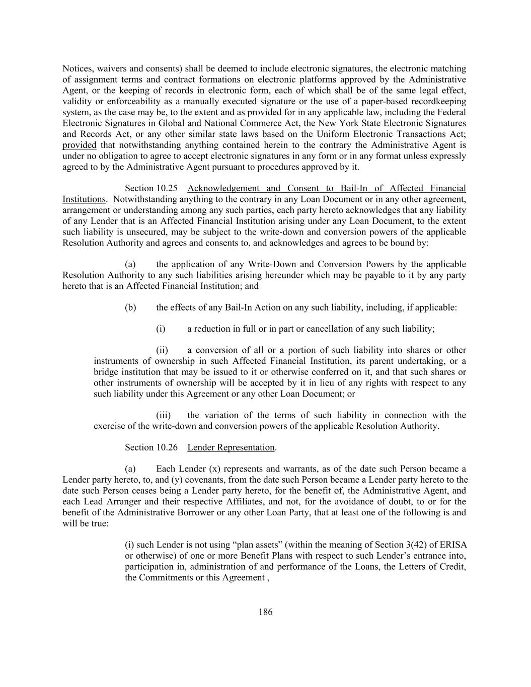 Notices, waivers and consents) shall be deemed to include electronic signatures, the electronic matching of assignment terms and contract formations on electronic platforms approved by the Administrative Agent, or the keeping of records in electronic form, each of which shall be of the same legal effect, validity or enforceability as a manually executed signature or the use of a paper-based recordkeeping system, as the case may be, to the extent and as provided for in any applicable law, including the Federal Electronic Signatures in Global and National Commerce Act, the New York State Electronic Signatures and Records Act, or any other similar state laws based on the Uniform Electronic Transactions Act; provided that notwithstanding anything contained herein to the contrary the Administrative Agent is under no obligation to agree to accept electronic signatures in any form or in any format unless expressly agreed to by the Administrative Agent pursuant to procedures approved by it. Section 10.25 Acknowledgement and Consent to Bail-In of Affected Financial Institutions. Notwithstanding anything to the contrary in any Loan Document or in any other agreement, arrangement or understanding among any such parties, each party hereto acknowledges that any liability of any Lender that is an Affected Financial Institution arising under any Loan Document, to the extent such liability is unsecured, may be subject to the write-down and conversion powers of the applicable Resolution Authority and agrees and consents to, and acknowledges and agrees to be bound by: (a) the application of any Write-Down and Conversion Powers by the applicable Resolution Authority to any such liabilities arising hereunder which may be payable to it by any party hereto that is an Affected Financial Institution; and (b) the effects of any Bail-In Action on any such liability, including, if applicable: (i) a reduction in full or in part or cancellation of any such liability; (ii) a conversion of all or a portion of such liability into shares or other instruments of ownership in such Affected Financial Institution, its parent undertaking, or a bridge institution that may be issued to it or otherwise conferred on it, and that such shares or other instruments of ownership will be accepted by it in lieu of any rights with respect to any such liability under this Agreement or any other Loan Document; or (iii) the variation of the terms of such liability in connection with the exercise of the write-down and conversion powers of the applicable Resolution Authority. Section 10.26 Lender Representation. (a) Each Lender (x) represents and warrants, as of the date such Person became a Lender party hereto, to, and (y) covenants, from the date such Person became a Lender party hereto to the date such Person ceases being a Lender party hereto, for the benefit of, the Administrative Agent, and each Lead Arranger and their respective Affiliates, and not, for the avoidance of doubt, to or for the benefit of the Administrative Borrower or any other Loan Party, that at least one of the following is and will be true: (i) such Lender is not using “plan assets” (within the meaning of Section 3(42) of ERISA or otherwise) of one or more Benefit Plans with respect to such Lender’s entrance into, participation in, administration of and performance of the Loans, the Letters of Credit, the Commitments or this Agreement , 186