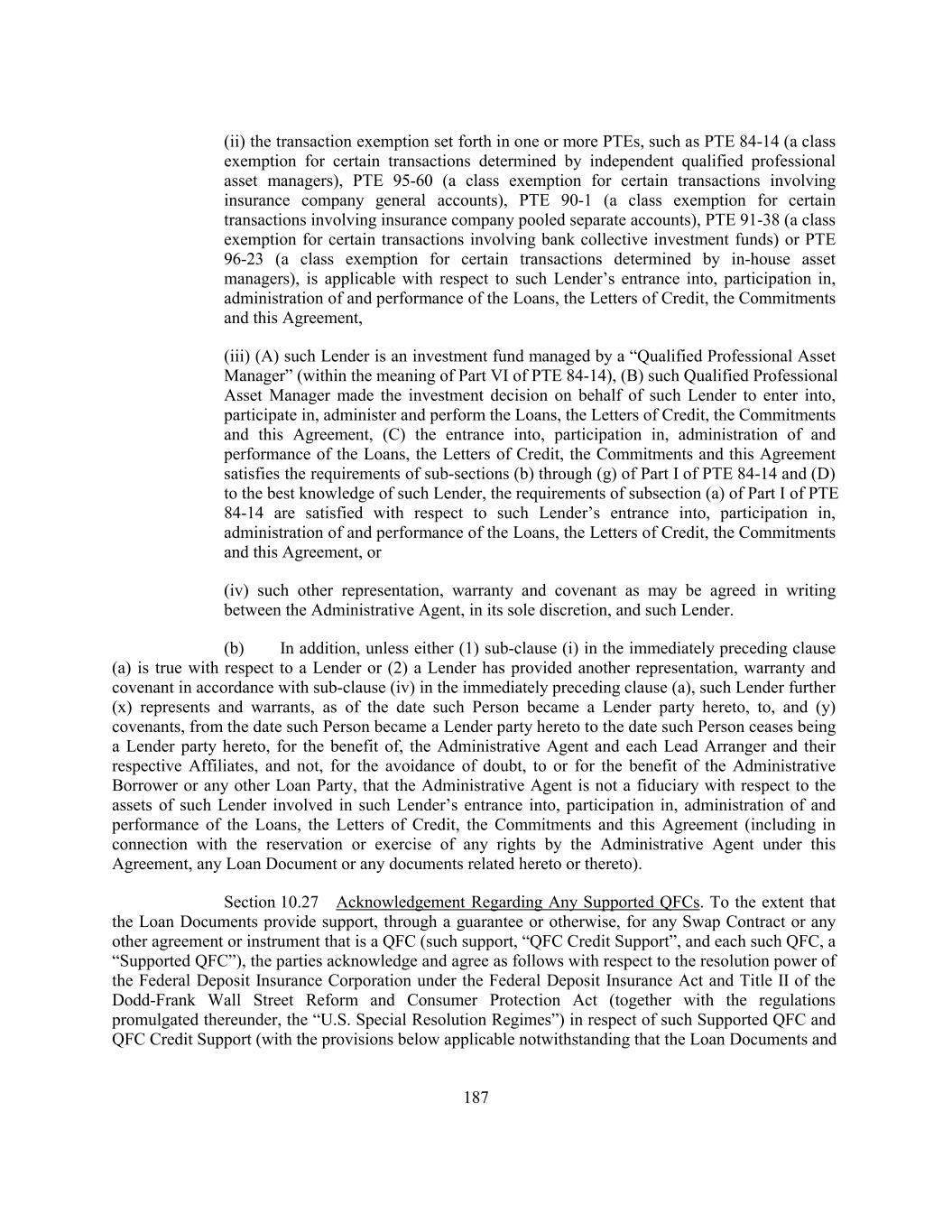 (ii) the transaction exemption set forth in one or more PTEs, such as PTE 84-14 (a class exemption for certain transactions determined by independent qualified professional asset managers), PTE 95-60 (a class exemption for certain transactions involving insurance company general accounts), PTE 90-1 (a class exemption for certain transactions involving insurance company pooled separate accounts), PTE 91-38 (a class exemption for certain transactions involving bank collective investment funds) or PTE 96-23 (a class exemption for certain transactions determined by in-house asset managers), is applicable with respect to such Lender’s entrance into, participation in, administration of and performance of the Loans, the Letters of Credit, the Commitments and this Agreement, (iii) (A) such Lender is an investment fund managed by a “Qualified Professional Asset Manager” (within the meaning of Part VI of PTE 84-14), (B) such Qualified Professional Asset Manager made the investment decision on behalf of such Lender to enter into, participate in, administer and perform the Loans, the Letters of Credit, the Commitments and this Agreement, (C) the entrance into, participation in, administration of and performance of the Loans, the Letters of Credit, the Commitments and this Agreement satisfies the requirements of sub-sections (b) through (g) of Part I of PTE 84-14 and (D) to the best knowledge of such Lender, the requirements of subsection (a) of Part I of PTE 84-14 are satisfied with respect to such Lender’s entrance into, participation in, administration of and performance of the Loans, the Letters of Credit, the Commitments and this Agreement, or (iv) such other representation, warranty and covenant as may be agreed in writing between the Administrative Agent, in its sole discretion, and such Lender. (b) In addition, unless either (1) sub-clause (i) in the immediately preceding clause (a) is true with respect to a Lender or (2) a Lender has provided another representation, warranty and covenant in accordance with sub-clause (iv) in the immediately preceding clause (a), such Lender further (x) represents and warrants, as of the date such Person became a Lender party hereto, to, and (y) covenants, from the date such Person became a Lender party hereto to the date such Person ceases being a Lender party hereto, for the benefit of, the Administrative Agent and each Lead Arranger and their respective Affiliates, and not, for the avoidance of doubt, to or for the benefit of the Administrative Borrower or any other Loan Party, that the Administrative Agent is not a fiduciary with respect to the assets of such Lender involved in such Lender’s entrance into, participation in, administration of and performance of the Loans, the Letters of Credit, the Commitments and this Agreement (including in connection with the reservation or exercise of any rights by the Administrative Agent under this Agreement, any Loan Document or any documents related hereto or thereto). Section 10.27 Acknowledgement Regarding Any Supported QFCs. To the extent that the Loan Documents provide support, through a guarantee or otherwise, for any Swap Contract or any other agreement or instrument that is a QFC (such support, “QFC Credit Support”, and each such QFC, a “Supported QFC”), the parties acknowledge and agree as follows with respect to the resolution power of the Federal Deposit Insurance Corporation under the Federal Deposit Insurance Act and Title II of the Dodd-Frank Wall Street Reform and Consumer Protection Act (together with the regulations promulgated thereunder, the “U.S. Special Resolution Regimes”) in respect of such Supported QFC and QFC Credit Support (with the provisions below applicable notwithstanding that the Loan Documents and 187