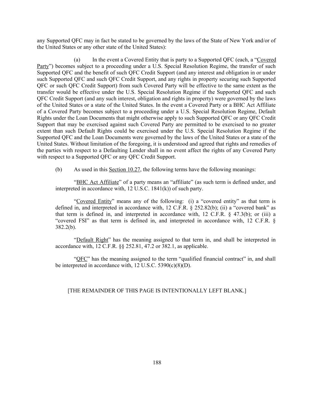 any Supported QFC may in fact be stated to be governed by the laws of the State of New York and/or of the United States or any other state of the United States): (a) In the event a Covered Entity that is party to a Supported QFC (each, a “Covered Party”) becomes subject to a proceeding under a U.S. Special Resolution Regime, the transfer of such Supported QFC and the benefit of such QFC Credit Support (and any interest and obligation in or under such Supported QFC and such QFC Credit Support, and any rights in property securing such Supported QFC or such QFC Credit Support) from such Covered Party will be effective to the same extent as the transfer would be effective under the U.S. Special Resolution Regime if the Supported QFC and such QFC Credit Support (and any such interest, obligation and rights in property) were governed by the laws of the United States or a state of the United States. In the event a Covered Party or a BHC Act Affiliate of a Covered Party becomes subject to a proceeding under a U.S. Special Resolution Regime, Default Rights under the Loan Documents that might otherwise apply to such Supported QFC or any QFC Credit Support that may be exercised against such Covered Party are permitted to be exercised to no greater extent than such Default Rights could be exercised under the U.S. Special Resolution Regime if the Supported QFC and the Loan Documents were governed by the laws of the United States or a state of the United States. Without limitation of the foregoing, it is understood and agreed that rights and remedies of the parties with respect to a Defaulting Lender shall in no event affect the rights of any Covered Party with respect to a Supported QFC or any QFC Credit Support. (b) As used in this Section 10.27, the following terms have the following meanings: “BHC Act Affiliate” of a party means an “affiliate” (as such term is defined under, and interpreted in accordance with, 12 U.S.C. 1841(k)) of such party. “Covered Entity” means any of the following: (i) a “covered entity” as that term is defined in, and interpreted in accordance with, 12 C.F.R. § 252.82(b); (ii) a “covered bank” as that term is defined in, and interpreted in accordance with, 12 C.F.R. § 47.3(b); or (iii) a “covered FSI” as that term is defined in, and interpreted in accordance with, 12 C.F.R. § 382.2(b). “Default Right” has the meaning assigned to that term in, and shall be interpreted in accordance with, 12 C.F.R. §§ 252.81, 47.2 or 382.1, as applicable. “QFC” has the meaning assigned to the term “qualified financial contract” in, and shall be interpreted in accordance with, 12 U.S.C. 5390(c)(8)(D). [THE REMAINDER OF THIS PAGE IS INTENTIONALLY LEFT BLANK.] 188