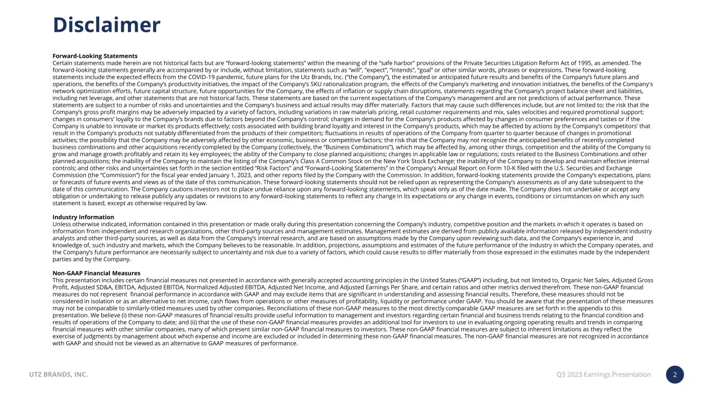 UTZ BRANDS, INC. Q3 2023 Earnings Presentation 2 Disclaimer Forward-Looking Statements Certain statements made herein are not historical facts but are “forward-looking statements” within the meaning of the “safe harbor” provisions of the Private Securities Litigation Reform Act of 1995, as amended. The forward-looking statements generally are accompanied by or include, without limitation, statements such as “will”, “expect”, “intends”, “goal” or other similar words, phrases or expressions. These forward-looking statements include the expected effects from the COVID-19 pandemic, future plans for the Utz Brands, Inc. (“the Company”), the estimated or anticipated future results and benefits of the Company’s future plans and operations, the benefits of the Company’s productivity initiatives, the impact of the Company’s SKU rationalization program, the effects of the Company’s marketing and innovation initiatives, the benefits of the Company's network optimization efforts, future capital structure, future opportunities for the Company, the effects of inflation or supply chain disruptions, statements regarding the Company’s project balance sheet and liabilities, including net leverage, and other statements that are not historical facts. These statements are based on the current expectations of the Company’s management and are not predictions of actual performance. These statements are subject to a number of risks and uncertainties and the Company’s business and actual results may differ materially. Factors that may cause such differences include, but are not limited to: the risk that the Company’s gross profit margins may be adversely impacted by a variety of factors, including variations in raw materials pricing, retail customer requirements and mix, sales velocities and required promotional support; changes in consumers’ loyalty to the Company’s brands due to factors beyond the Company’s control; changes in demand for the Company’s products affected by changes in consumer preferences and tastes or if the Company is unable to innovate or market its products effectively; costs associated with building brand loyalty and interest in the Company’s products, which may be affected by actions by the Company’s competitors’ that result in the Company’s products not suitably differentiated from the products of their competitors; fluctuations in results of operations of the Company from quarter to quarter because of changes in promotional activities; the possibility that the Company may be adversely affected by other economic, business or competitive factors; the risk that the Company may not recognize the anticipated benefits of recently completed business combinations and other acquisitions recently completed by the Company (collectively, the “Business Combinations”), which may be affected by, among other things, competition and the ability of the Company to grow and manage growth profitably and retain its key employees; the ability of the Company to close planned acquisitions; changes in applicable law or regulations; costs related to the Business Combinations and other planned acquisitions; the inability of the Company to maintain the listing of the Company’s Class A Common Stock on the New York Stock Exchange; the inability of the Company to develop and maintain effective internal controls; and other risks and uncertainties set forth in the section entitled “Risk Factors” and “Forward-Looking Statements” in the Company’s Annual Report on Form 10-K filed with the U.S. Securities and Exchange Commission (the “Commission”) for the fiscal year ended January 1, 2023, and other reports filed by the Company with the Commission. In addition, forward-looking statements provide the Company’s expectations, plans or forecasts of future events and views as of the date of this communication. These forward-looking statements should not be relied upon as representing the Company’s assessments as of any date subsequent to the date of this communication. The Company cautions investors not to place undue reliance upon any forward-looking statements, which speak only as of the date made. The Company does not undertake or accept any obligation or undertaking to release publicly any updates or revisions to any forward-looking statements to reflect any change in its expectations or any change in events, conditions or circumstances on which any such statement is based, except as otherwise required by law. Industry Information Unless otherwise indicated, information contained in this presentation or made orally during this presentation concerning the Company’s industry, competitive position and the markets in which it operates is based on information from independent and research organizations, other third-party sources and management estimates. Management estimates are derived from publicly available information released by independent industry analysts and other third-party sources, as well as data from the Company’s internal research, and are based on assumptions made by the Company upon reviewing such data, and the Company’s experience in, and knowledge of, such industry and markets, which the Company believes to be reasonable. In addition, projections, assumptions and estimates of the future performance of the industry in which the Company operates, and the Company’s future performance are necessarily subject to uncertainty and risk due to a variety of factors, which could cause results to differ materially from those expressed in the estimates made by the independent parties and by the Company. Non-GAAP Financial Measures This presentation includes certain financial measures not presented in accordance with generally accepted accounting principles in the United States (“GAAP”) including, but not limited to, Organic Net Sales, Adjusted Gross Profit, Adjusted SD&A, EBITDA, Adjusted EBITDA, Normalized Adjusted EBITDA, Adjuste