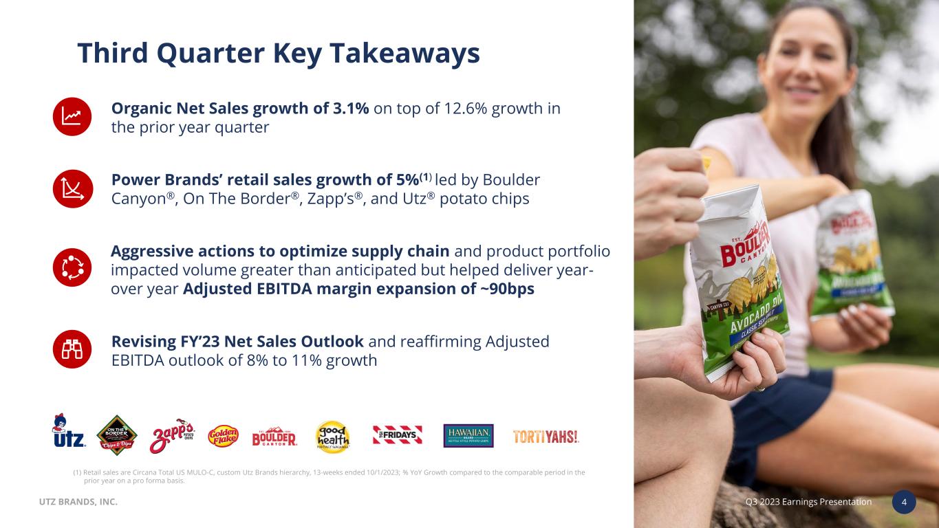 UTZ BRANDS, INC. Q3 2023 Earnings Presentation 2 Disclaimer Forward-Looking Statements Certain statements made herein are not historical facts but are “forward-looking statements” within the meaning of the “safe harbor” provisions of the Private Securities Litigation Reform Act of 1995, as amended. The forward-looking statements generally are accompanied by or include, without limitation, statements such as “will”, “expect”, “intends”, “goal” or other similar words, phrases or expressions. These forward-looking statements include the expected effects from the COVID-19 pandemic, future plans for the Utz Brands, Inc. (“the Company”), the estimated or anticipated future results and benefits of the Company’s future plans and operations, the benefits of the Company’s productivity initiatives, the impact of the Company’s SKU rationalization program, the effects of the Company’s marketing and innovation initiatives, the benefits of the Company's network optimization efforts, future capital structure, future opportunities for the Company, the effects of inflation or supply chain disruptions, statements regarding the Company’s project balance sheet and liabilities, including net leverage, and other statements that are not historical facts. These statements are based on the current expectations of the Company’s management and are not predictions of actual performance. These statements are subject to a number of risks and uncertainties and the Company’s business and actual results may differ materially. Factors that may cause such differences include, but are not limited to: the risk that the Company’s gross profit margins may be adversely impacted by a variety of factors, including variations in raw materials pricing, retail customer requirements and mix, sales velocities and required promotional support; changes in consumers’ loyalty to the Company’s brands due to factors beyond the Company’s control; changes in demand for the Company’s products affected by changes in consumer preferences and tastes or if the Company is unable to innovate or market its products effectively; costs associated with building brand loyalty and interest in the Company’s products, which may be affected by actions by the Company’s competitors’ that result in the Company’s products not suitably differentiated from the products of their competitors; fluctuations in results of operations of the Company from quarter to quarter because of changes in promotional activities; the possibility that the Company may be adversely affected by other economic, business or competitive factors; the risk that the Company may not recognize the anticipated benefits of recently completed business combinations and other acquisitions recently completed by the Company (collectively, the “Business Combinations”), which may be affected by, among other things, competition and the ability of the Company to grow and manage growth profitably and retain its key employees; the ability of the Company to close planned acquisitions; changes in applicable law or regulations; costs related to the Business Combinations and other planned acquisitions; the inability of the Company to maintain the listing of the Company’s Class A Common Stock on the New York Stock Exchange; the inability of the Company to develop and maintain effective internal controls; and other risks and uncertainties set forth in the section entitled “Risk Factors” and “Forward-Looking Statements” in the Company’s Annual Report on Form 10-K filed with the U.S. Securities and Exchange Commission (the “Commission”) for the fiscal year ended January 1, 2023, and other reports filed by the Company with the Commission. In addition, forward-looking statements provide the Company’s expectations, plans or forecasts of future events and views as of the date of this communication. These forward-looking statements should not be relied upon as representing the Company’s assessments as of any date subsequent to the date of this communication. The Company cautions investors not to place undue reliance upon any forward-looking statements, which speak only as of the date made. The Company does not undertake or accept any obligation or undertaking to release publicly any updates or revisions to any forward-looking statements to reflect any change in its expectations or any change in events, conditions or circumstances on which any such statement is based, except as otherwise required by law. Industry Information Unless otherwise indicated, information contained in this presentation or made orally during this presentation concerning the Company’s industry, competitive position and the markets in which it operates is based on information from independent and research organizations, other third-party sources and management estimates. Management estimates are derived from publicly available information released by independent industry analysts and other third-party sources, as well as data from the Company’s internal research, and are based on assumptions made by the Company upon reviewing such data, and the Company’s experience in, and knowledge of, such industry and markets, which the Company believes to be reasonable. In addition, projections, assumptions and estimates of the future performance of the industry in which the Company operates, and the Company’s future performance are necessarily subject to uncertainty and risk due to a variety of factors, which could cause results to differ materially from those expressed in the estimates made by the independent parties and by the Company. Non-GAAP Financial Measures This presentation includes certain financial measures not presented in accordance with generally accepted accounting principles in the United States (“GAAP”) including, but not limited to, Organic Net Sales, Adjusted Gross Profit, Adjusted SD&A, EBITDA, Adjusted EBITDA, Normalized Adjusted EBITDA, Adjuste
