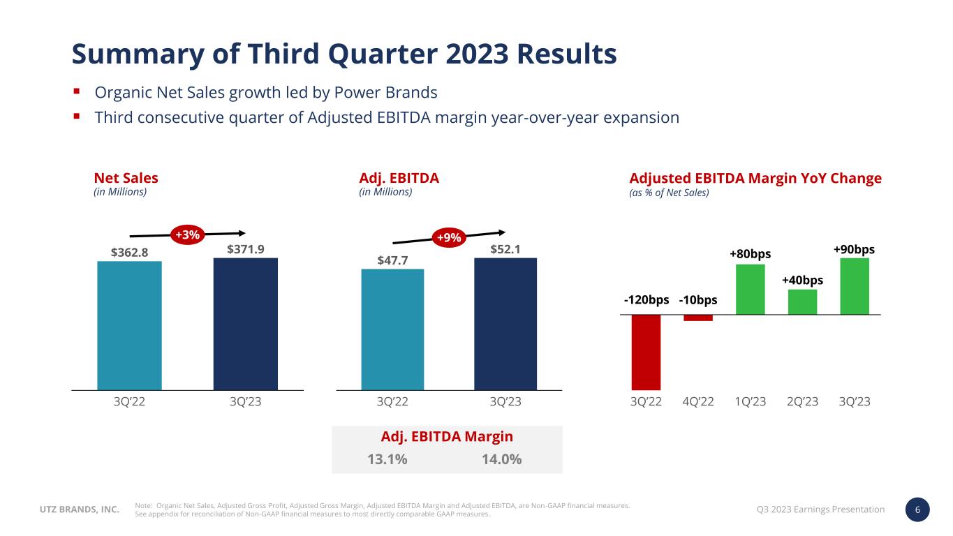 UTZ BRANDS, INC. Q3 2023 Earnings Presentation 2 Disclaimer Forward-Looking Statements Certain statements made herein are not historical facts but are “forward-looking statements” within the meaning of the “safe harbor” provisions of the Private Securities Litigation Reform Act of 1995, as amended. The forward-looking statements generally are accompanied by or include, without limitation, statements such as “will”, “expect”, “intends”, “goal” or other similar words, phrases or expressions. These forward-looking statements include the expected effects from the COVID-19 pandemic, future plans for the Utz Brands, Inc. (“the Company”), the estimated or anticipated future results and benefits of the Company’s future plans and operations, the benefits of the Company’s productivity initiatives, the impact of the Company’s SKU rationalization program, the effects of the Company’s marketing and innovation initiatives, the benefits of the Company's network optimization efforts, future capital structure, future opportunities for the Company, the effects of inflation or supply chain disruptions, statements regarding the Company’s project balance sheet and liabilities, including net leverage, and other statements that are not historical facts. These statements are based on the current expectations of the Company’s management and are not predictions of actual performance. These statements are subject to a number of risks and uncertainties and the Company’s business and actual results may differ materially. Factors that may cause such differences include, but are not limited to: the risk that the Company’s gross profit margins may be adversely impacted by a variety of factors, including variations in raw materials pricing, retail customer requirements and mix, sales velocities and required promotional support; changes in consumers’ loyalty to the Company’s brands due to factors beyond the Company’s control; changes in demand for the Company’s products affected by changes in consumer preferences and tastes or if the Company is unable to innovate or market its products effectively; costs associated with building brand loyalty and interest in the Company’s products, which may be affected by actions by the Company’s competitors’ that result in the Company’s products not suitably differentiated from the products of their competitors; fluctuations in results of operations of the Company from quarter to quarter because of changes in promotional activities; the possibility that the Company may be adversely affected by other economic, business or competitive factors; the risk that the Company may not recognize the anticipated benefits of recently completed business combinations and other acquisitions recently completed by the Company (collectively, the “Business Combinations”), which may be affected by, among other things, competition and the ability of the Company to grow and manage growth profitably and retain its key employees; the ability of the Company to close planned acquisitions; changes in applicable law or regulations; costs related to the Business Combinations and other planned acquisitions; the inability of the Company to maintain the listing of the Company’s Class A Common Stock on the New York Stock Exchange; the inability of the Company to develop and maintain effective internal controls; and other risks and uncertainties set forth in the section entitled “Risk Factors” and “Forward-Looking Statements” in the Company’s Annual Report on Form 10-K filed with the U.S. Securities and Exchange Commission (the “Commission”) for the fiscal year ended January 1, 2023, and other reports filed by the Company with the Commission. In addition, forward-looking statements provide the Company’s expectations, plans or forecasts of future events and views as of the date of this communication. These forward-looking statements should not be relied upon as representing the Company’s assessments as of any date subsequent to the date of this communication. The Company cautions investors not to place undue reliance upon any forward-looking statements, which speak only as of the date made. The Company does not undertake or accept any obligation or undertaking to release publicly any updates or revisions to any forward-looking statements to reflect any change in its expectations or any change in events, conditions or circumstances on which any such statement is based, except as otherwise required by law. Industry Information Unless otherwise indicated, information contained in this presentation or made orally during this presentation concerning the Company’s industry, competitive position and the markets in which it operates is based on information from independent and research organizations, other third-party sources and management estimates. Management estimates are derived from publicly available information released by independent industry analysts and other third-party sources, as well as data from the Company’s internal research, and are based on assumptions made by the Company upon reviewing such data, and the Company’s experience in, and knowledge of, such industry and markets, which the Company believes to be reasonable. In addition, projections, assumptions and estimates of the future performance of the industry in which the Company operates, and the Company’s future performance are necessarily subject to uncertainty and risk due to a variety of factors, which could cause results to differ materially from those expressed in the estimates made by the independent parties and by the Company. Non-GAAP Financial Measures This presentation includes certain financial measures not presented in accordance with generally accepted accounting principles in the United States (“GAAP”) including, but not limited to, Organic Net Sales, Adjusted Gross Profit, Adjusted SD&A, EBITDA, Adjusted EBITDA, Normalized Adjusted EBITDA, Adjuste