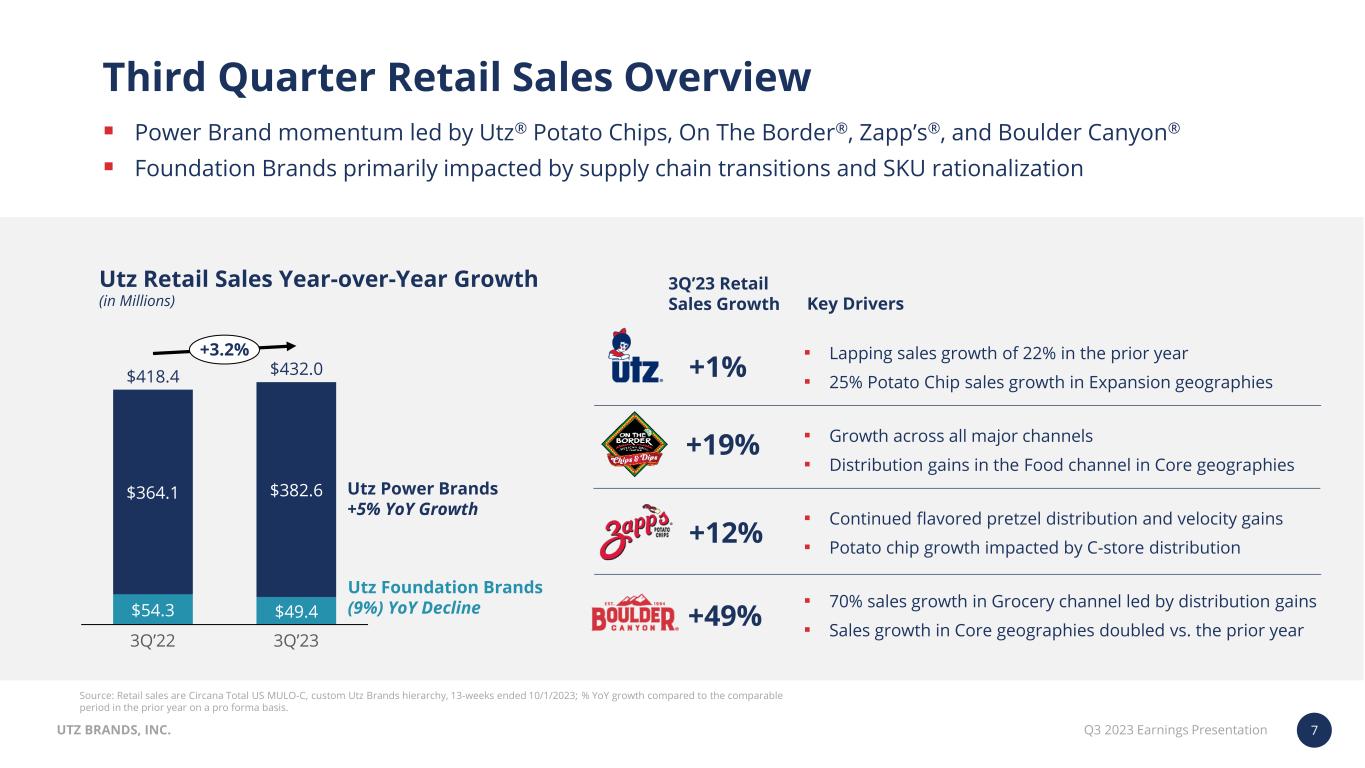 UTZ BRANDS, INC. Q3 2023 Earnings Presentation 2 Disclaimer Forward-Looking Statements Certain statements made herein are not historical facts but are “forward-looking statements” within the meaning of the “safe harbor” provisions of the Private Securities Litigation Reform Act of 1995, as amended. The forward-looking statements generally are accompanied by or include, without limitation, statements such as “will”, “expect”, “intends”, “goal” or other similar words, phrases or expressions. These forward-looking statements include the expected effects from the COVID-19 pandemic, future plans for the Utz Brands, Inc. (“the Company”), the estimated or anticipated future results and benefits of the Company’s future plans and operations, the benefits of the Company’s productivity initiatives, the impact of the Company’s SKU rationalization program, the effects of the Company’s marketing and innovation initiatives, the benefits of the Company's network optimization efforts, future capital structure, future opportunities for the Company, the effects of inflation or supply chain disruptions, statements regarding the Company’s project balance sheet and liabilities, including net leverage, and other statements that are not historical facts. These statements are based on the current expectations of the Company’s management and are not predictions of actual performance. These statements are subject to a number of risks and uncertainties and the Company’s business and actual results may differ materially. Factors that may cause such differences include, but are not limited to: the risk that the Company’s gross profit margins may be adversely impacted by a variety of factors, including variations in raw materials pricing, retail customer requirements and mix, sales velocities and required promotional support; changes in consumers’ loyalty to the Company’s brands due to factors beyond the Company’s control; changes in demand for the Company’s products affected by changes in consumer preferences and tastes or if the Company is unable to innovate or market its products effectively; costs associated with building brand loyalty and interest in the Company’s products, which may be affected by actions by the Company’s competitors’ that result in the Company’s products not suitably differentiated from the products of their competitors; fluctuations in results of operations of the Company from quarter to quarter because of changes in promotional activities; the possibility that the Company may be adversely affected by other economic, business or competitive factors; the risk that the Company may not recognize the anticipated benefits of recently completed business combinations and other acquisitions recently completed by the Company (collectively, the “Business Combinations”), which may be affected by, among other things, competition and the ability of the Company to grow and manage growth profitably and retain its key employees; the ability of the Company to close planned acquisitions; changes in applicable law or regulations; costs related to the Business Combinations and other planned acquisitions; the inability of the Company to maintain the listing of the Company’s Class A Common Stock on the New York Stock Exchange; the inability of the Company to develop and maintain effective internal controls; and other risks and uncertainties set forth in the section entitled “Risk Factors” and “Forward-Looking Statements” in the Company’s Annual Report on Form 10-K filed with the U.S. Securities and Exchange Commission (the “Commission”) for the fiscal year ended January 1, 2023, and other reports filed by the Company with the Commission. In addition, forward-looking statements provide the Company’s expectations, plans or forecasts of future events and views as of the date of this communication. These forward-looking statements should not be relied upon as representing the Company’s assessments as of any date subsequent to the date of this communication. The Company cautions investors not to place undue reliance upon any forward-looking statements, which speak only as of the date made. The Company does not undertake or accept any obligation or undertaking to release publicly any updates or revisions to any forward-looking statements to reflect any change in its expectations or any change in events, conditions or circumstances on which any such statement is based, except as otherwise required by law. Industry Information Unless otherwise indicated, information contained in this presentation or made orally during this presentation concerning the Company’s industry, competitive position and the markets in which it operates is based on information from independent and research organizations, other third-party sources and management estimates. Management estimates are derived from publicly available information released by independent industry analysts and other third-party sources, as well as data from the Company’s internal research, and are based on assumptions made by the Company upon reviewing such data, and the Company’s experience in, and knowledge of, such industry and markets, which the Company believes to be reasonable. In addition, projections, assumptions and estimates of the future performance of the industry in which the Company operates, and the Company’s future performance are necessarily subject to uncertainty and risk due to a variety of factors, which could cause results to differ materially from those expressed in the estimates made by the independent parties and by the Company. Non-GAAP Financial Measures This presentation includes certain financial measures not presented in accordance with generally accepted accounting principles in the United States (“GAAP”) including, but not limited to, Organic Net Sales, Adjusted Gross Profit, Adjusted SD&A, EBITDA, Adjusted EBITDA, Normalized Adjusted EBITDA, Adjuste