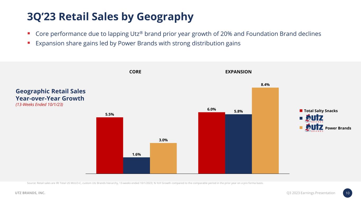 3Q’23 Retail Sales by Sub-Category Total Sub-Category Sub-Category Retail Sales Year-over-Year Growth (13-Weeks Ended 10/1/23) Source: Retail sale are Circana Total US MULO-C, custom Utz Brands hierarchy, 13-weeks ended 10/1/2023; % YoY growth compared to the comparable period in the prior year on a pro forma basis. (1) Based on Salty Snacks and Dips MULO+C Total US IRI data for 52-weeks ended 10/1/2023. Pro forma for acquisitions. UTZ BRANDS, INC. Q3 2023 Earnings Presentation 9 6.5% 3.4% 7.7% 15.4% 7.1% 5.6% 5.6% -5.4% -2.1% -9.4% -0.8% -2.5% -3.9% 1.8% Potato Chips Tortilla Chips Pretzels Cheese Snacks Salsa Queso Pork Rinds ▪ Delivering growth across our three largest sub-categories ▪ Cheese impacted by lapping Mass channel promotional features; Pork performance is being addressed 40% 19% 12% 8% 6% 4% 11% Potato Chips Tortilla Chips Pretzels Cheese Dips Pork Other Retail Sales Breakdown(1) By Product Type Lapping Utz Salsa and Queso prior year growth of 22% and 65%, respectively