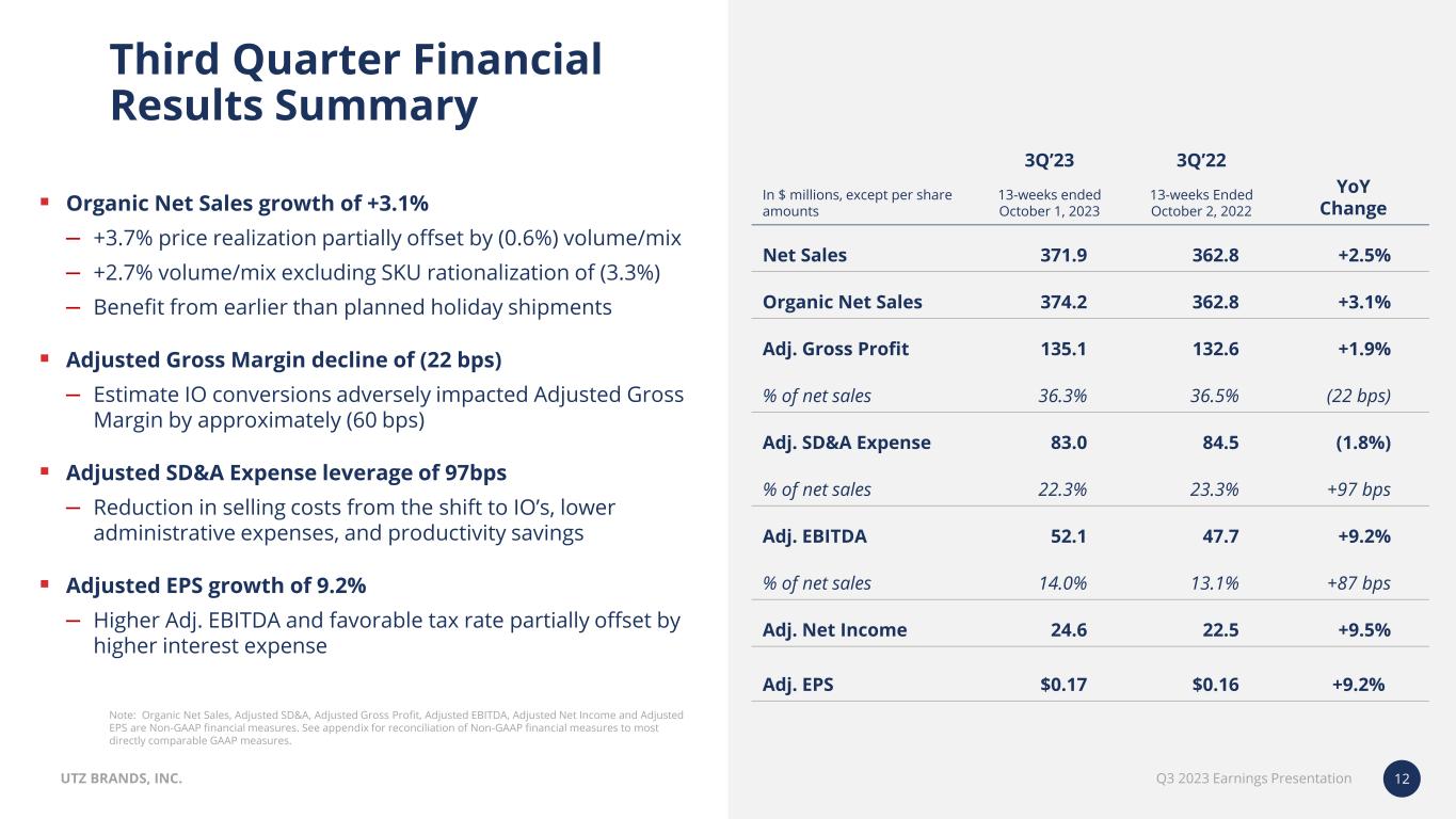 UTZ BRANDS, INC. Q3 2023 Earnings Presentation 2 Disclaimer Forward-Looking Statements Certain statements made herein are not historical facts but are “forward-looking statements” within the meaning of the “safe harbor” provisions of the Private Securities Litigation Reform Act of 1995, as amended. The forward-looking statements generally are accompanied by or include, without limitation, statements such as “will”, “expect”, “intends”, “goal” or other similar words, phrases or expressions. These forward-looking statements include the expected effects from the COVID-19 pandemic, future plans for the Utz Brands, Inc. (“the Company”), the estimated or anticipated future results and benefits of the Company’s future plans and operations, the benefits of the Company’s productivity initiatives, the impact of the Company’s SKU rationalization program, the effects of the Company’s marketing and innovation initiatives, the benefits of the Company's network optimization efforts, future capital structure, future opportunities for the Company, the effects of inflation or supply chain disruptions, statements regarding the Company’s project balance sheet and liabilities, including net leverage, and other statements that are not historical facts. These statements are based on the current expectations of the Company’s management and are not predictions of actual performance. These statements are subject to a number of risks and uncertainties and the Company’s business and actual results may differ materially. Factors that may cause such differences include, but are not limited to: the risk that the Company’s gross profit margins may be adversely impacted by a variety of factors, including variations in raw materials pricing, retail customer requirements and mix, sales velocities and required promotional support; changes in consumers’ loyalty to the Company’s brands due to factors beyond the Company’s control; changes in demand for the Company’s products affected by changes in consumer preferences and tastes or if the Company is unable to innovate or market its products effectively; costs associated with building brand loyalty and interest in the Company’s products, which may be affected by actions by the Company’s competitors’ that result in the Company’s products not suitably differentiated from the products of their competitors; fluctuations in results of operations of the Company from quarter to quarter because of changes in promotional activities; the possibility that the Company may be adversely affected by other economic, business or competitive factors; the risk that the Company may not recognize the anticipated benefits of recently completed business combinations and other acquisitions recently completed by the Company (collectively, the “Business Combinations”), which may be affected by, among other things, competition and the ability of the Company to grow and manage growth profitably and retain its key employees; the ability of the Company to close planned acquisitions; changes in applicable law or regulations; costs related to the Business Combinations and other planned acquisitions; the inability of the Company to maintain the listing of the Company’s Class A Common Stock on the New York Stock Exchange; the inability of the Company to develop and maintain effective internal controls; and other risks and uncertainties set forth in the section entitled “Risk Factors” and “Forward-Looking Statements” in the Company’s Annual Report on Form 10-K filed with the U.S. Securities and Exchange Commission (the “Commission”) for the fiscal year ended January 1, 2023, and other reports filed by the Company with the Commission. In addition, forward-looking statements provide the Company’s expectations, plans or forecasts of future events and views as of the date of this communication. These forward-looking statements should not be relied upon as representing the Company’s assessments as of any date subsequent to the date of this communication. The Company cautions investors not to place undue reliance upon any forward-looking statements, which speak only as of the date made. The Company does not undertake or accept any obligation or undertaking to release publicly any updates or revisions to any forward-looking statements to reflect any change in its expectations or any change in events, conditions or circumstances on which any such statement is based, except as otherwise required by law. Industry Information Unless otherwise indicated, information contained in this presentation or made orally during this presentation concerning the Company’s industry, competitive position and the markets in which it operates is based on information from independent and research organizations, other third-party sources and management estimates. Management estimates are derived from publicly available information released by independent industry analysts and other third-party sources, as well as data from the Company’s internal research, and are based on assumptions made by the Company upon reviewing such data, and the Company’s experience in, and knowledge of, such industry and markets, which the Company believes to be reasonable. In addition, projections, assumptions and estimates of the future performance of the industry in which the Company operates, and the Company’s future performance are necessarily subject to uncertainty and risk due to a variety of factors, which could cause results to differ materially from those expressed in the estimates made by the independent parties and by the Company. Non-GAAP Financial Measures This presentation includes certain financial measures not presented in accordance with generally accepted accounting principles in the United States (“GAAP”) including, but not limited to, Organic Net Sales, Adjusted Gross Profit, Adjusted SD&A, EBITDA, Adjusted EBITDA, Normalized Adjusted EBITDA, Adjuste
