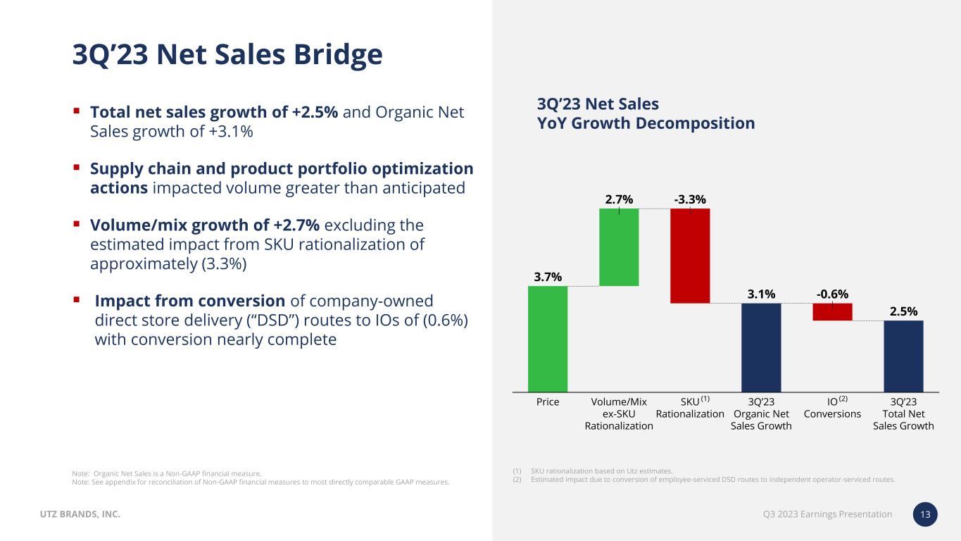 UTZ BRANDS, INC. Q3 2023 Earnings Presentation 12 Third Quarter Financial Results Summary Note: Organic Net Sales, Adjusted SD&A, Adjusted Gross Profit, Adjusted EBITDA, Adjusted Net Income and Adjusted EPS are Non-GAAP financial measures. See appendix for reconciliation of Non-GAAP financial measures to most directly comparable GAAP measures. 3Q’23 3Q’22 YoY Change In $ millions, except per share amounts 13-weeks ended October 1, 2023 13-weeks Ended October 2, 2022 Net Sales 371.9 362.8 +2.5% Organic Net Sales 374.2 362.8 +3.1% Adj. Gross Profit 135.1 132.6 +1.9% % of net sales 36.3% 36.5% (22 bps) Adj. SD&A Expense 83.0 84.5 (1.8%) % of net sales 22.3% 23.3% +97 bps Adj. EBITDA 52.1 47.7 +9.2% % of net sales 14.0% 13.1% +87 bps Adj. Net Income 24.6 22.5 +9.5% Adj. EPS $0.17 $0.16 +9.2% ▪ Organic Net Sales growth of +3.1% – +3.7% price realization partially offset by (0.6%) volume/mix – +2.7% volume/mix excluding SKU rationalization of (3.3%) – Benefit from earlier than planned holiday shipments ▪ Adjusted Gross Margin decline of (22 bps) – Estimate IO conversions adversely impacted Adjusted Gross Margin by approximately (60 bps) ▪ Adjusted SD&A Expense leverage of 97bps – Reduction in selling costs from the shift to IO’s, lower administrative expenses, and productivity savings ▪ Adjusted EPS growth of 9.2% – Higher Adj. EBITDA and favorable tax rate partially offset by higher interest expense