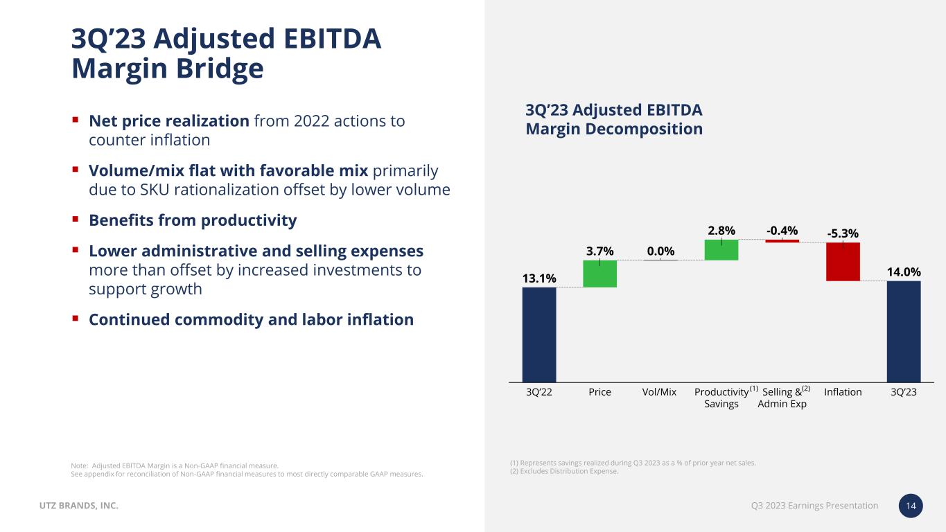 UTZ BRANDS, INC. Q3 2023 Earnings Presentation 13 ▪ Total net sales growth of +2.5% and Organic Net Sales growth of +3.1% ▪ Supply chain and product portfolio optimization actions impacted volume greater than anticipated ▪ Volume/mix growth of +2.7% excluding the estimated impact from SKU rationalization of approximately (3.3%) ▪ Impact from conversion of company-owned direct store delivery (“DSD”) routes to IOs of (0.6%) with conversion nearly complete 3Q’23 Net Sales Bridge 3Q’23 Net Sales YoY Growth Decomposition (1) SKU rationalization based on Utz estimates. (2) Estimated impact due to conversion of employee-serviced DSD routes to independent operator-serviced routes. -3.3% 3Q’23 Organic Net Sales Growth Volume/Mix ex-SKU Rationalization 3Q’23 Total Net Sales Growth Price 2.7% SKU Rationalization -0.6% IO Conversions 3.7% 3.1% 2.5% (1) Note: Organic Net Sales is a Non-GAAP financial measure. Note: See appendix for reconciliation of Non-GAAP financial measures to most directly comparable GAAP measures. (2)