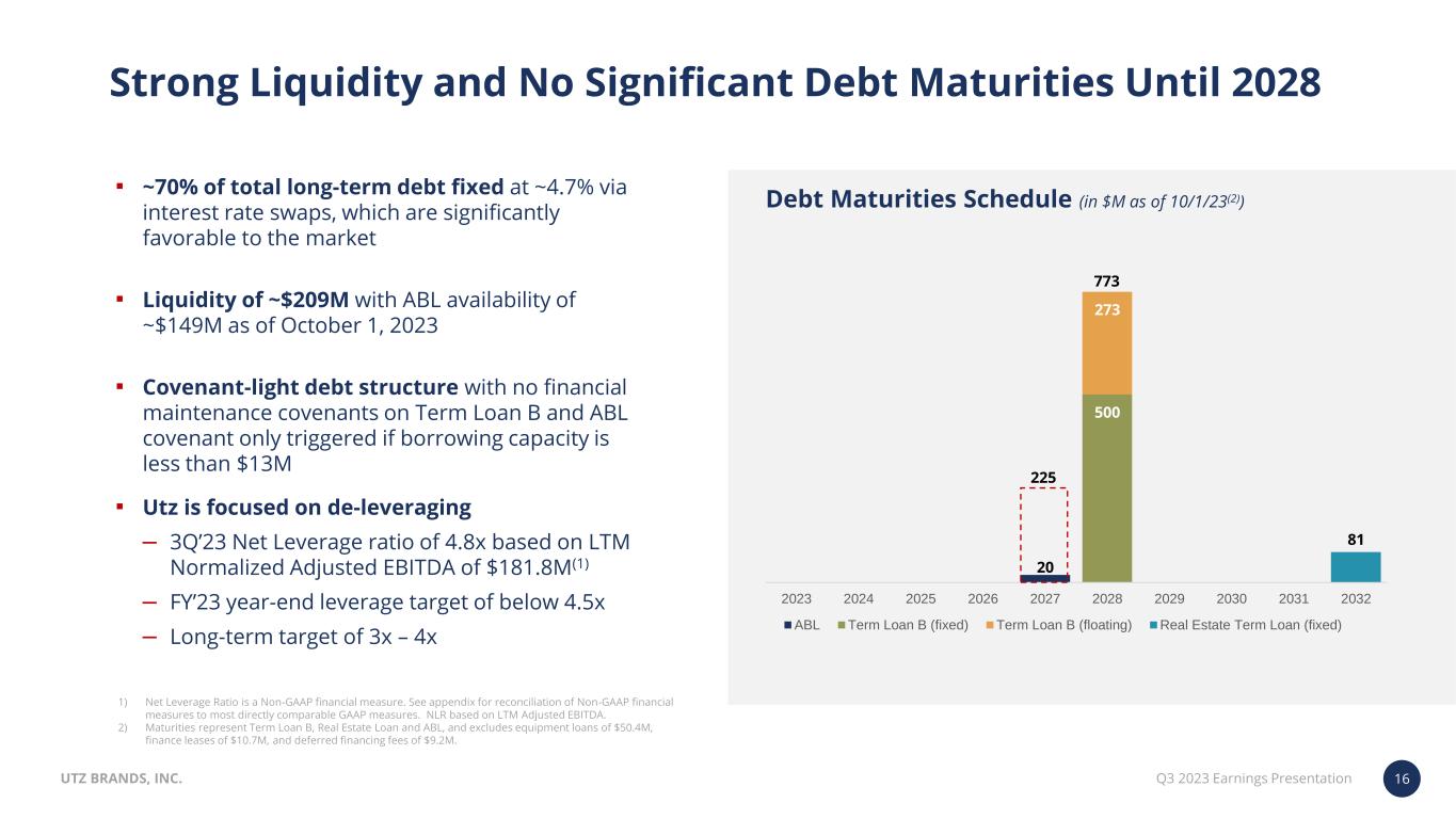 UTZ BRANDS, INC. Q3 2023 Earnings Presentation 15 Cash Flow and Balance Sheet Highlights Note: See appendix for reconciliation of Non-GAAP financial measures to most directly comparable GAAP measures. (1) Includes $10.1M of Distributions to Non-controlling Interest. (2) Includes Term Loan, ABL Facility and Capital Leases. Capital Leases include equipment term loans and excludes the impact of step-up accounting.​ (3) Net Leverage Ratio is a Non-GAAP financial measure and is based on Normalized Adjusted EBITDA of $181.8M. As of January 1, 2023 Cash Flow Highlights 39-Weeks Ended October 1, 2023 Net Cash From Operations $49.1M Capital Expenditures $45.7M Dividends and Distributions Paid(1) $24.1M Balance Sheet Highlights As October 1, 2023 Cash and Cash Equivalents $60.1M Gross Debt(2) $936.0M Net Debt $875.9M Net Leverage Ratio(3) 4.8x