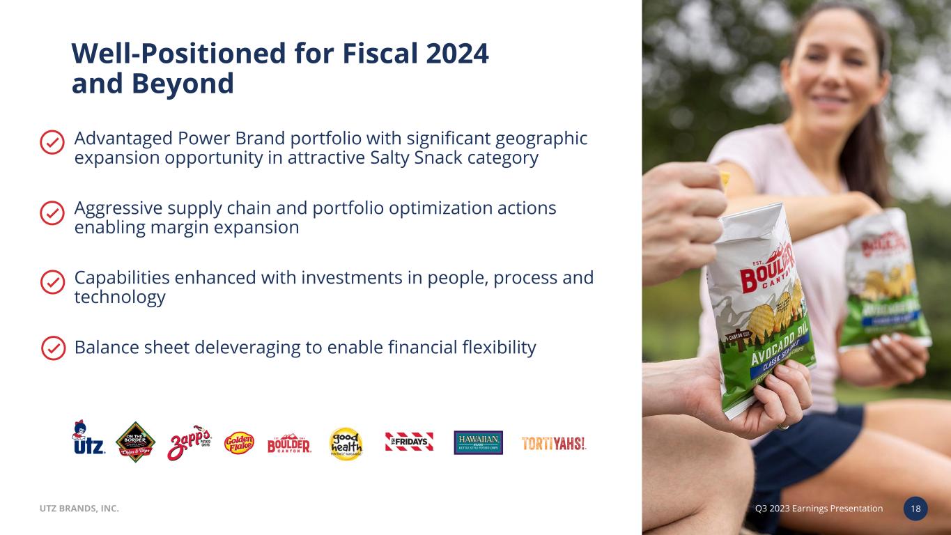 UTZ BRANDS, INC. Updating Fiscal 2023 Outlook Note: See appendix for reconciliation of Non-GAAP financial measures to most directly comparable GAAP measures. (1) Normalized GAAP basis tax expense, which excludes one-time items. Fiscal 2023 Growth versus Fiscal 2022 Actual Results Net Sales +2% to 3% Total growth (previously +3% to 5%) +3% to 4% Organic growth (previously +4% to 6%) ▪ Organic Net Sales growth led by price, and volume/mix modestly lower vs fiscal 2022 primarily due to SKU rationalization impact of (~300 bps) ▪ Sales growth supported by increased marketing and innovation, and continued distribution gains ▪ Estimated IO route conversion negative impact of (~1%) on total net sales growth and expect conversion to be substantially complete in 2H’23 Adjusted EBITDA +8% to 11% growth (unchanged) ▪ Gross input cost inflation of high-single-digits ▪ Adj. EBITDA margin expansion through SD&A expense leverage primarily driven by strong productivity savings and other cost savings, with continued investments in brand marketing, people, selling infrastructure, and supply chain capabilities Additional Assumptions: ▪ Effective normalized tax rate of between 17% to 18% (previously 20% to 22%)(1) ▪ Net interest expense of approximately $55M ▪ Capital expenditures of between $50M to $55M ▪ Net leverage below 4.5x at year-end fiscal 2023 Q3 2023 Earnings Presentation 17 ▪ Adjusting our Net Sales outlook to reflect supply chain transition impacts and consumer trends ▪ Reaffirming Adjusted EBITDA guidance due to stepped up pace of productivity and other cost savings