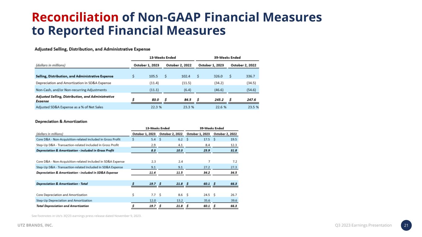 UTZ BRANDS, INC. 20 Reconciliation of Non-GAAP Financial Measures to Reported Financial Measures Q3 2023 Earnings Presentation See footnotes in Utz’s 3Q’23 earnings press release dated November 9, 2023.