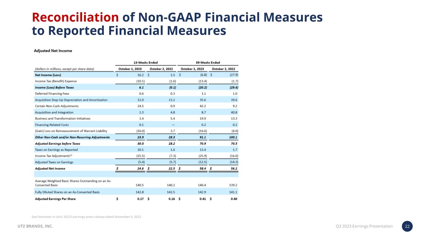 UTZ BRANDS, INC. 21 Reconciliation of Non-GAAP Financial Measures to Reported Financial Measures Q3 2023 Earnings Presentation See footnotes in Utz’s 3Q’23 earnings press release dated November 9, 2023.