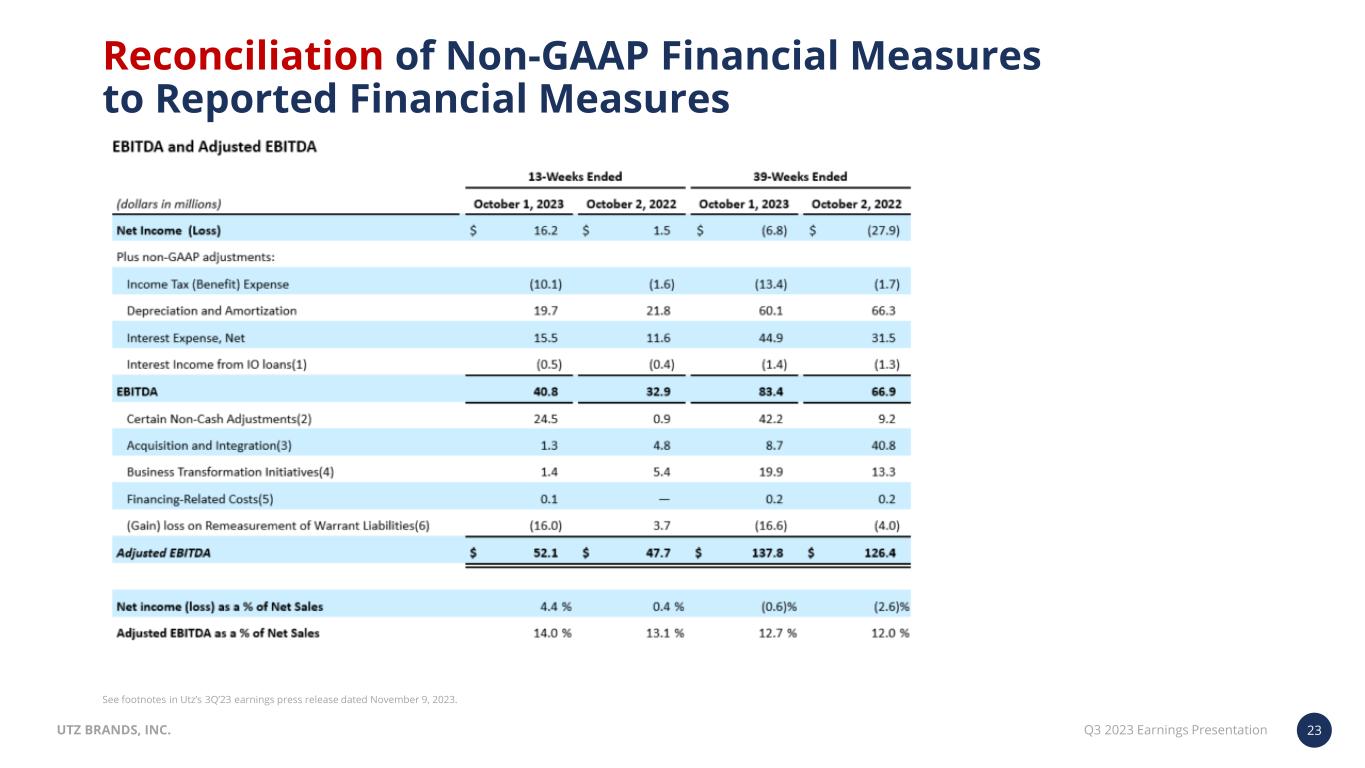 UTZ BRANDS, INC. 22 Reconciliation of Non-GAAP Financial Measures to Reported Financial Measures Q3 2023 Earnings Presentation See footnotes in Utz’s 3Q’23 earnings press release dated November 9, 2023.