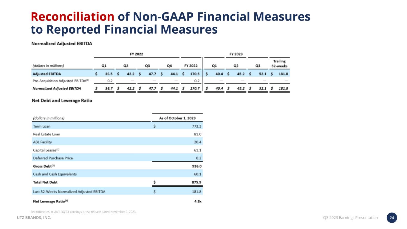 UTZ BRANDS, INC. 23 Reconciliation of Non-GAAP Financial Measures to Reported Financial Measures Q3 2023 Earnings Presentation See footnotes in Utz’s 3Q’23 earnings press release dated November 9, 2023.