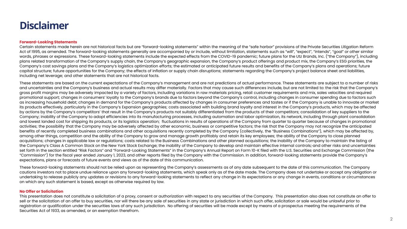 Disclaimer 2 Forward-Looking Statements Certain statements made herein are not historical facts but are “forward-looking statements” within the meaning of the “safe harbor” provisions of the Private Securities Litigation Reform Act of 1995, as amended. The forward-looking statements generally are accompanied by or include, without limitation, statements such as “will”, “expect”, “intends”, “goal” or other similar words, phrases or expressions. These forward-looking statements include the expected effects from the COVID-19 pandemic; future plans for the Utz Brands, Inc. (“the Company”), including plans related transformation of the Company’s supply chain, the Company’s geographic expansion, the Company’s product offerings and product mix, the Company’s ESG priorities, the Company’s cost savings plans and the Company’s logistics optimization efforts; the estimated or anticipated future results and benefits of the Company’s plans and operations; future capital structure; future opportunities for the Company; the effects of inflation or supply chain disruptions; statements regarding the Company’s project balance sheet and liabilities, including net leverage; and other statements that are not historical facts. These statements are based on the current expectations of the Company’s management and are not predictions of actual performance. These statements are subject to a number of risks and uncertainties and the Company’s business and actual results may differ materially. Factors that may cause such differences include, but are not limited to: the risk that the Company’s gross profit margins may be adversely impacted by a variety of factors, including variations in raw materials pricing, retail customer requirements and mix, sales velocities and required promotional support; changes in consumers’ loyalty to the Company’s brands due to factors beyond the Company’s control, including changes in consumer spending due to factors such as increasing household debt; changes in demand for the Company’s products affected by changes in consumer preferences and tastes or if the Company is unable to innovate or market its products effectively, particularly in the Company’s Expansion geographies; costs associated with building brand loyalty and interest in the Company’s products, which may be affected by actions by the Company’s competitors’ that result in the Company’s products not suitably differentiated from the products of their competitors; consolidation of key suppliers to the Company; inability of the Company to adopt efficiencies into its manufacturing processes, including automation and labor optimization, its network, including through plant consolidation and lowest landed cost for shipping its products, or its logistics operation; fluctuations in results of operations of the Company from quarter to quarter because of changes in promotional activities; the possibility that the Company may be adversely affected by other economic, business or competitive factors; the risk that the Company may not recognize the anticipated benefits of recently completed business combinations and other acquisitions recently completed by the Company (collectively, the “Business Combinations”), which may be affected by, among other things, competition and the ability of the Company to grow and manage growth profitably and retain its key employees; the ability of the Company to close planned acquisitions; changes in applicable law or regulations; costs related to the Business Combinations and other planned acquisitions; the inability of the Company to maintain the listing of the Company’s Class A Common Stock on the New York Stock Exchange; the inability of the Company to develop and maintain effective internal controls; and other risks and uncertainties set forth in the section entitled “Risk Factors” and “Forward-Looking Statements” in the Company’s Annual Report on Form 10-K filed with the U.S. Securities and Exchange Commission (the “Commission”) for the fiscal year ended January 1, 2023, and other reports filed by the Company with the Commission. In addition, forward-looking statements provide the Company’s expectations, plans or forecasts of future events and views as of the date of this communication. These forward-looking statements should not be relied upon as representing the Company’s assessments as of any date subsequent to the date of this communication. The Company cautions investors not to place undue reliance upon any forward-looking statements, which speak only as of the date made. The Company does not undertake or accept any obligation or undertaking to release publicly any updates or revisions to any forward-looking statements to reflect any change in its expectations or any change in events, conditions or circumstances on which any such statement is based, except as otherwise required by law. No Offer or Solicitation This presentation does not constitute a solicitation of a proxy, consent or authorization with respect to any securities of the Company. This presentation also does not constitute an offer to sell or the solicitation of an offer to buy securities, nor will there be any sale of securities in any state or jurisdiction in which such offer, solicitation or sale would be unlawful prior to registration or qualification under the securities laws of any such jurisdiction. No offering of securities will be made except by means of a prospectus meeting the requirements of the Securities Act of 1933, as amended, or an exemption therefrom.
