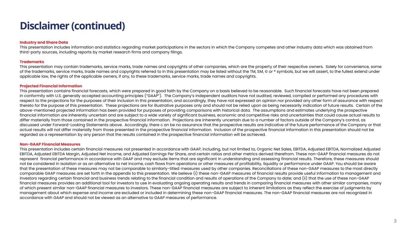 Disclaimer (continued) 3 Industry and Share Data This presentation includes information and statistics regarding market participations in the sectors in which the Company competes and other industry data which was obtained from third-party sources, including reports by market research firms and company filings. Trademarks This presentation may contain trademarks, service marks, trade names and copyrights of other companies, which are the property of their respective owners. Solely for convenience, some of the trademarks, service marks, trade names and copyrights referred to in this presentation may be listed without the TM, SM, © or ® symbols, but we will assert, to the fullest extend under applicable law, the rights of the applicable owners, if any, to these trademarks, service marks, trade names and copyrights. Projected Financial Information This presentation contains financial forecasts, which were prepared in good faith by the Company on a basis believed to be reasonable. Such financial forecasts have not been prepared in conformity with U.S. generally accepted accounting principles (“GAAP”). The Company’s independent auditors have not audited, reviewed, compiled or performed any procedures with respect to the projections for the purposes of their inclusion in this presentation, and accordingly, they have not expressed an opinion nor provided any other form of assurance with respect thereto for the purpose of this presentation. These projections are for illustrative purposes only and should not be relied upon as being necessarily indication of future results. Certain of the above-mentioned projected information has been provided for purposes of providing comparisons with historical data. The assumptions and estimates underlying the prospective financial information are inherently uncertain and are subject to a wide variety of significant business, economic and competitive risks and uncertainties that could cause actual results to differ materially from those contained in the prospective financial information. Projections are inherently uncertain due to a number of factors outside of the Company’s control, as discussed under Forward-Looking Statements above. Accordingly, there c an be no assurance that the prospective results are indicative of the future performance of the Company or that actual results will not differ materially from those presented in the prospective financial information. Inclusion of the prospective financial information in this presentation should not be regarded as a representation by any person that the results contained in the prospective financial information will be achieved. Non-GAAP Financial Measures This presentation includes certain financial measures not presented in accordance with GAAP, including, but not limited to, Organic Net Sales, EBITDA, Adjusted EBITDA, Normalized Adjusted EBITDA, Adjusted EBITDA Margin, Adjusted Net Income, and Adjusted Earnings Per Share, and certain ratios and other metrics derived therefrom. These non-GAAP financial measures do not represent financial performance in accordance with GAAP and may exclude items that are significant in understanding and assessing financial results. Therefore, these measures should not be considered in isolation or as an alternative to net income, cash flows from operations or other measures of profitability, liquidity or performance under GAAP. You should be aware that the presentation of these measures may not be comparable to similarly-titled measures used by other companies. Reconciliations of these non-GAAP measures to the most directly comparable GAAP measures are set forth in the appendix to this presentation. We believe (i) these non-GAAP measures of financial results provide useful information to management and investors regarding certain financial and business trends relating to the financial condition and results of operations of the Company to date; and (ii) that the use of these non-GAAP financial measures provides an additional tool for investors to use in evaluating ongoing operating results and trends in comparing financial measures with other similar companies, many of which present similar non-GAAP financial measures to investors. These non-GAAP financial measures are subject to inherent limitations as they reflect the exercise of judgments by management about which expense and income are excluded or included in determining these non-GAAP financial measures. The non-GAAP financial measures are not recognized in accordance with GAAP and should not be viewed as an alternative to GAAP measures of performance.