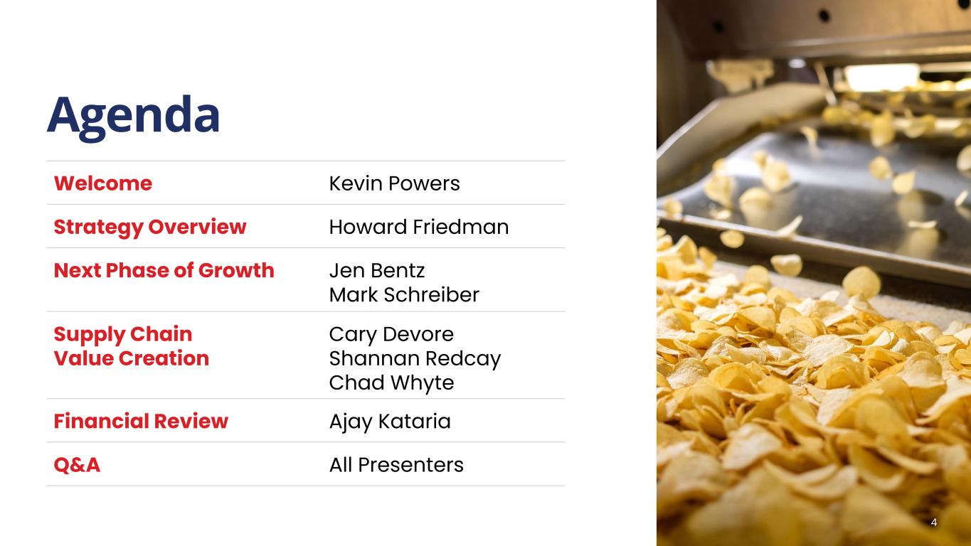 Disclaimer 2 Forward-Looking Statements Certain statements made herein are not historical facts but are “forward-looking statements” within the meaning of the “safe harbor” provisions of the Private Securities Litigation Reform Act of 1995, as amended. The forward-looking statements generally are accompanied by or include, without limitation, statements such as “will”, “expect”, “intends”, “goal” or other similar words, phrases or expressions. These forward-looking statements include the expected effects from the COVID-19 pandemic; future plans for the Utz Brands, Inc. (“the Company”), including plans related transformation of the Company’s supply chain, the Company’s geographic expansion, the Company’s product offerings and product mix, the Company’s ESG priorities, the Company’s cost savings plans and the Company’s logistics optimization efforts; the estimated or anticipated future results and benefits of the Company’s plans and operations; future capital structure; future opportunities for the Company; the effects of inflation or supply chain disruptions; statements regarding the Company’s project balance sheet and liabilities, including net leverage; and other statements that are not historical facts. These statements are based on the current expectations of the Company’s management and are not predictions of actual performance. These statements are subject to a number of risks and uncertainties and the Company’s business and actual results may differ materially. Factors that may cause such differences include, but are not limited to: the risk that the Company’s gross profit margins may be adversely impacted by a variety of factors, including variations in raw materials pricing, retail customer requirements and mix, sales velocities and required promotional support; changes in consumers’ loyalty to the Company’s brands due to factors beyond the Company’s control, including changes in consumer spending due to factors such as increasing household debt; changes in demand for the Company’s products affected by changes in consumer preferences and tastes or if the Company is unable to innovate or market its products effectively, particularly in the Company’s Expansion geographies; costs associated with building brand loyalty and interest in the Company’s products, which may be affected by actions by the Company’s competitors’ that result in the Company’s products not suitably differentiated from the products of their competitors; consolidation of key suppliers to the Company; inability of the Company to adopt efficiencies into its manufacturing processes, including automation and labor optimization, its network, including through plant consolidation and lowest landed cost for shipping its products, or its logistics operation; fluctuations in results of operations of the Company from quarter to quarter because of changes in promotional activities; the possibility that the Company may be adversely affected by other economic, business or competitive factors; the risk that the Company may not recognize the anticipated benefits of recently completed business combinations and other acquisitions recently completed by the Company (collectively, the “Business Combinations”), which may be affected by, among other things, competition and the ability of the Company to grow and manage growth profitably and retain its key employees; the ability of the Company to close planned acquisitions; changes in applicable law or regulations; costs related to the Business Combinations and other planned acquisitions; the inability of the Company to maintain the listing of the Company’s Class A Common Stock on the New York Stock Exchange; the inability of the Company to develop and maintain effective internal controls; and other risks and uncertainties set forth in the section entitled “Risk Factors” and “Forward-Looking Statements” in the Company’s Annual Report on Form 10-K filed with the U.S. Securities and Exchange Commission (the “Commission”) for the fiscal year ended January 1, 2023, and other reports filed by the Company with the Commission. In addition, forward-looking statements provide the Company’s expectations, plans or forecasts of future events and views as of the date of this communication. These forward-looking statements should not be relied upon as representing the Company’s assessments as of any date subsequent to the date of this communication. The Company cautions investors not to place undue reliance upon any forward-looking statements, which speak only as of the date made. The Company does not undertake or accept any obligation or undertaking to release publicly any updates or revisions to any forward-looking statements to reflect any change in its expectations or any change in events, conditions or circumstances on which any such statement is based, except as otherwise required by law. No Offer or Solicitation This presentation does not constitute a solicitation of a proxy, consent or authorization with respect to any securities of the Company. This presentation also does not constitute an offer to sell or the solicitation of an offer to buy securities, nor will there be any sale of securities in any state or jurisdiction in which such offer, solicitation or sale would be unlawful prior to registration or qualification under the securities laws of any such jurisdiction. No offering of securities will be made except by means of a prospectus meeting the requirements of the Securities Act of 1933, as amended, or an exemption therefrom.