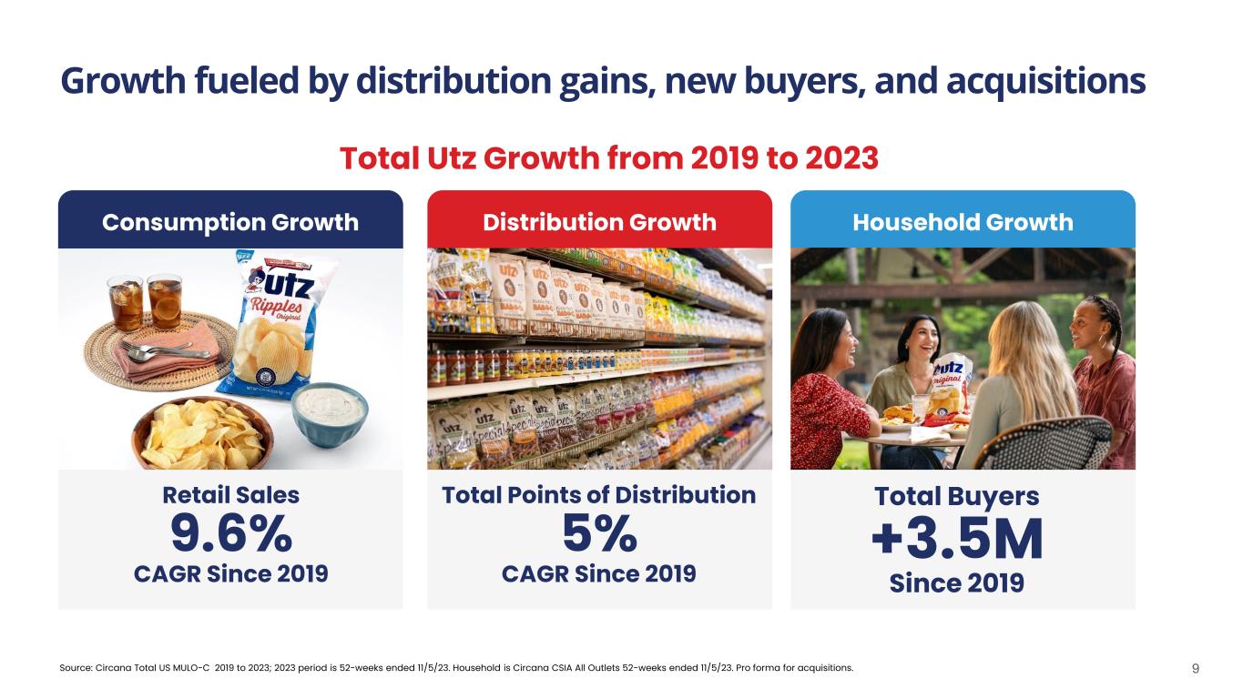 Disclaimer 2 Forward-Looking Statements Certain statements made herein are not historical facts but are “forward-looking statements” within the meaning of the “safe harbor” provisions of the Private Securities Litigation Reform Act of 1995, as amended. The forward-looking statements generally are accompanied by or include, without limitation, statements such as “will”, “expect”, “intends”, “goal” or other similar words, phrases or expressions. These forward-looking statements include the expected effects from the COVID-19 pandemic; future plans for the Utz Brands, Inc. (“the Company”), including plans related transformation of the Company’s supply chain, the Company’s geographic expansion, the Company’s product offerings and product mix, the Company’s ESG priorities, the Company’s cost savings plans and the Company’s logistics optimization efforts; the estimated or anticipated future results and benefits of the Company’s plans and operations; future capital structure; future opportunities for the Company; the effects of inflation or supply chain disruptions; statements regarding the Company’s project balance sheet and liabilities, including net leverage; and other statements that are not historical facts. These statements are based on the current expectations of the Company’s management and are not predictions of actual performance. These statements are subject to a number of risks and uncertainties and the Company’s business and actual results may differ materially. Factors that may cause such differences include, but are not limited to: the risk that the Company’s gross profit margins may be adversely impacted by a variety of factors, including variations in raw materials pricing, retail customer requirements and mix, sales velocities and required promotional support; changes in consumers’ loyalty to the Company’s brands due to factors beyond the Company’s control, including changes in consumer spending due to factors such as increasing household debt; changes in demand for the Company’s products affected by changes in consumer preferences and tastes or if the Company is unable to innovate or market its products effectively, particularly in the Company’s Expansion geographies; costs associated with building brand loyalty and interest in the Company’s products, which may be affected by actions by the Company’s competitors’ that result in the Company’s products not suitably differentiated from the products of their competitors; consolidation of key suppliers to the Company; inability of the Company to adopt efficiencies into its manufacturing processes, including automation and labor optimization, its network, including through plant consolidation and lowest landed cost for shipping its products, or its logistics operation; fluctuations in results of operations of the Company from quarter to quarter because of changes in promotional activities; the possibility that the Company may be adversely affected by other economic, business or competitive factors; the risk that the Company may not recognize the anticipated benefits of recently completed business combinations and other acquisitions recently completed by the Company (collectively, the “Business Combinations”), which may be affected by, among other things, competition and the ability of the Company to grow and manage growth profitably and retain its key employees; the ability of the Company to close planned acquisitions; changes in applicable law or regulations; costs related to the Business Combinations and other planned acquisitions; the inability of the Company to maintain the listing of the Company’s Class A Common Stock on the New York Stock Exchange; the inability of the Company to develop and maintain effective internal controls; and other risks and uncertainties set forth in the section entitled “Risk Factors” and “Forward-Looking Statements” in the Company’s Annual Report on Form 10-K filed with the U.S. Securities and Exchange Commission (the “Commission”) for the fiscal year ended January 1, 2023, and other reports filed by the Company with the Commission. In addition, forward-looking statements provide the Company’s expectations, plans or forecasts of future events and views as of the date of this communication. These forward-looking statements should not be relied upon as representing the Company’s assessments as of any date subsequent to the date of this communication. The Company cautions investors not to place undue reliance upon any forward-looking statements, which speak only as of the date made. The Company does not undertake or accept any obligation or undertaking to release publicly any updates or revisions to any forward-looking statements to reflect any change in its expectations or any change in events, conditions or circumstances on which any such statement is based, except as otherwise required by law. No Offer or Solicitation This presentation does not constitute a solicitation of a proxy, consent or authorization with respect to any securities of the Company. This presentation also does not constitute an offer to sell or the solicitation of an offer to buy securities, nor will there be any sale of securities in any state or jurisdiction in which such offer, solicitation or sale would be unlawful prior to registration or qualification under the securities laws of any such jurisdiction. No offering of securities will be made except by means of a prospectus meeting the requirements of the Securities Act of 1933, as amended, or an exemption therefrom.