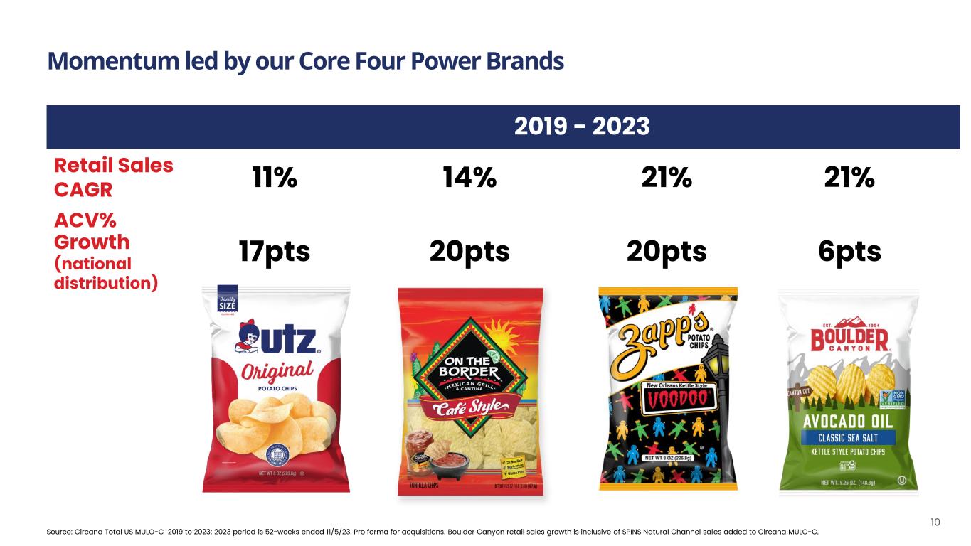 Distribution Growth Total Points of Distribution 5% CAGR Since 2019 Household Growth Total Buyers +3.5M Since 2019 Consumption Growth Retail Sales 9.6% CAGR Since 2019 Growth fueled by distribution gains, new buyers, and acquisitions 9 Total Utz Growth from 2019 to 2023 Source: Circana Total US MULO-C 2019 to 2023; 2023 period is 52-weeks ended 11/5/23. Household is Circana CSIA All Outlets 52-weeks ended 11/5/23. Pro forma for acquisitions.