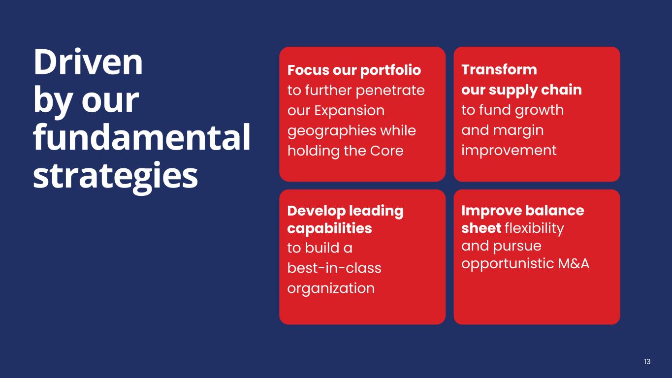 Driven by our fundamental strategies 13 Focus our portfolio to further penetrate our Expansion geographies while holding the Core Transform our supply chain to fund growth and margin improvement Develop leading capabilities to build a best-in-class organization Improve balance sheet flexibility and pursue opportunistic M&A