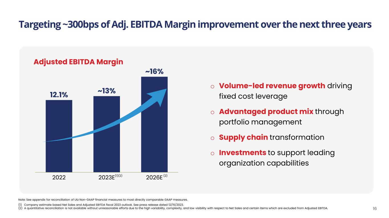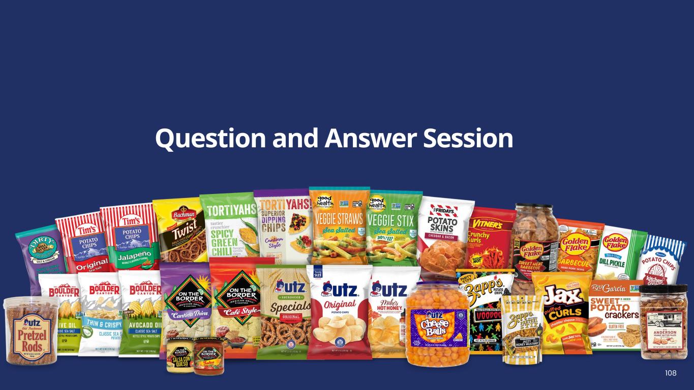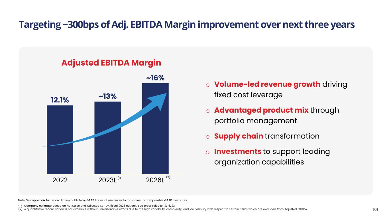 Targeting ~300bps of Adj. EBITDA Margin improvement over next three years 101 2022 2023E 2026E 12.1% ~13% ~16% (2) o Volume-led revenue growth driving fixed cost leverage o Advantaged product mix through portfolio management o Supply chain transformation o Investments to support leading organization capabilities Note: See appendix for reconciliation of Utz Non-GAAP financial measures to most directly comparable GAAP measures. (1) Company estimate based on Net Sales and Adjusted EBITDA fiscal 2023 outlook. See press release 12/15/23. (2) A quantitative reconciliation is not available without unreasonable efforts due to the high variability, complexity, and low visibility with respect to certain items which are excluded from Adjusted EBITDA. (1) Adjusted EBITDA Margin