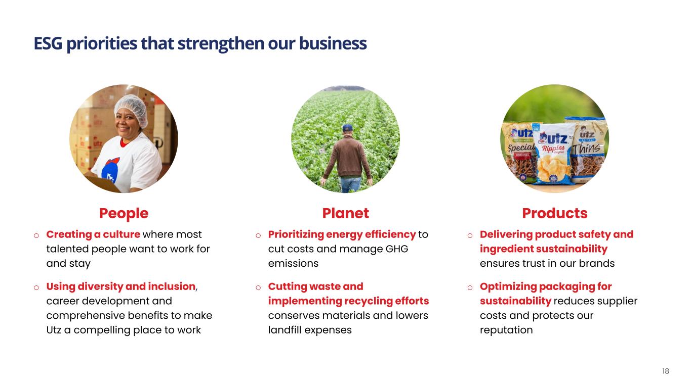 Disclaimer 2 Forward-Looking Statements Certain statements made herein are not historical facts but are “forward-looking statements” within the meaning of the “safe harbor” provisions of the Private Securities Litigation Reform Act of 1995, as amended. The forward-looking statements generally are accompanied by or include, without limitation, statements such as “will”, “expect”, “intends”, “goal” or other similar words, phrases or expressions. These forward-looking statements include the expected effects from the COVID-19 pandemic; future plans for the Utz Brands, Inc. (“the Company”), including plans related transformation of the Company’s supply chain, the Company’s geographic expansion, the Company’s product offerings and product mix, the Company’s ESG priorities, the Company’s cost savings plans and the Company’s logistics optimization efforts; the estimated or anticipated future results and benefits of the Company’s plans and operations; future capital structure; future opportunities for the Company; the effects of inflation or supply chain disruptions; statements regarding the Company’s project balance sheet and liabilities, including net leverage; and other statements that are not historical facts. These statements are based on the current expectations of the Company’s management and are not predictions of actual performance. These statements are subject to a number of risks and uncertainties and the Company’s business and actual results may differ materially. Factors that may cause such differences include, but are not limited to: the risk that the Company’s gross profit margins may be adversely impacted by a variety of factors, including variations in raw materials pricing, retail customer requirements and mix, sales velocities and required promotional support; changes in consumers’ loyalty to the Company’s brands due to factors beyond the Company’s control, including changes in consumer spending due to factors such as increasing household debt; changes in demand for the Company’s products affected by changes in consumer preferences and tastes or if the Company is unable to innovate or market its products effectively, particularly in the Company’s Expansion geographies; costs associated with building brand loyalty and interest in the Company’s products, which may be affected by actions by the Company’s competitors’ that result in the Company’s products not suitably differentiated from the products of their competitors; consolidation of key suppliers to the Company; inability of the Company to adopt efficiencies into its manufacturing processes, including automation and labor optimization, its network, including through plant consolidation and lowest landed cost for shipping its products, or its logistics operation; fluctuations in results of operations of the Company from quarter to quarter because of changes in promotional activities; the possibility that the Company may be adversely affected by other economic, business or competitive factors; the risk that the Company may not recognize the anticipated benefits of recently completed business combinations and other acquisitions recently completed by the Company (collectively, the “Business Combinations”), which may be affected by, among other things, competition and the ability of the Company to grow and manage growth profitably and retain its key employees; the ability of the Company to close planned acquisitions; changes in applicable law or regulations; costs related to the Business Combinations and other planned acquisitions; the inability of the Company to maintain the listing of the Company’s Class A Common Stock on the New York Stock Exchange; the inability of the Company to develop and maintain effective internal controls; and other risks and uncertainties set forth in the section entitled “Risk Factors” and “Forward-Looking Statements” in the Company’s Annual Report on Form 10-K filed with the U.S. Securities and Exchange Commission (the “Commission”) for the fiscal year ended January 1, 2023, and other reports filed by the Company with the Commission. In addition, forward-looking statements provide the Company’s expectations, plans or forecasts of future events and views as of the date of this communication. These forward-looking statements should not be relied upon as representing the Company’s assessments as of any date subsequent to the date of this communication. The Company cautions investors not to place undue reliance upon any forward-looking statements, which speak only as of the date made. The Company does not undertake or accept any obligation or undertaking to release publicly any updates or revisions to any forward-looking statements to reflect any change in its expectations or any change in events, conditions or circumstances on which any such statement is based, except as otherwise required by law. No Offer or Solicitation This presentation does not constitute a solicitation of a proxy, consent or authorization with respect to any securities of the Company. This presentation also does not constitute an offer to sell or the solicitation of an offer to buy securities, nor will there be any sale of securities in any state or jurisdiction in which such offer, solicitation or sale would be unlawful prior to registration or qualification under the securities laws of any such jurisdiction. No offering of securities will be made except by means of a prospectus meeting the requirements of the Securities Act of 1933, as amended, or an exemption therefrom.
