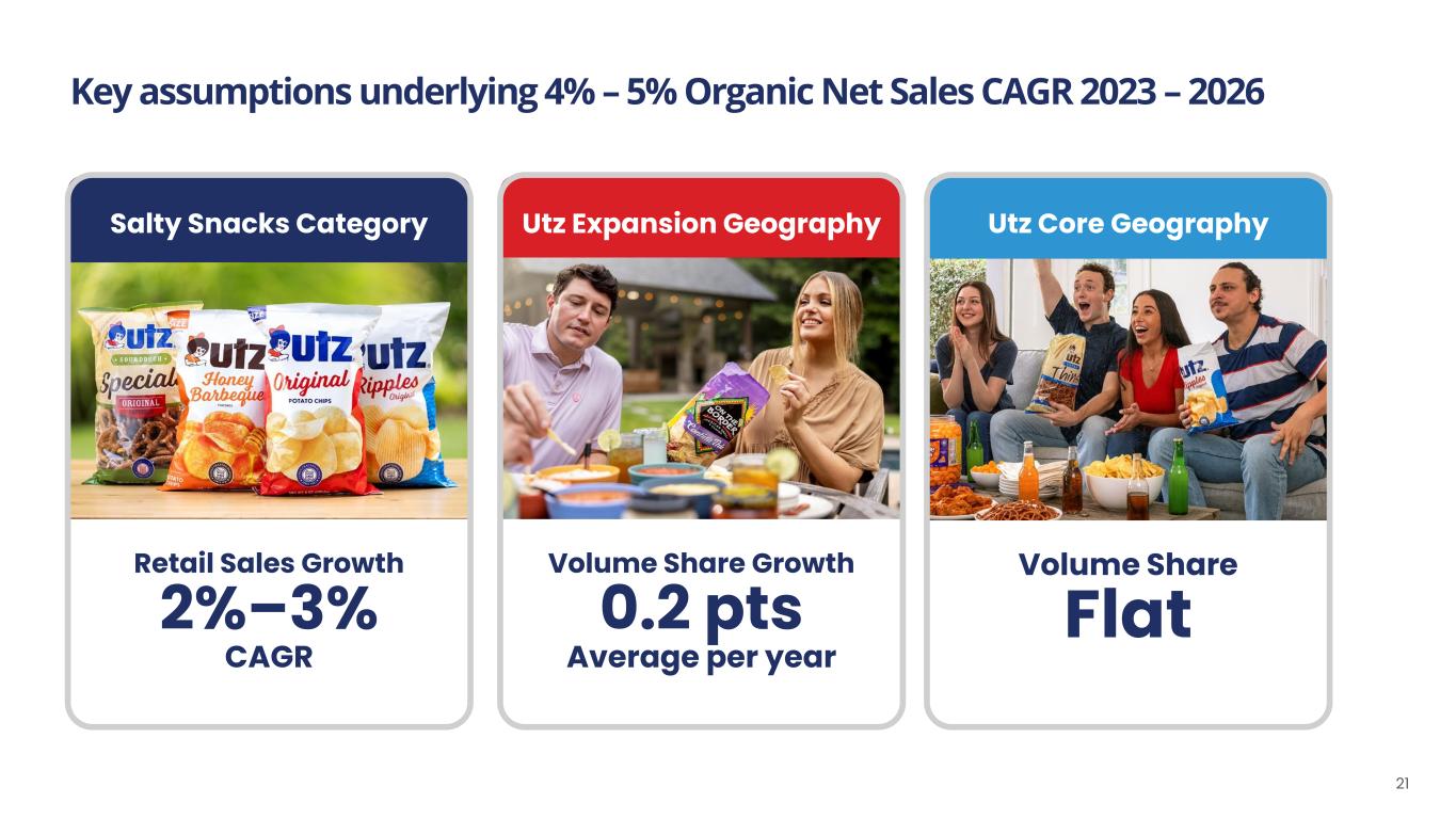 Utz Core GeographyUtz Expansion GeographySalty Snacks Category Retail Sales Growth 2%–3% CAGR Volume Share Flat Key assumptions underlying 4% – 5% Organic Net Sales CAGR 2023 – 2026 21 Volume Share Growth 0.2 pts Average per year