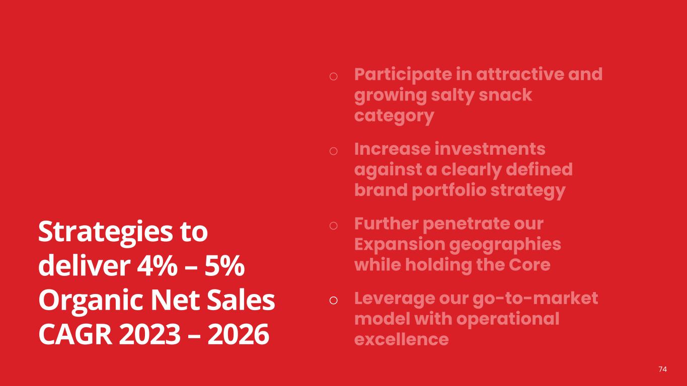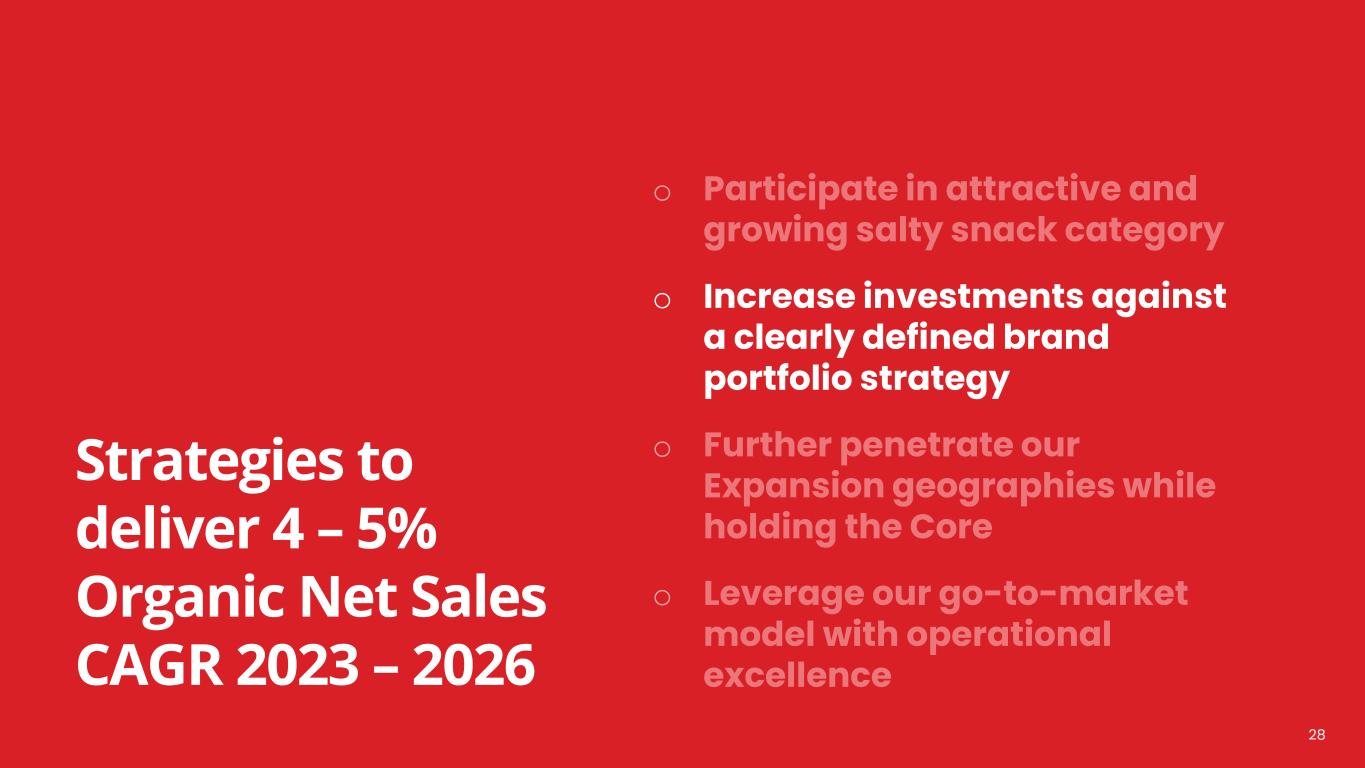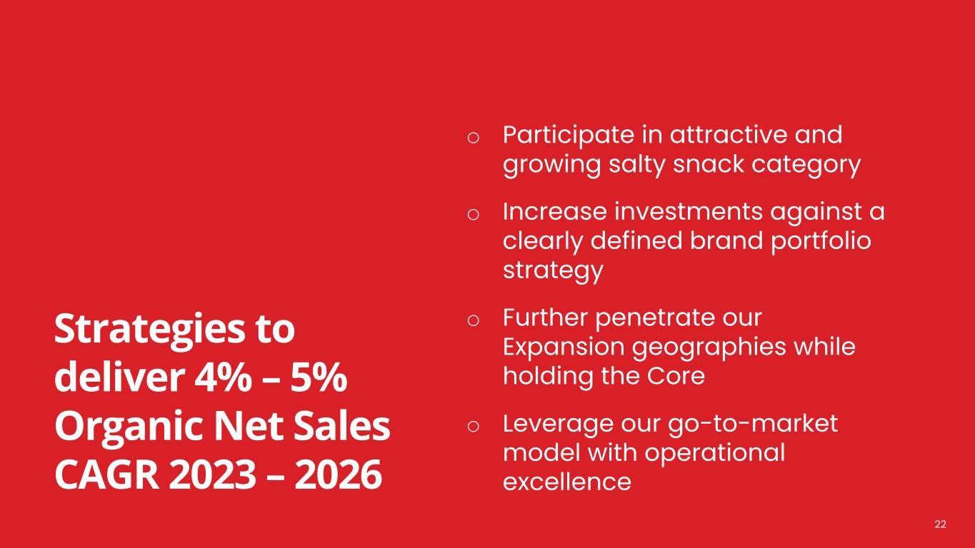 Strategies to deliver 4% – 5% Organic Net Sales CAGR 2023 – 2026 22 o Participate in attractive and growing salty snack category o Increase investments against a clearly defined brand portfolio strategy o Further penetrate our Expansion geographies while holding the Core o Leverage our go-to-market model with operational excellence